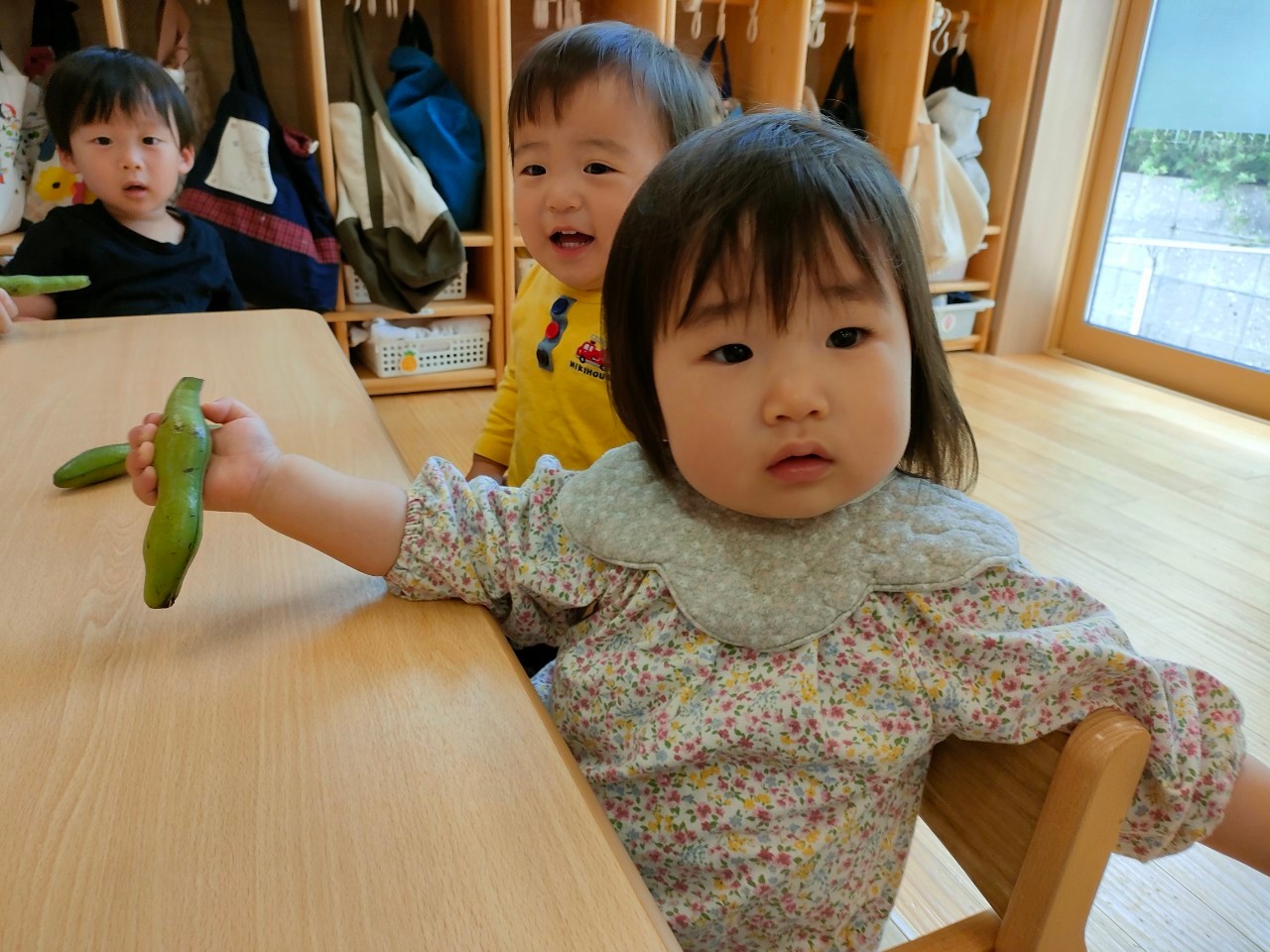 先日、2歳児クラスのあめ組さんたちが、そらまめくん(絵本:そらまめくんのベッドの主役)の