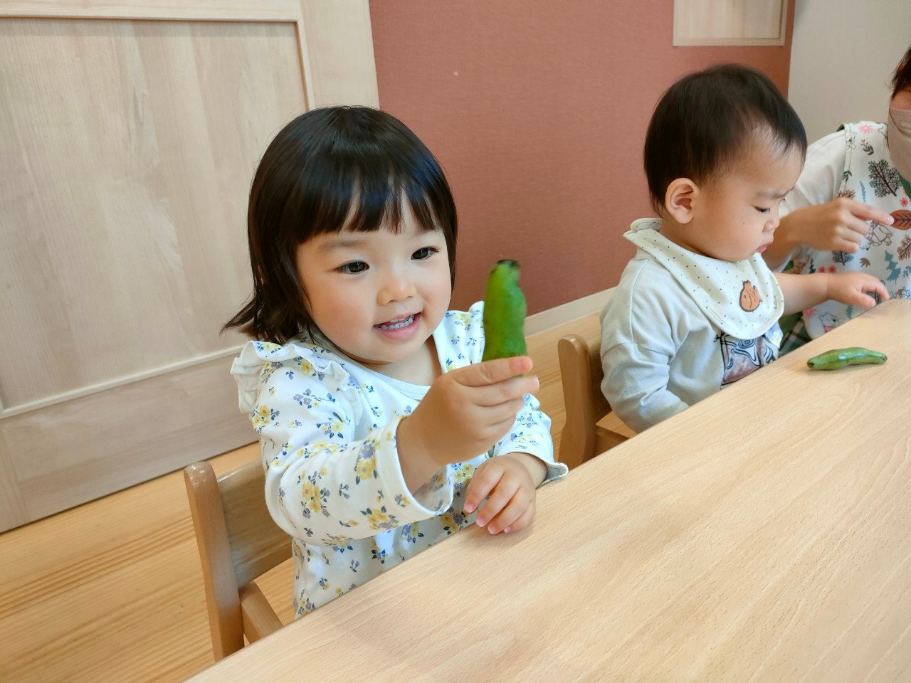1歳児クラスのだいち組さんたちは、初めて見たような顔をしたり、