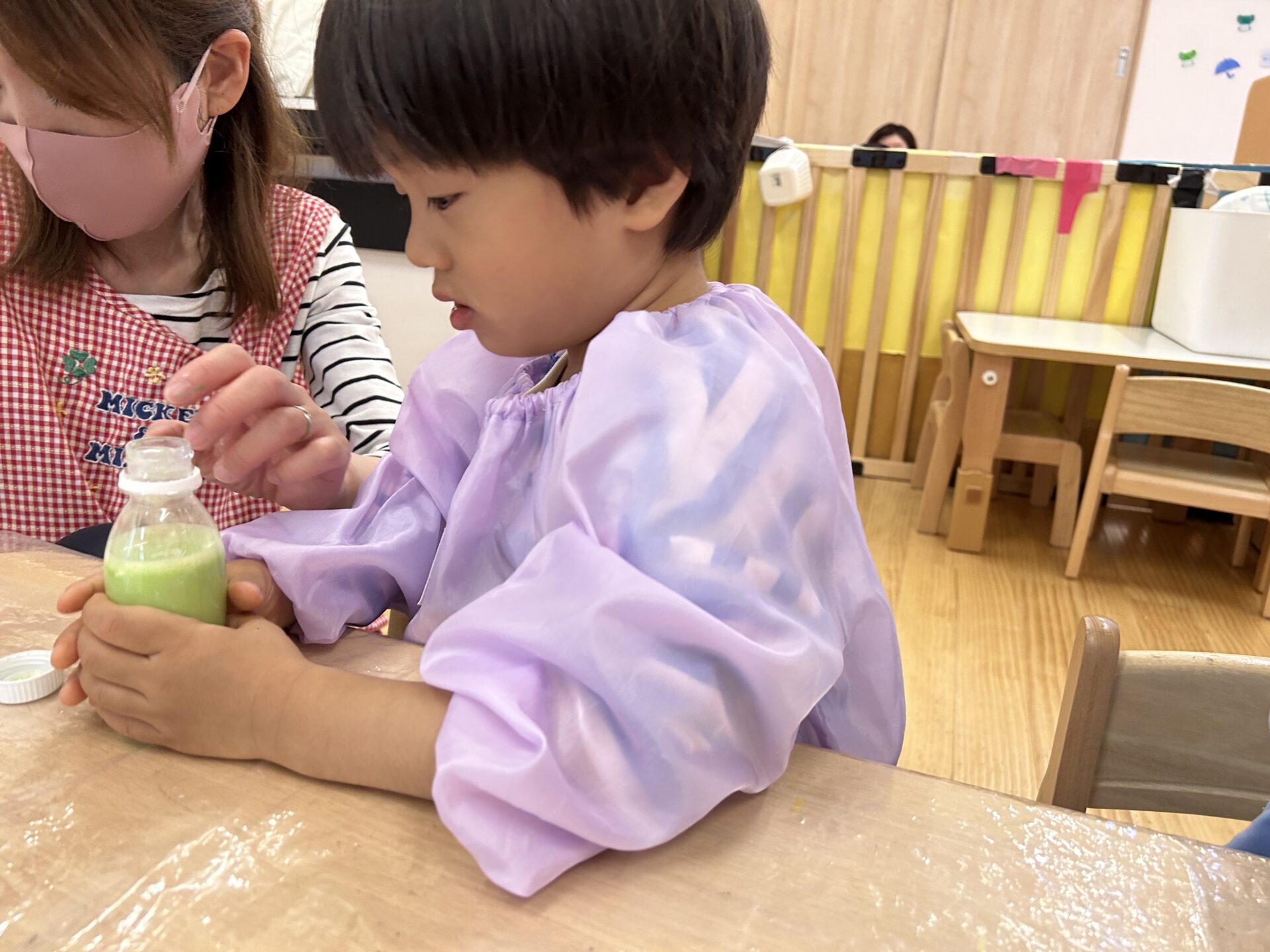 中には、灰色になったジュースを見て「これはぞうさんジュース」と、子どもならではの表現もあり、子ども同士で会話を楽しみながら過ごすことができました。