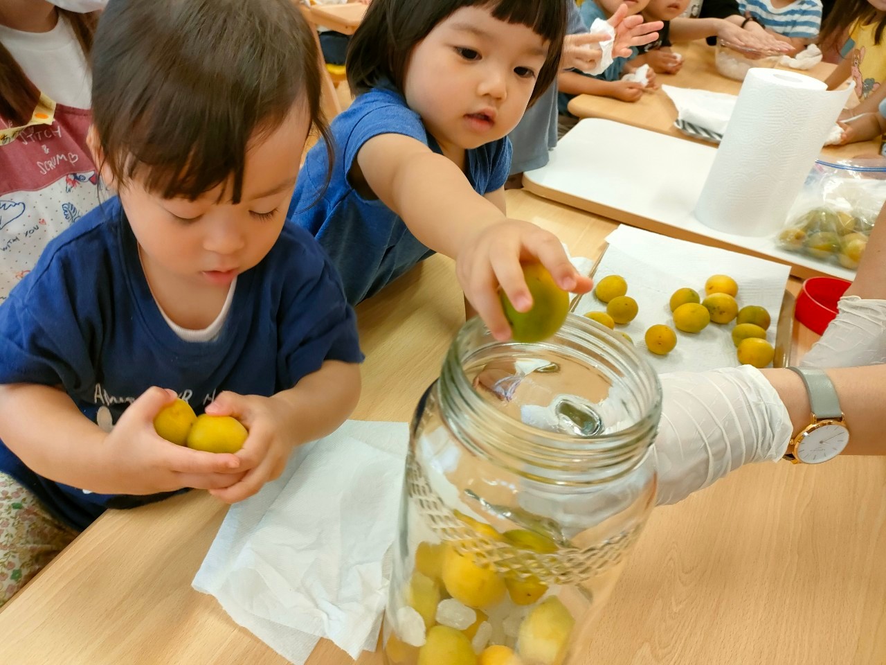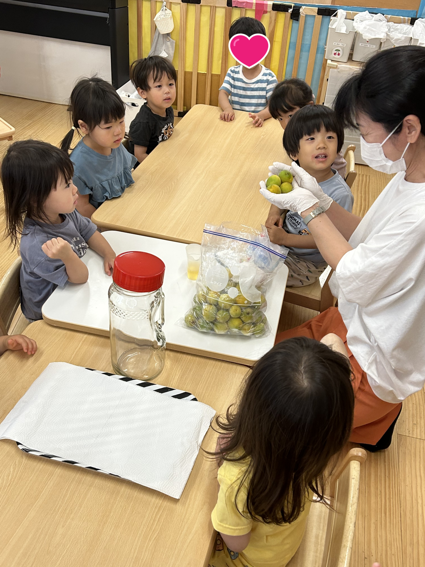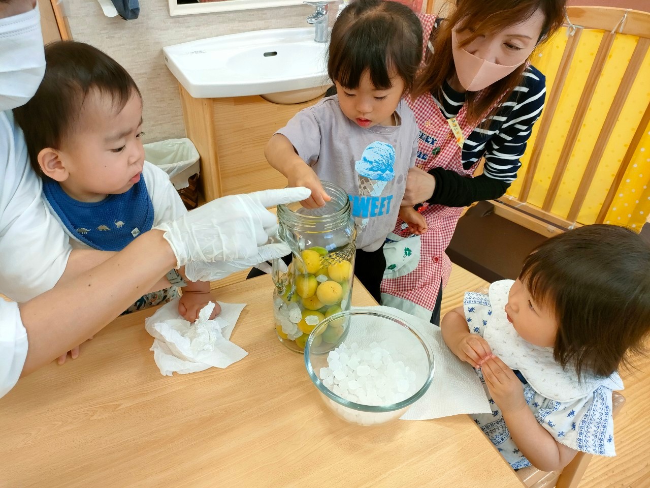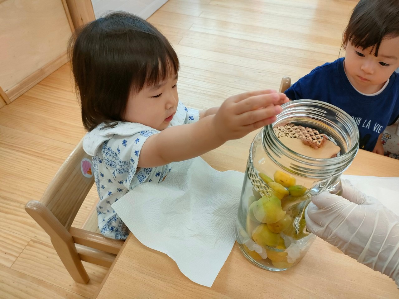 「今日は梅ジュースを作りたいので、瓶の中に梅を入れて欲しいんだけど、梅が濡れてたり、汚れてたりしたら、おいしい梅ジュースにならないから、きれいに拭いてね。」と伝えると、1粒ずつ丁寧に拭き、瓶に入れてくれました。