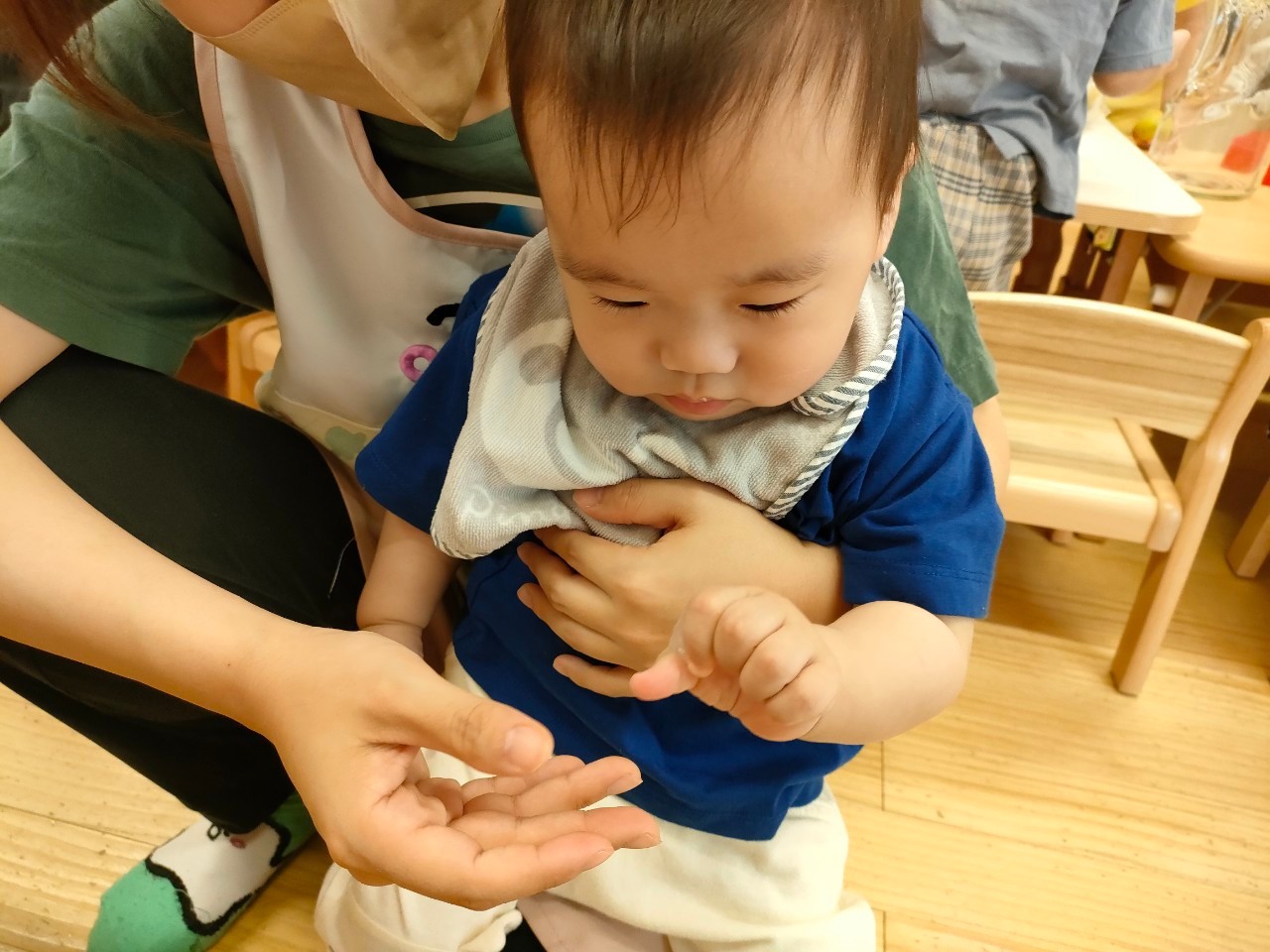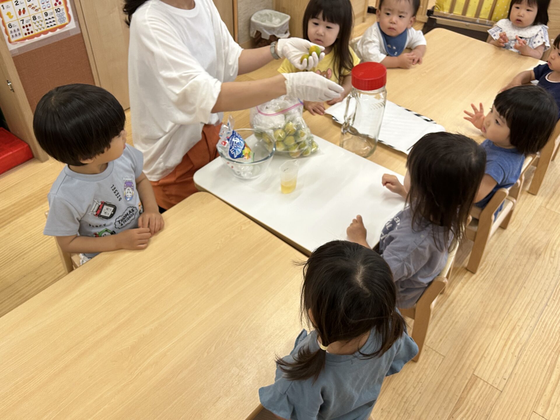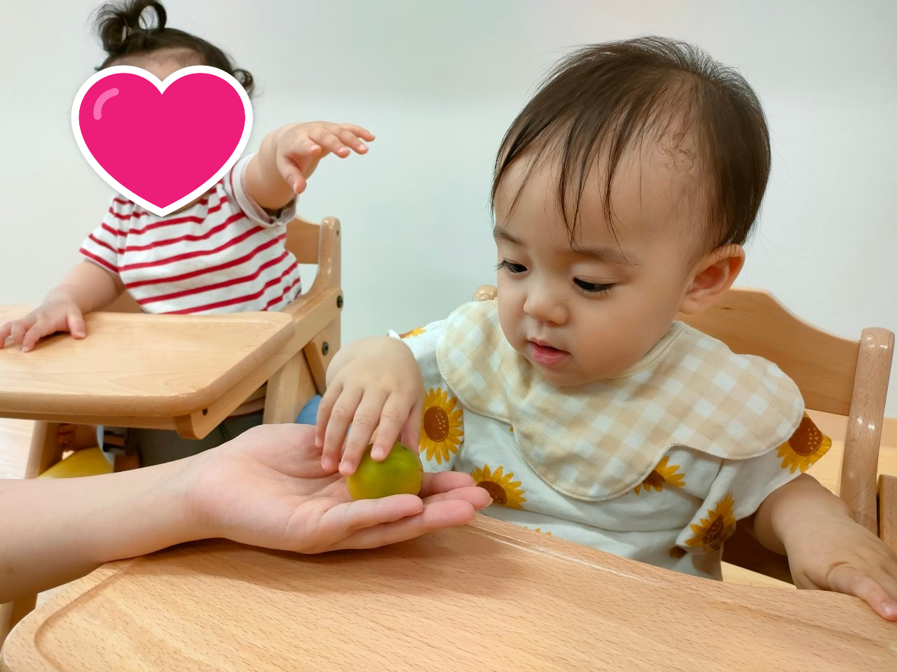 何とも言えない顔をする1歳児クラスのだいち組さん、「すっぱい(>_<)」と言葉で伝えることが出来る2歳児クラスのあめ組さんです。