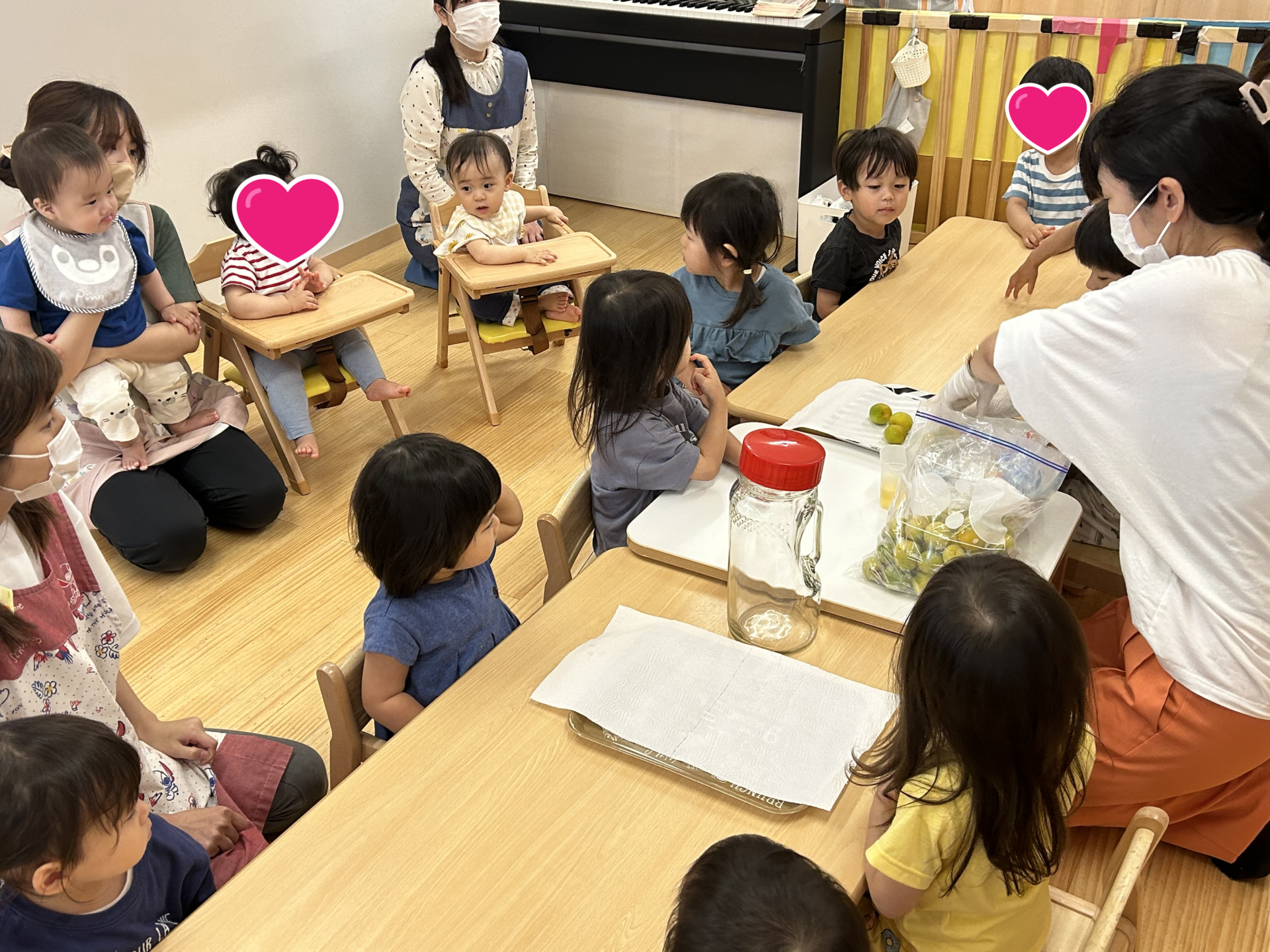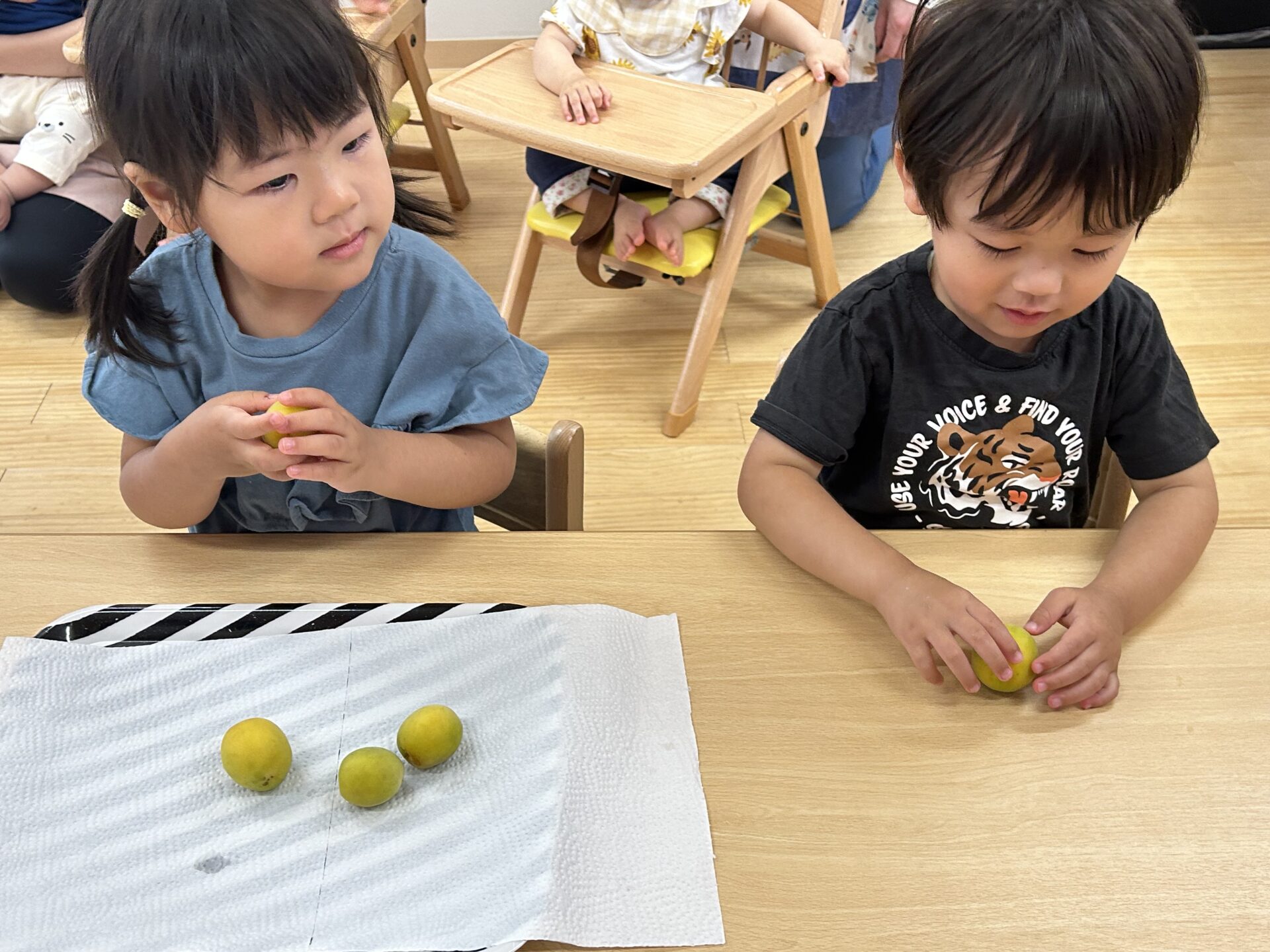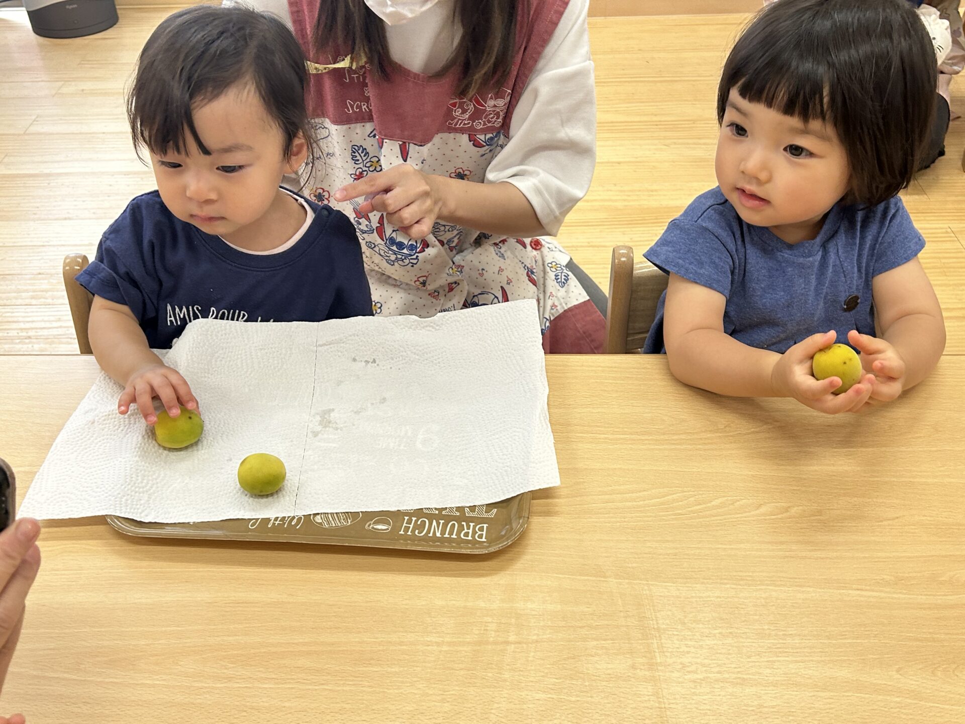 卵を割る時のように机に打ち付け、硬さを確かめてみたり、大切そうに手に持ち、まじまじとみつめてみたり、一斉に梅への探求が始まります。