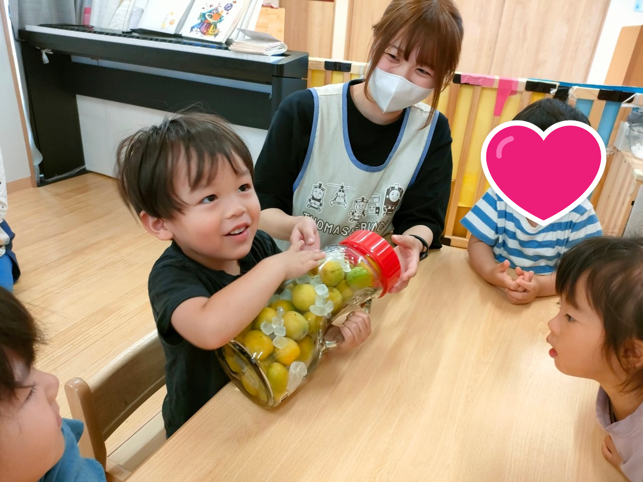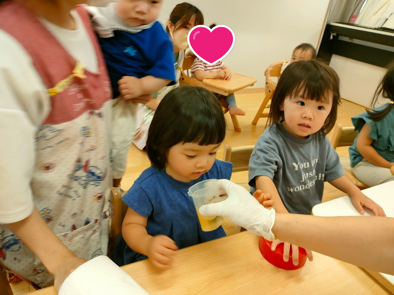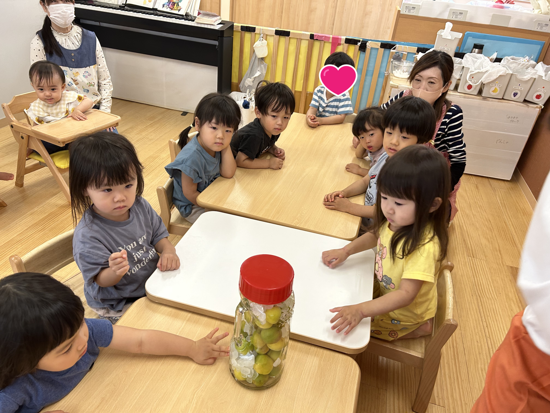 飲めるようになるまでは、まだまだ時間がかかることを伝えると残念そうでしたが、毎日、瓶を振ると少しずつジュースが出てくることも伝え、瓶のフリフリ係をあめ組のお当番さんに任命しました。