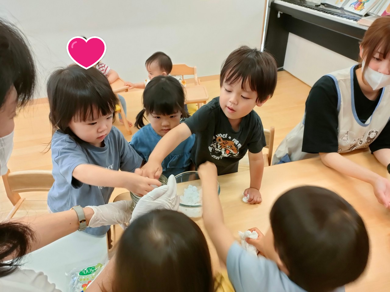 保育室内がさわやかな香りに包まれる中、今から何かが始まる!!と察知した子どもたちは、一目散に手を洗い、机のまわりに集まりました。