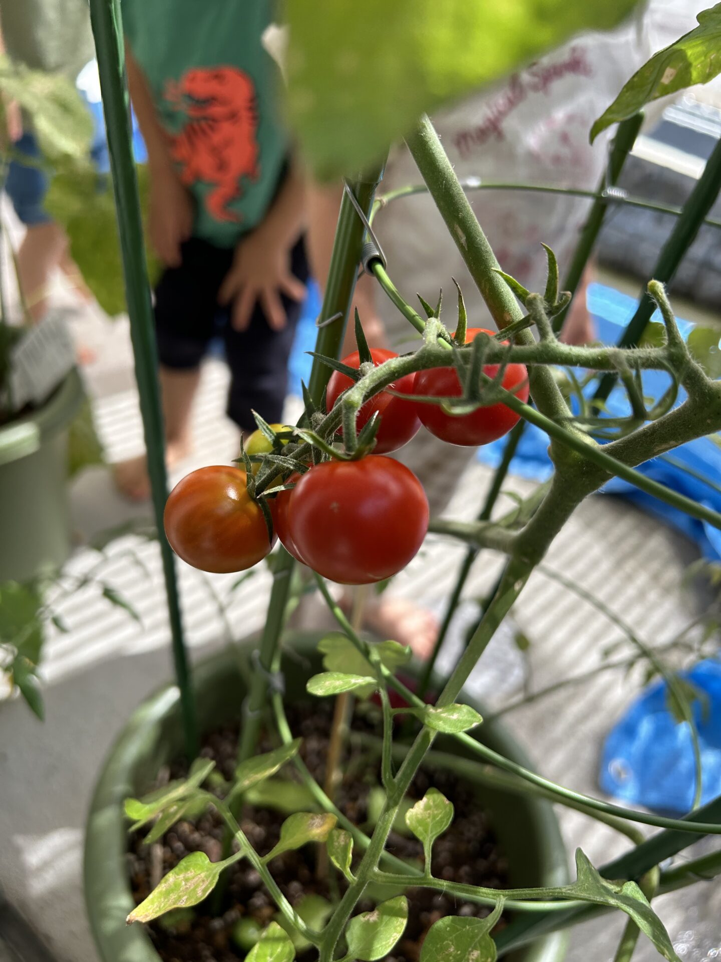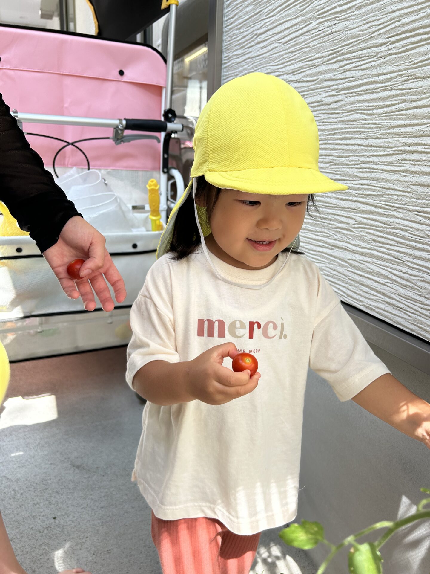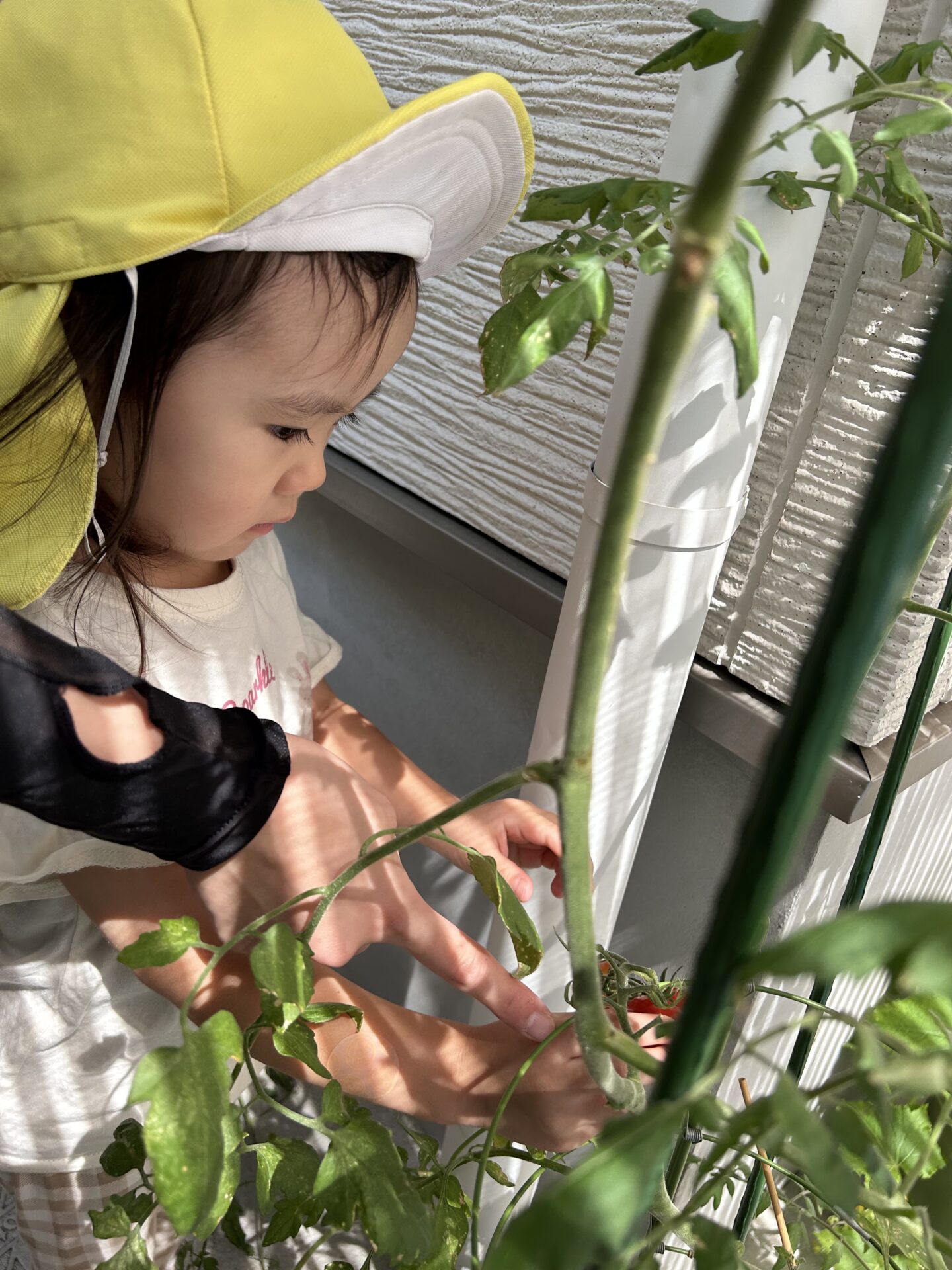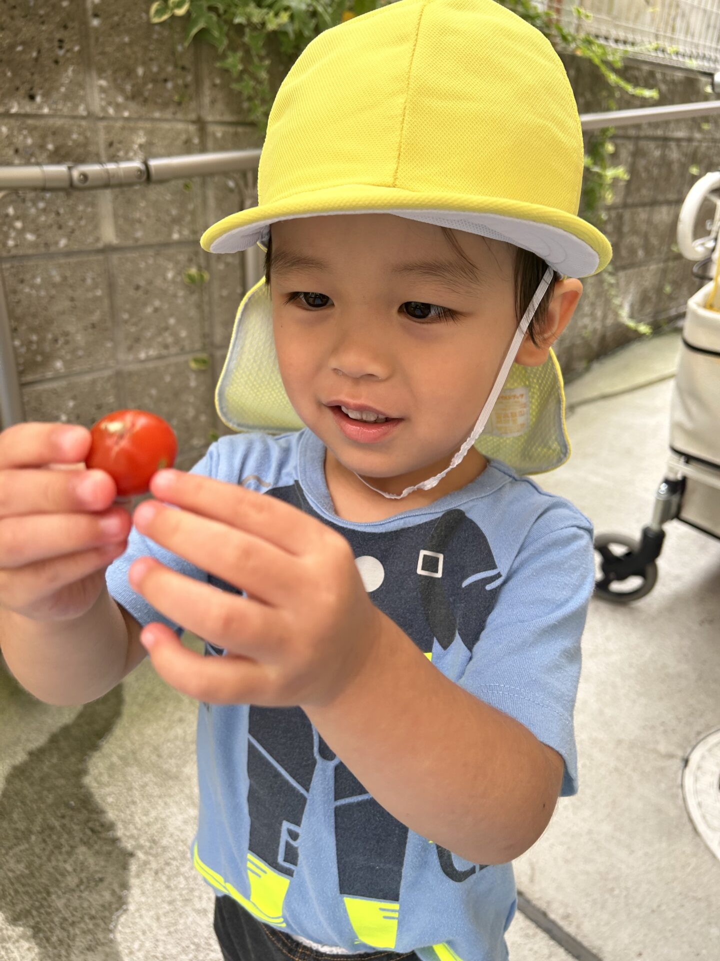 「しゅうかくしたい!!!」と、大好きな水遊びを行う前に、急遽トマトの収穫が始まりました。