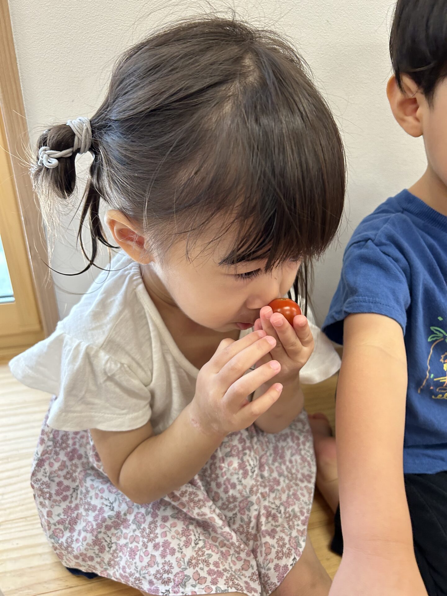 「たねがあるよ!」「トマトの皮つるつる~」と発見を喜んでいました。
