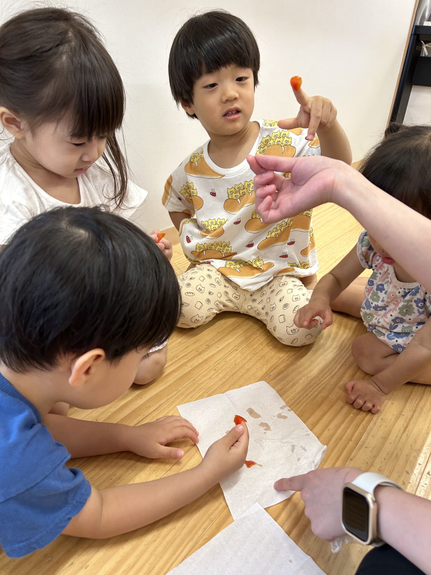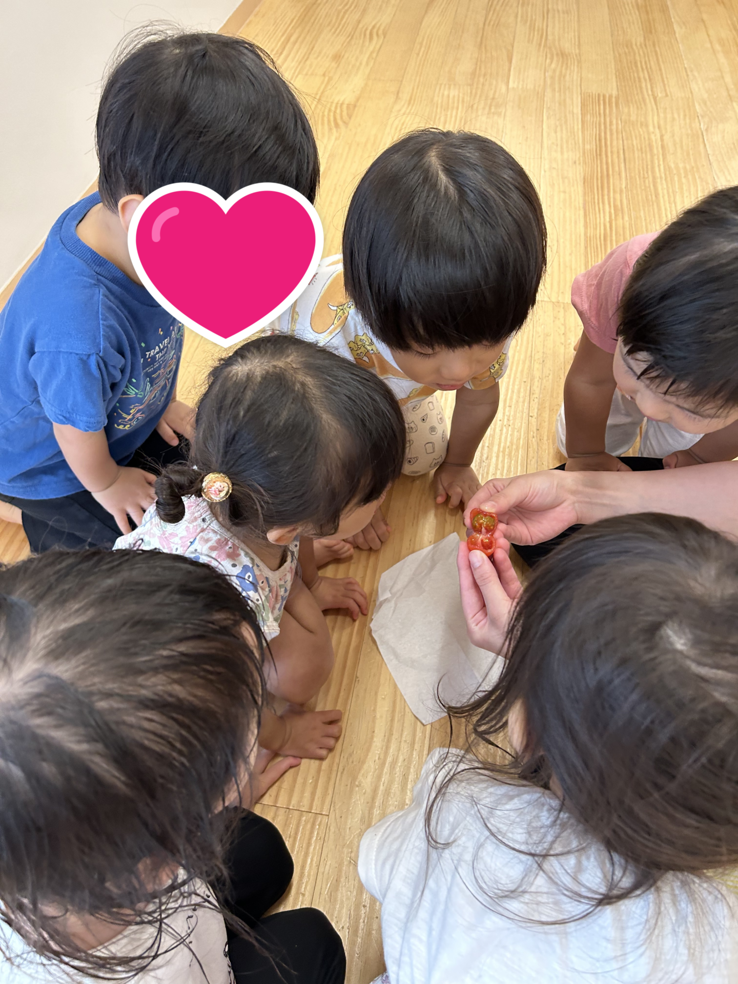 そして、水遊びをたっぷり楽しんだ後は、お部屋に戻ってトマトの観察会です。