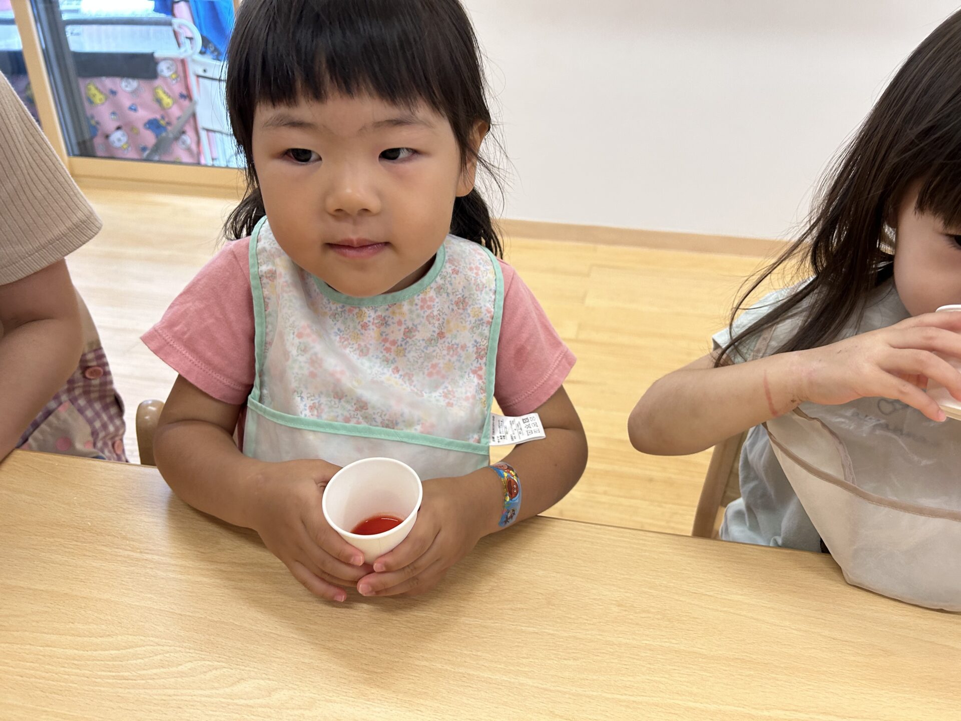 どんどん色が変わっていく様子をみて、「トマトジュースだ」と一人のお友だちが教えてくれると
