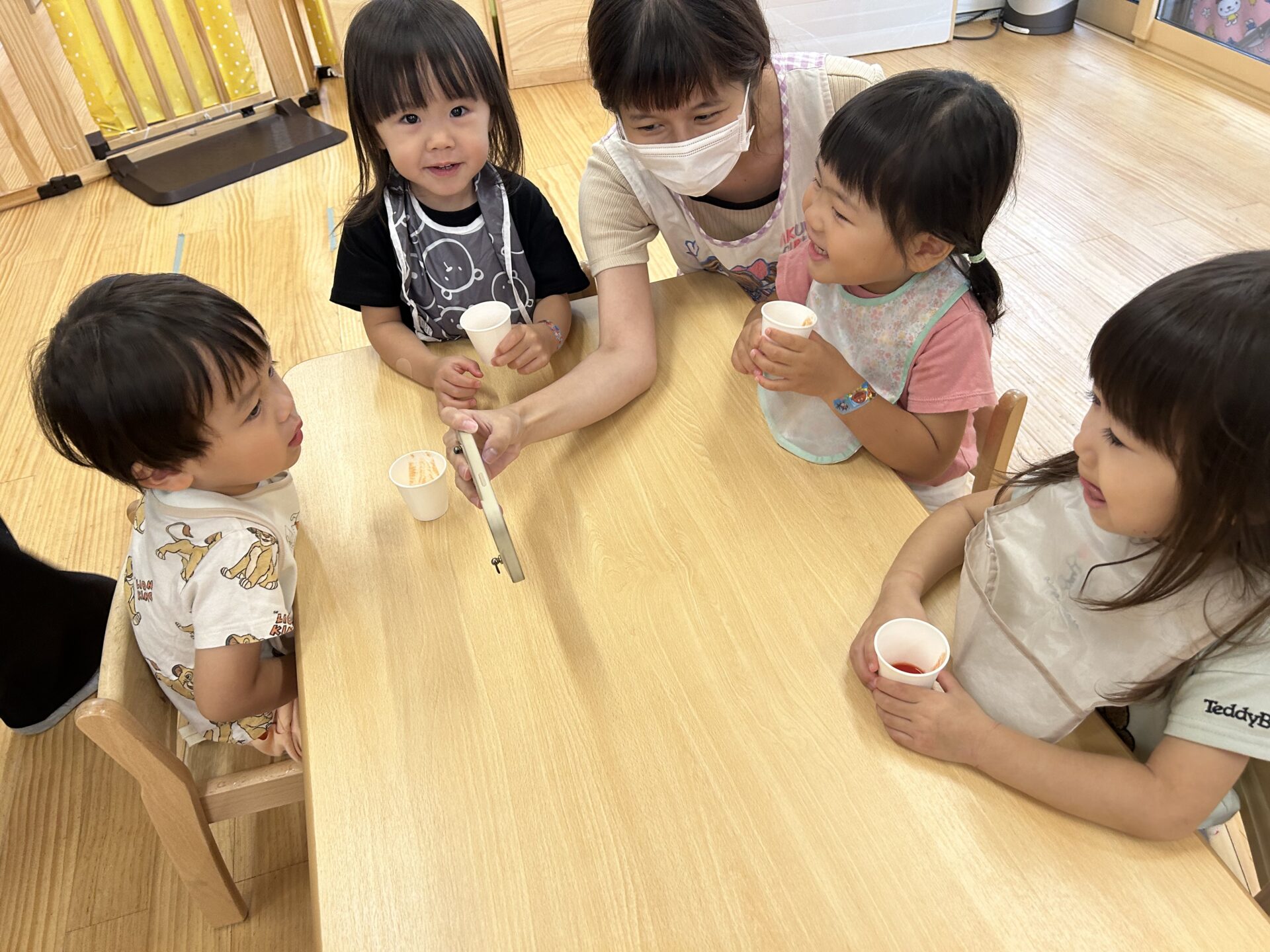 「あかいね」「なんか匂いがするね」「じゅーすになった」と、様々な感想を伝えてくれました。