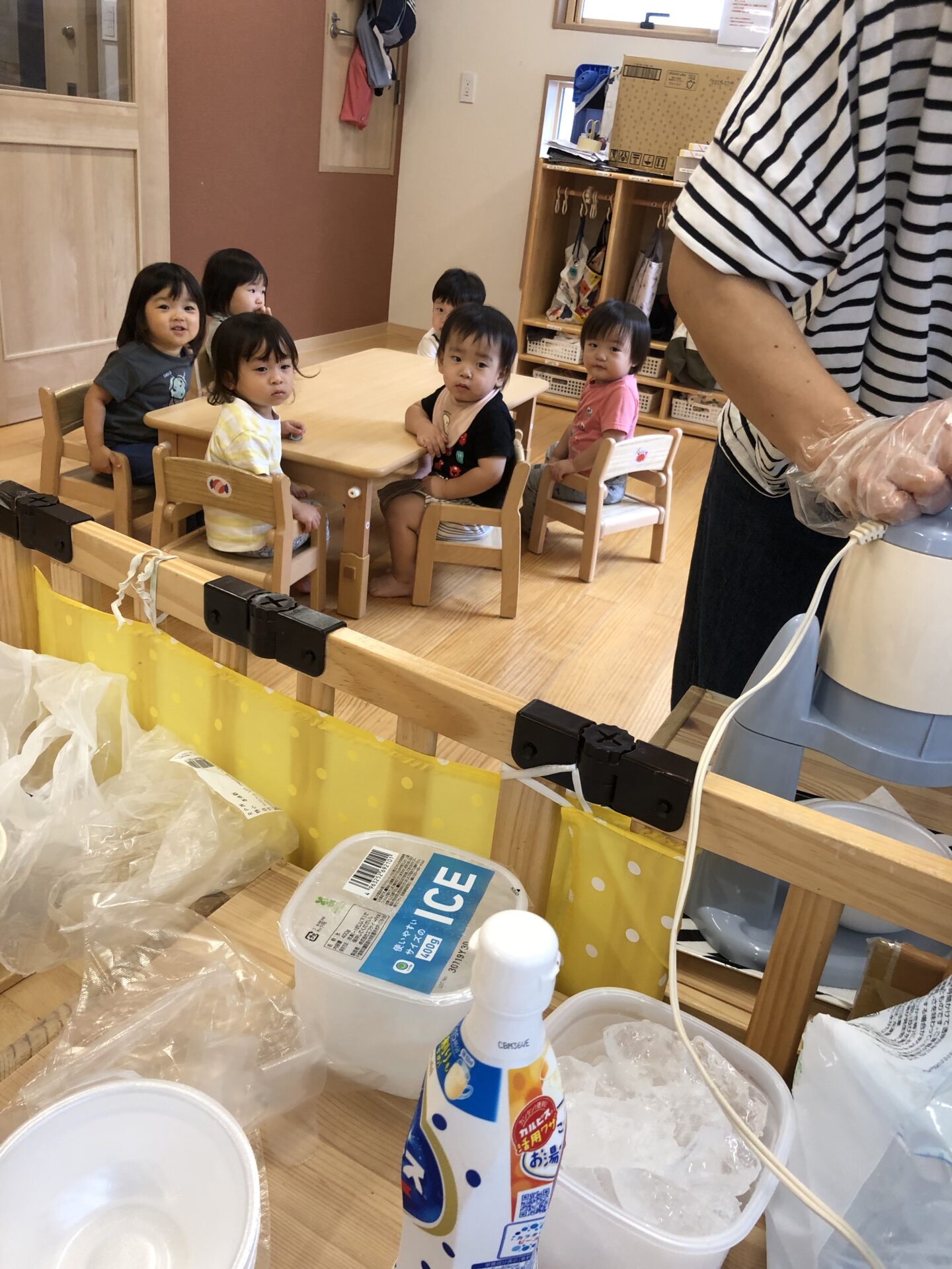 今年のあめ組さんは、0歳クラスのうみ組、1歳クラスのだいち組さんの為に、かき氷屋さんをしてくれます。