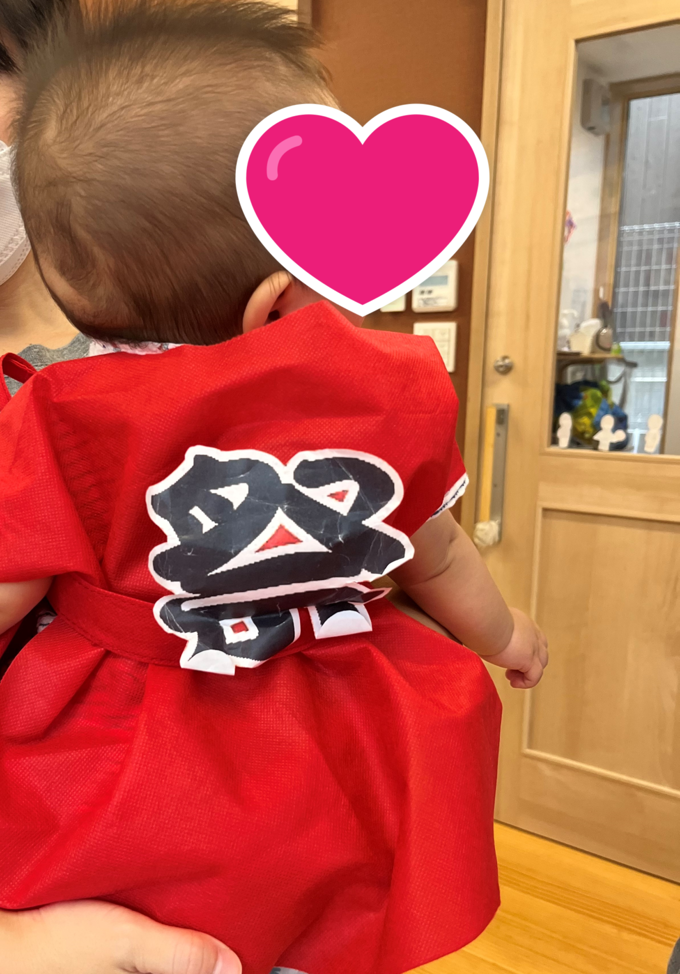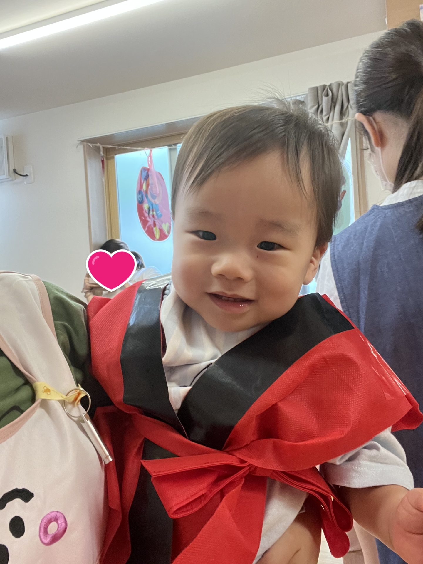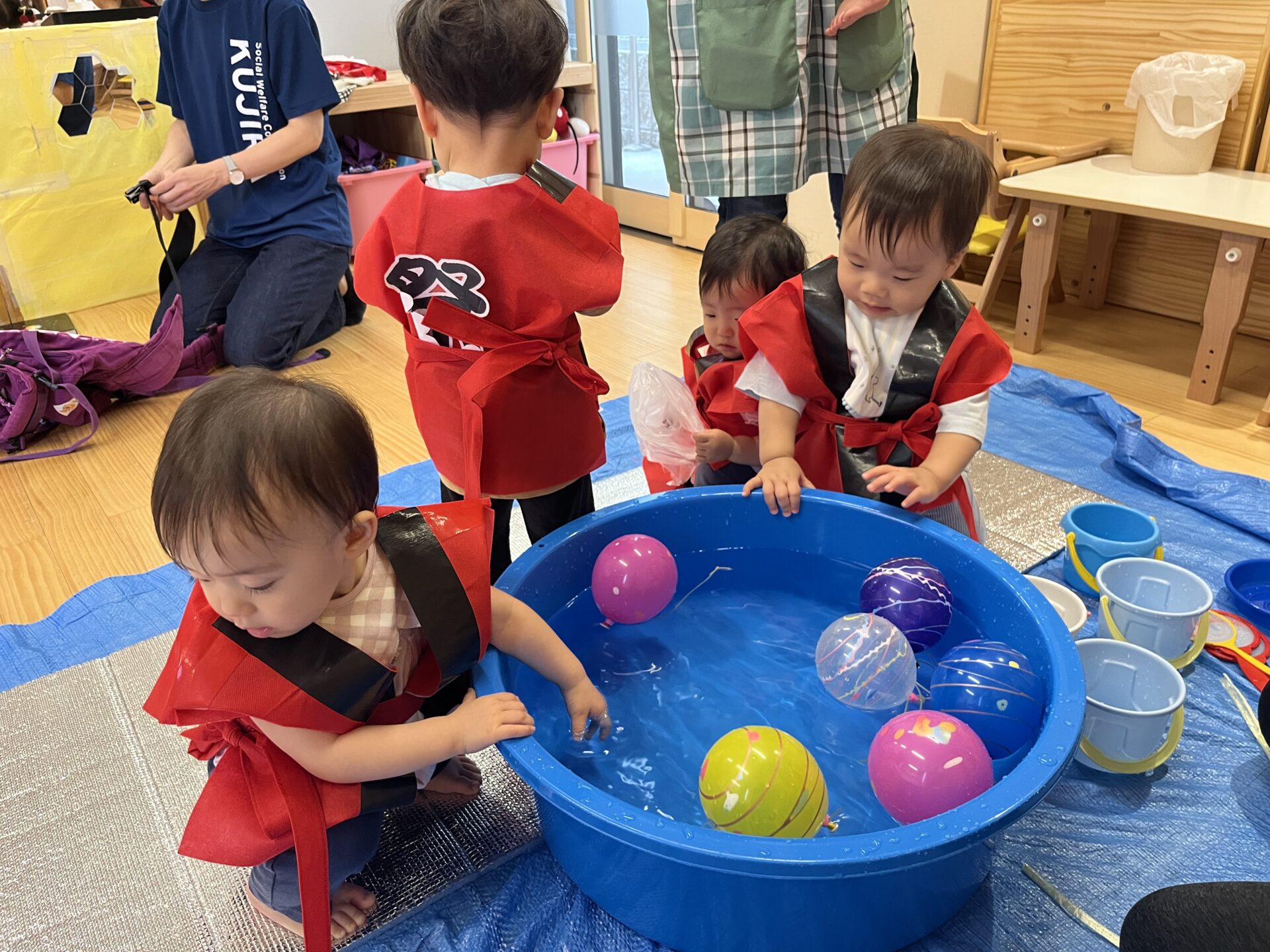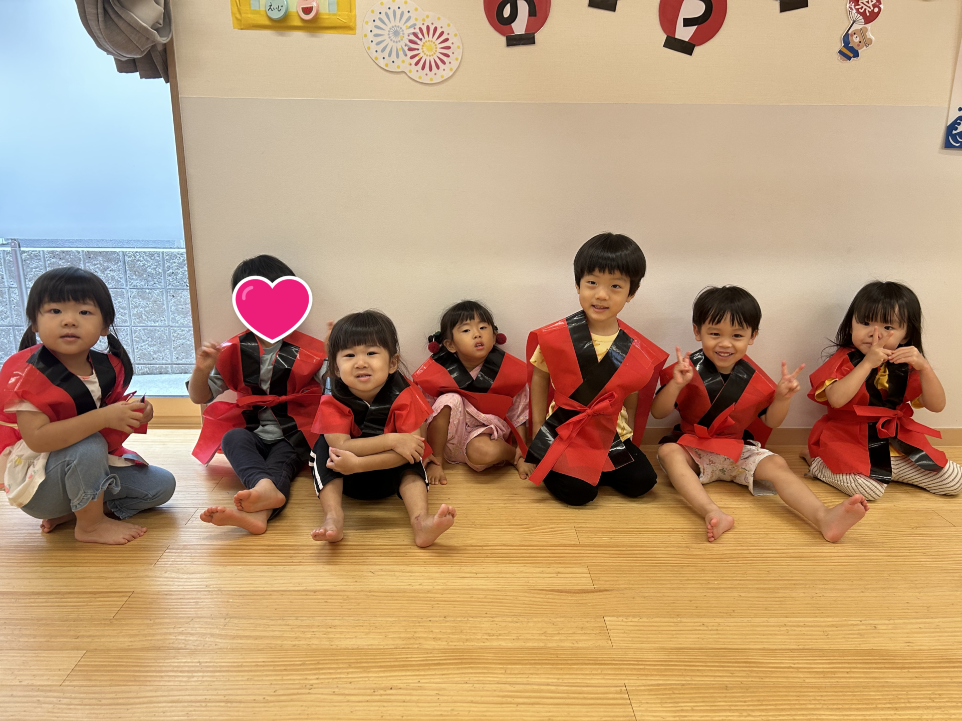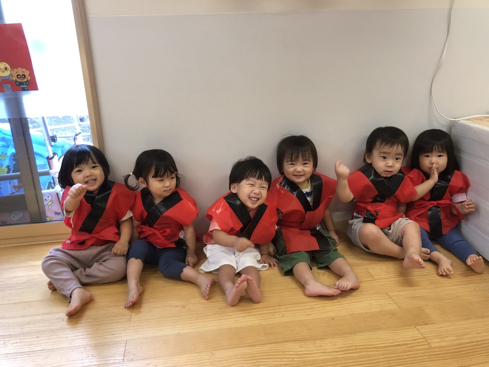 「はっぴだねぇ!」と1歳クラスのだいち組さんも、お祭り仕様の法被でテンションが上がっています♪