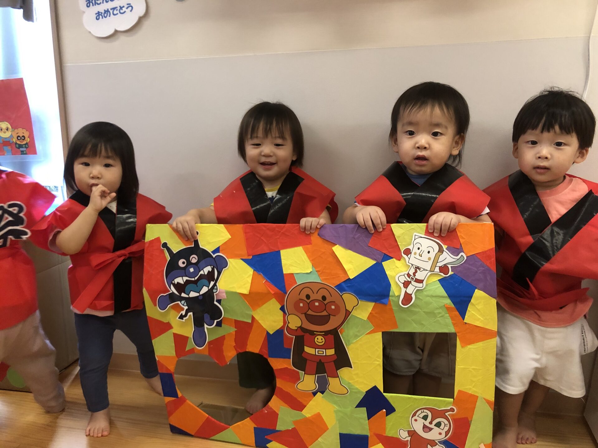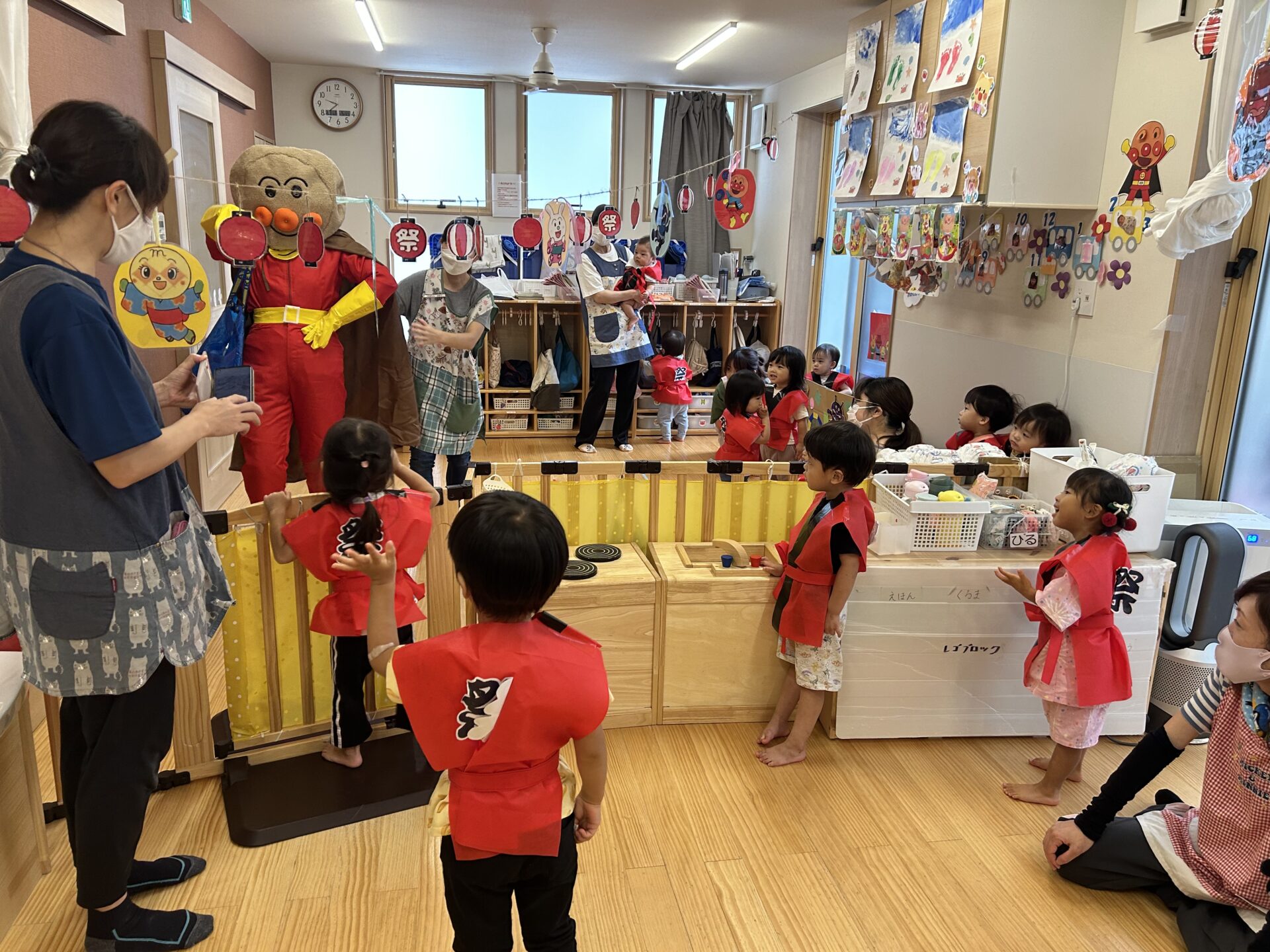 全クラスのお友だちが法被を着終わると、アンパンマンがやってきてくれました。