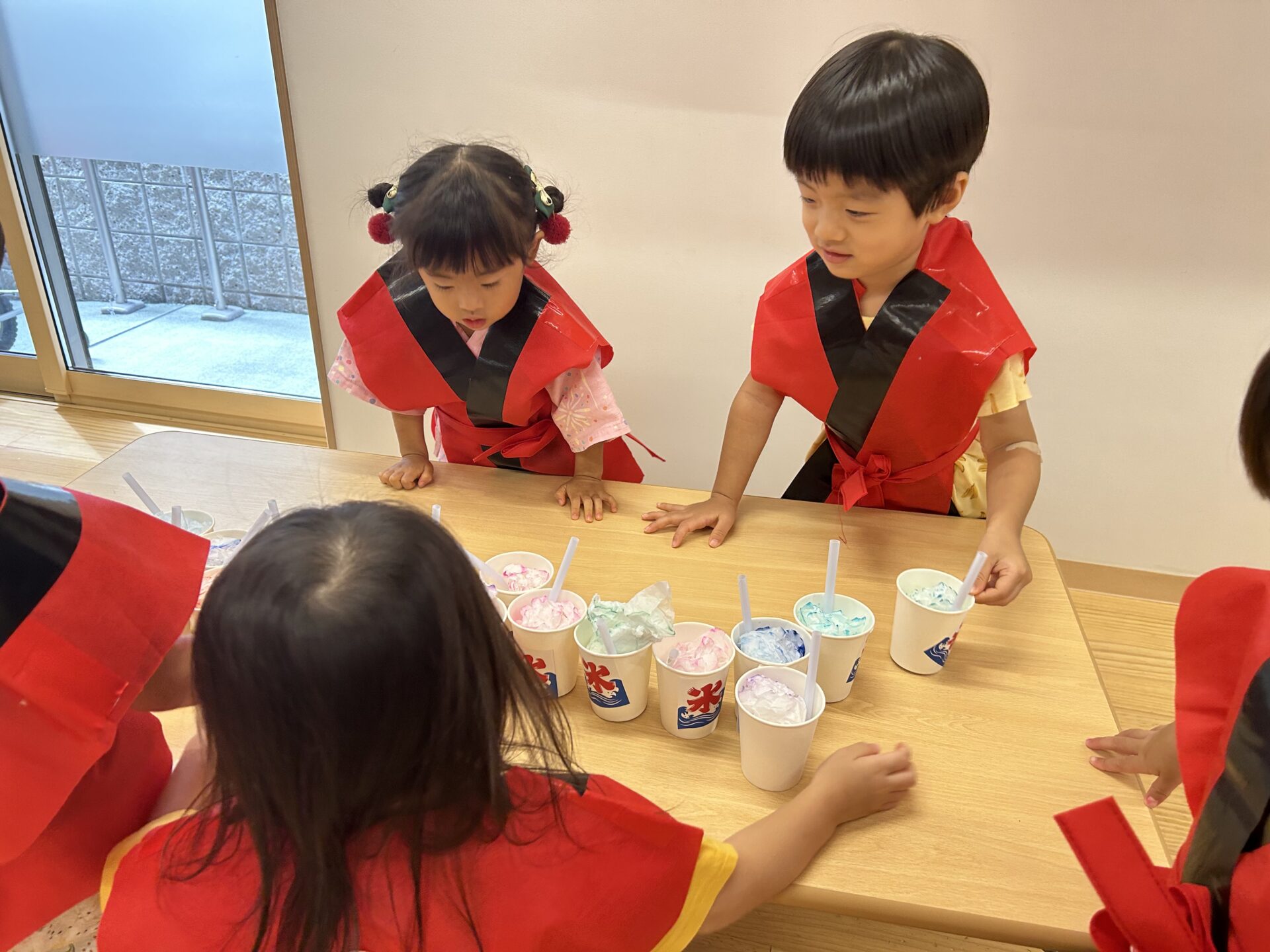 子ども達で協力し、机の上にかき氷を並べていきます。