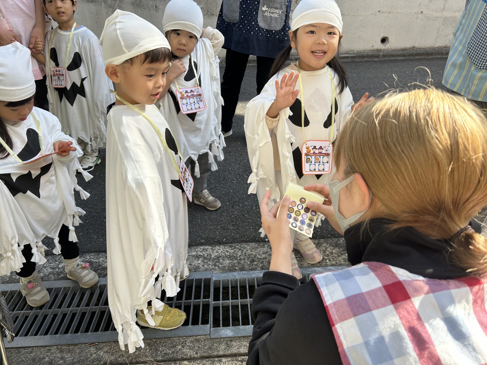 この時のために先週から練習していた合言葉、「トリックオアトリート!」をみんなで声を合わせ、伝えることができました。