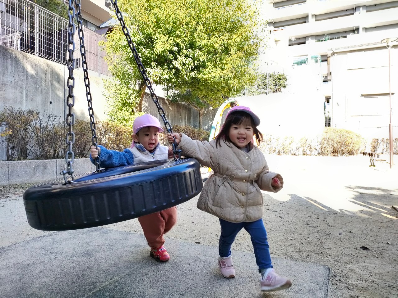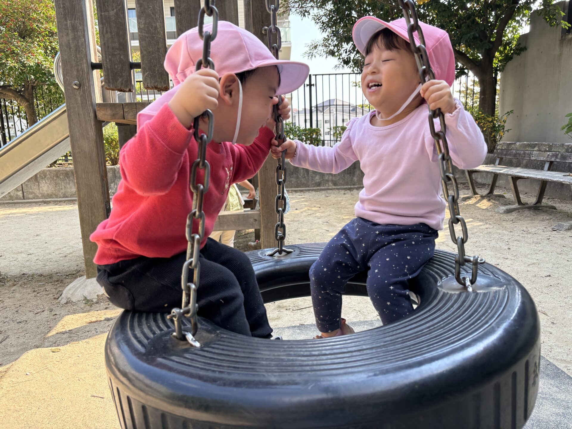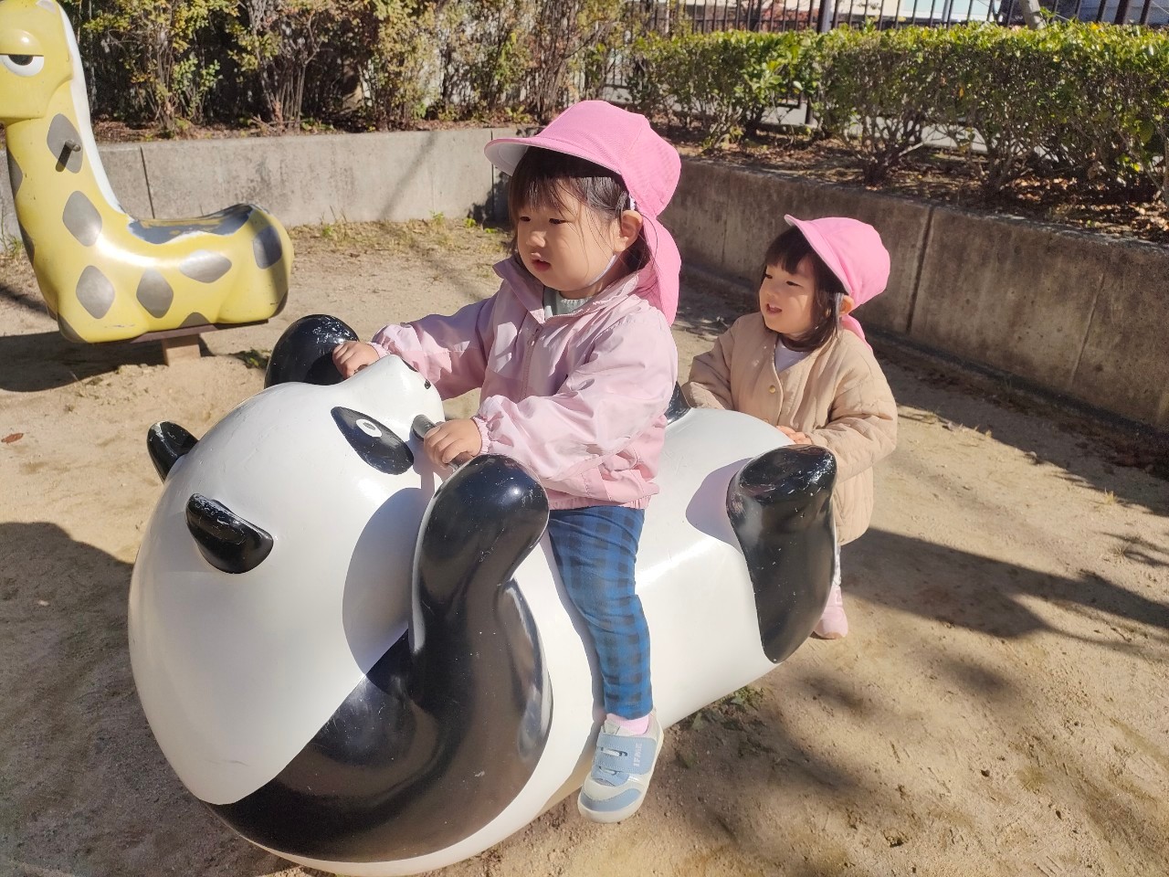 スプリング遊具では、「押すよー!よいしょっ、よいしょっ」とお友達が乗る遊具を押して楽しむ可愛い場面もありますよ♡