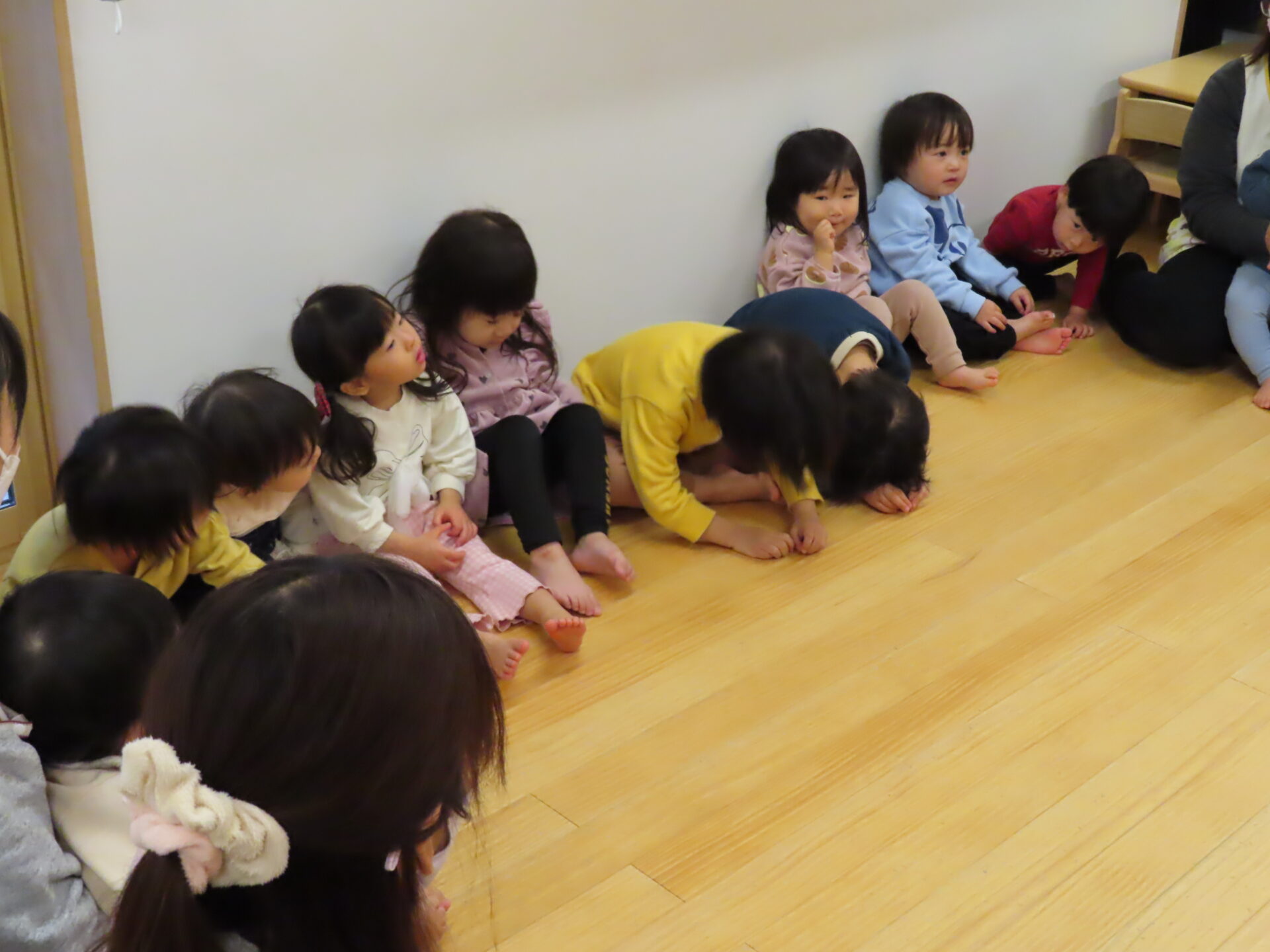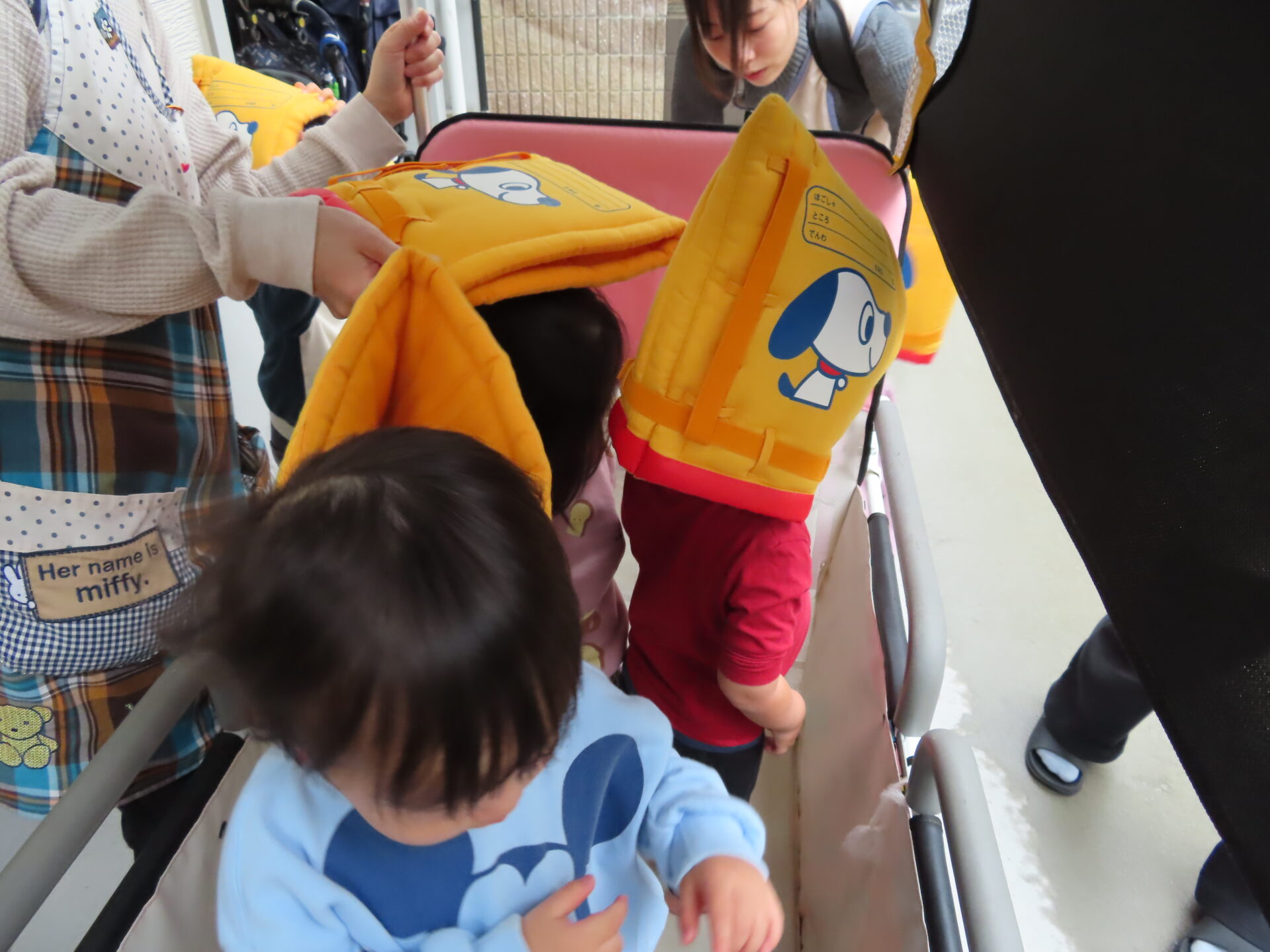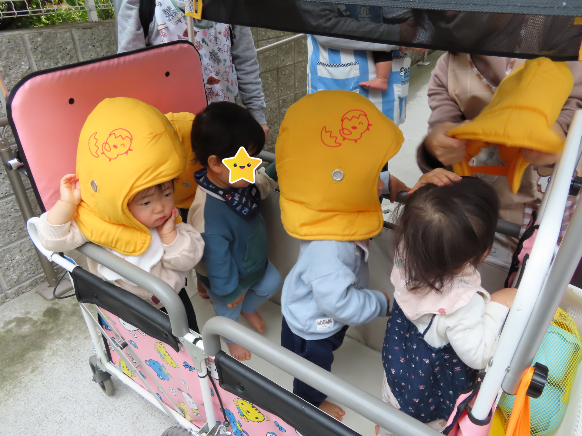 頭を守るポーズをしてくれる2歳児クラスのあめ組さん達です。