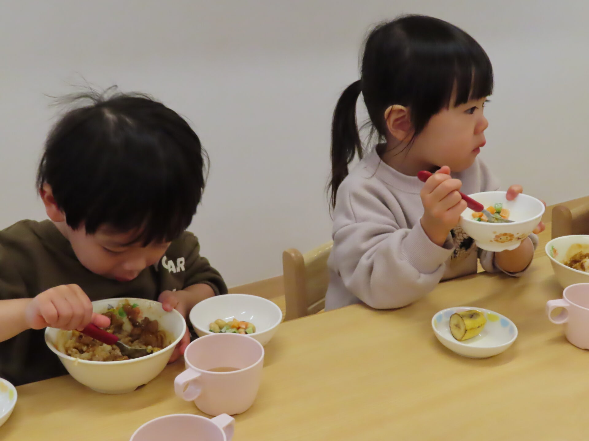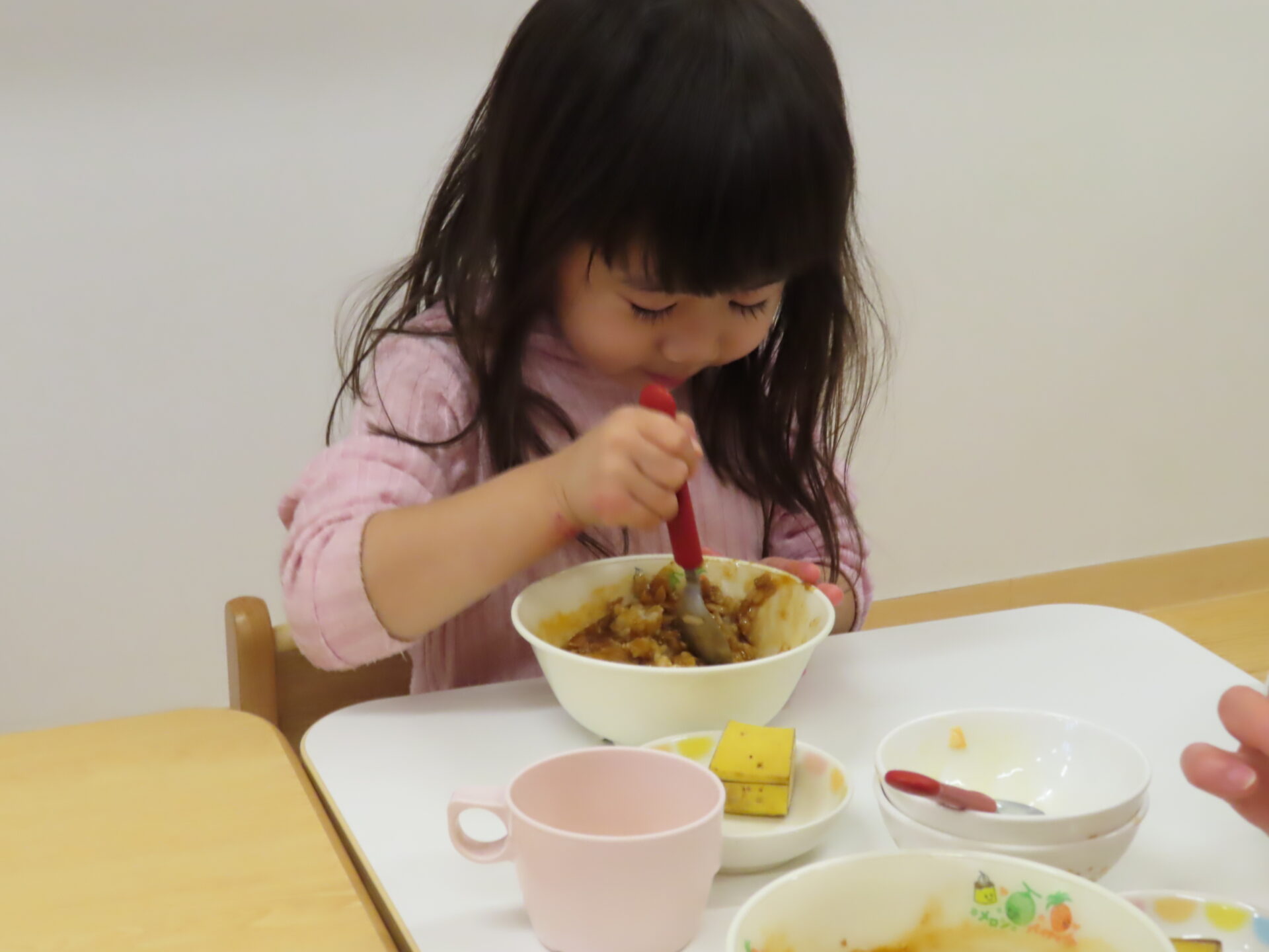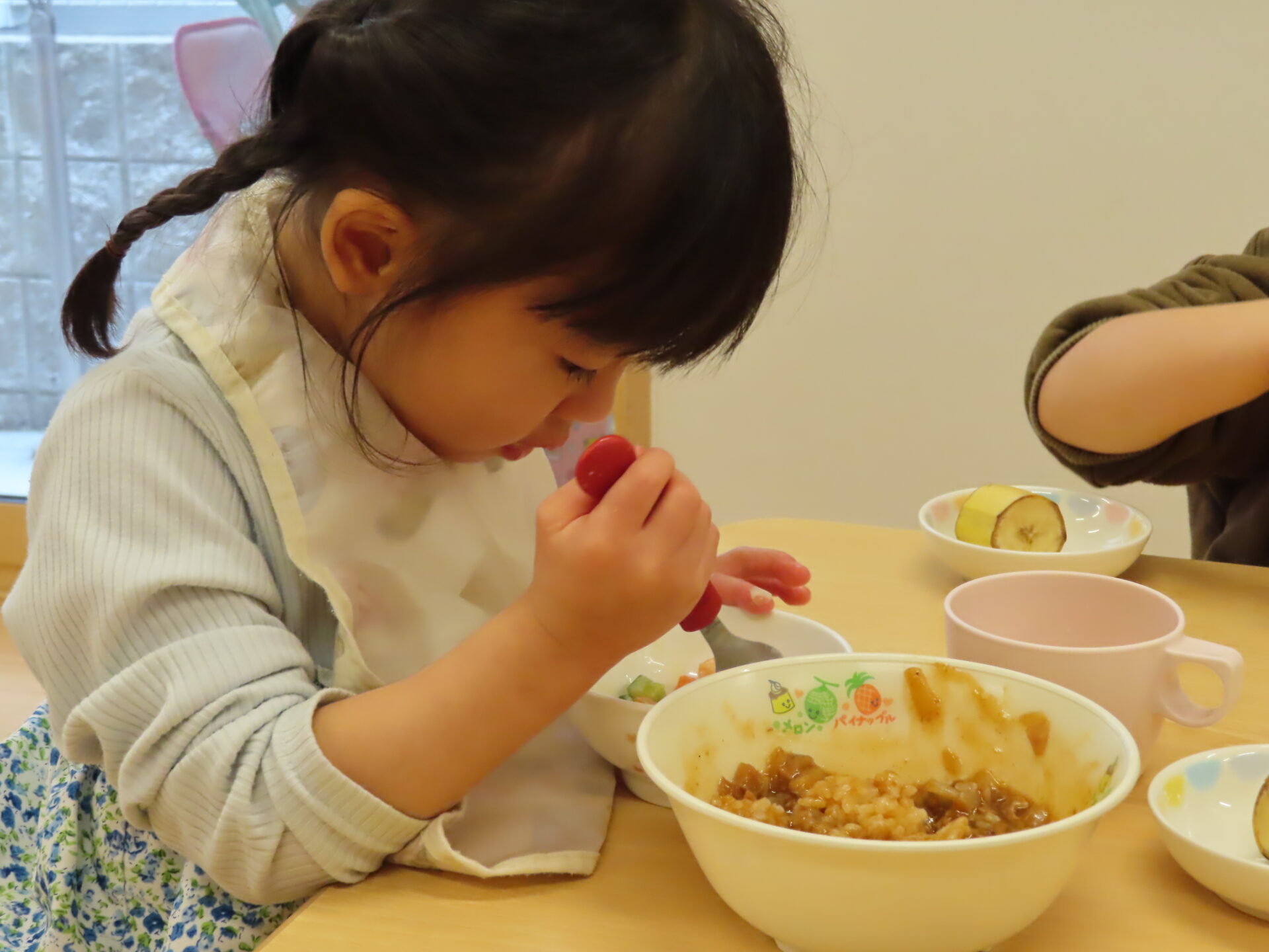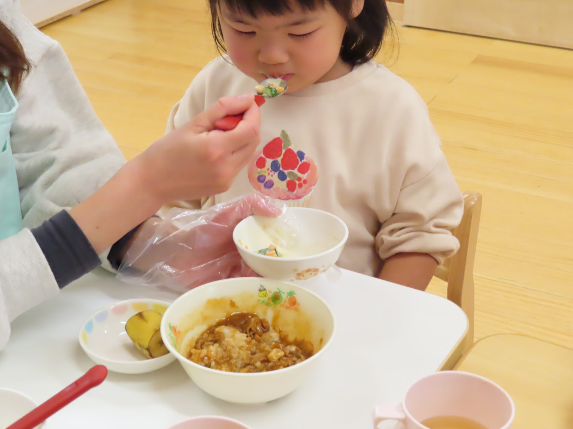 食べ進めがよくない時は、「お手伝いしたら食べれそう?」と、保育者がたずねます。