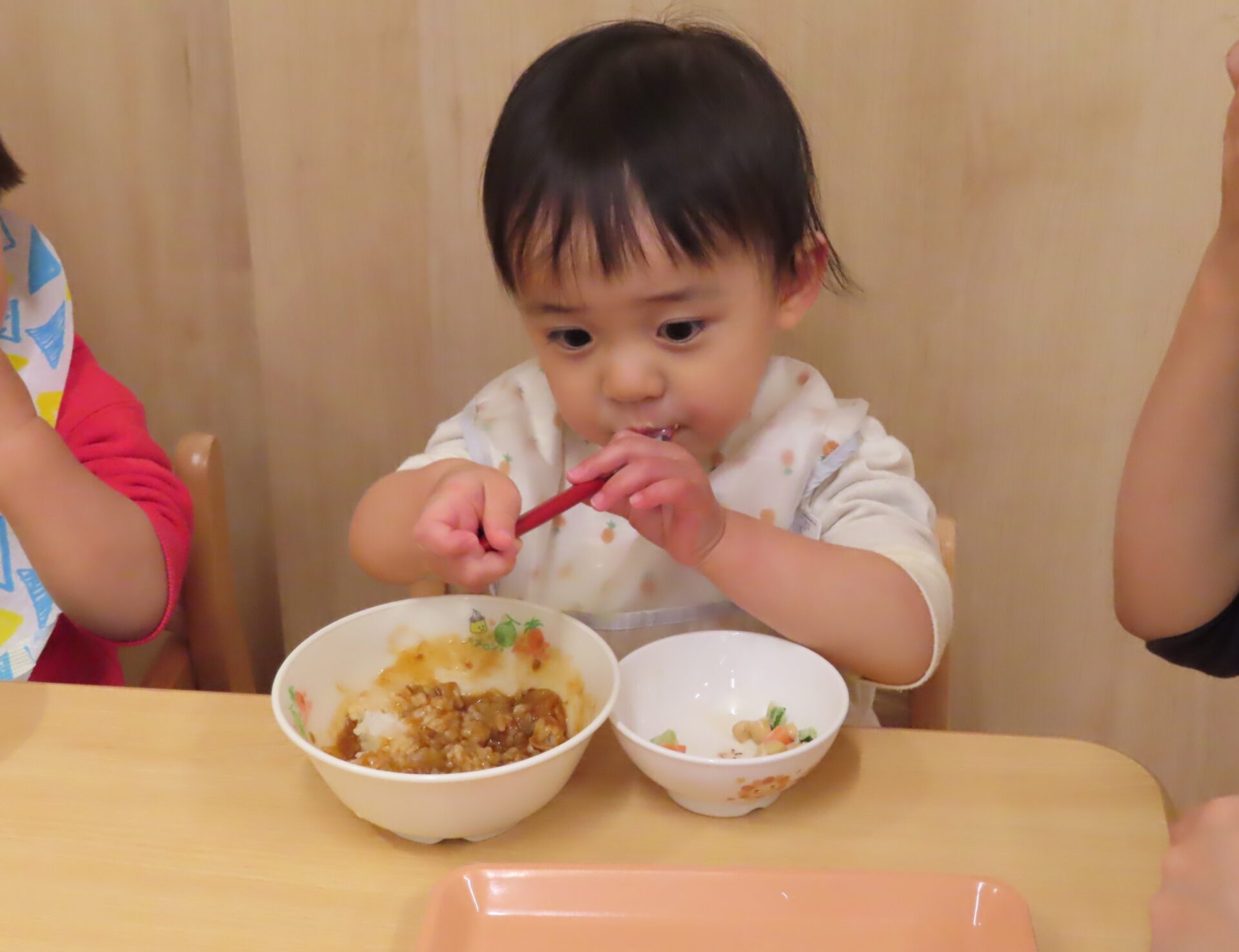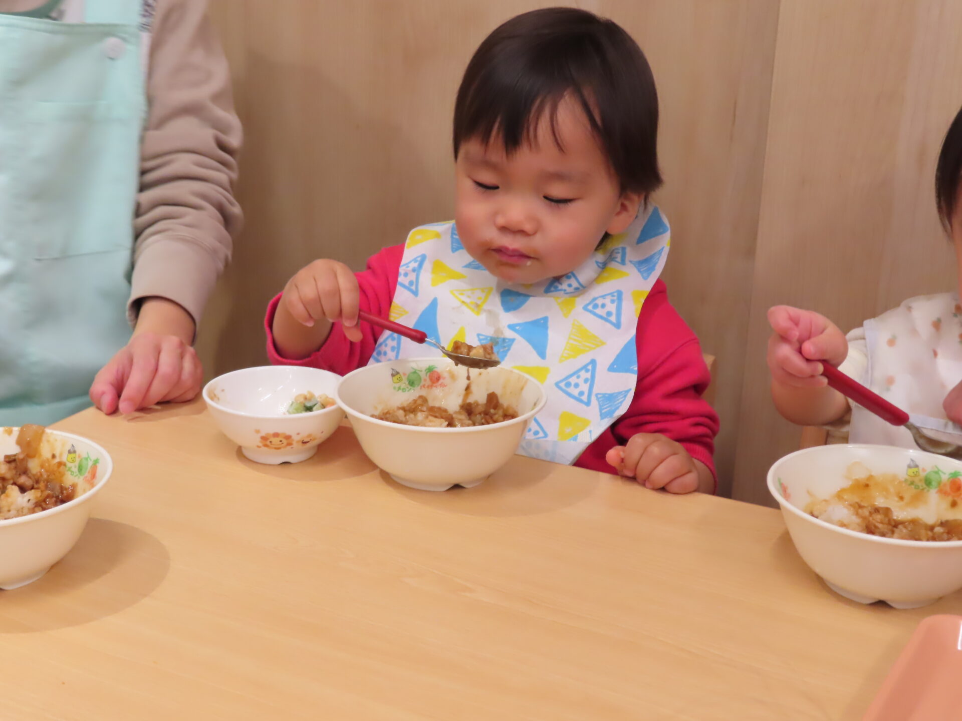 「ご飯からなら食べられそう?」と、保育者が声を掛け、ひとさじ口へ運ぶと