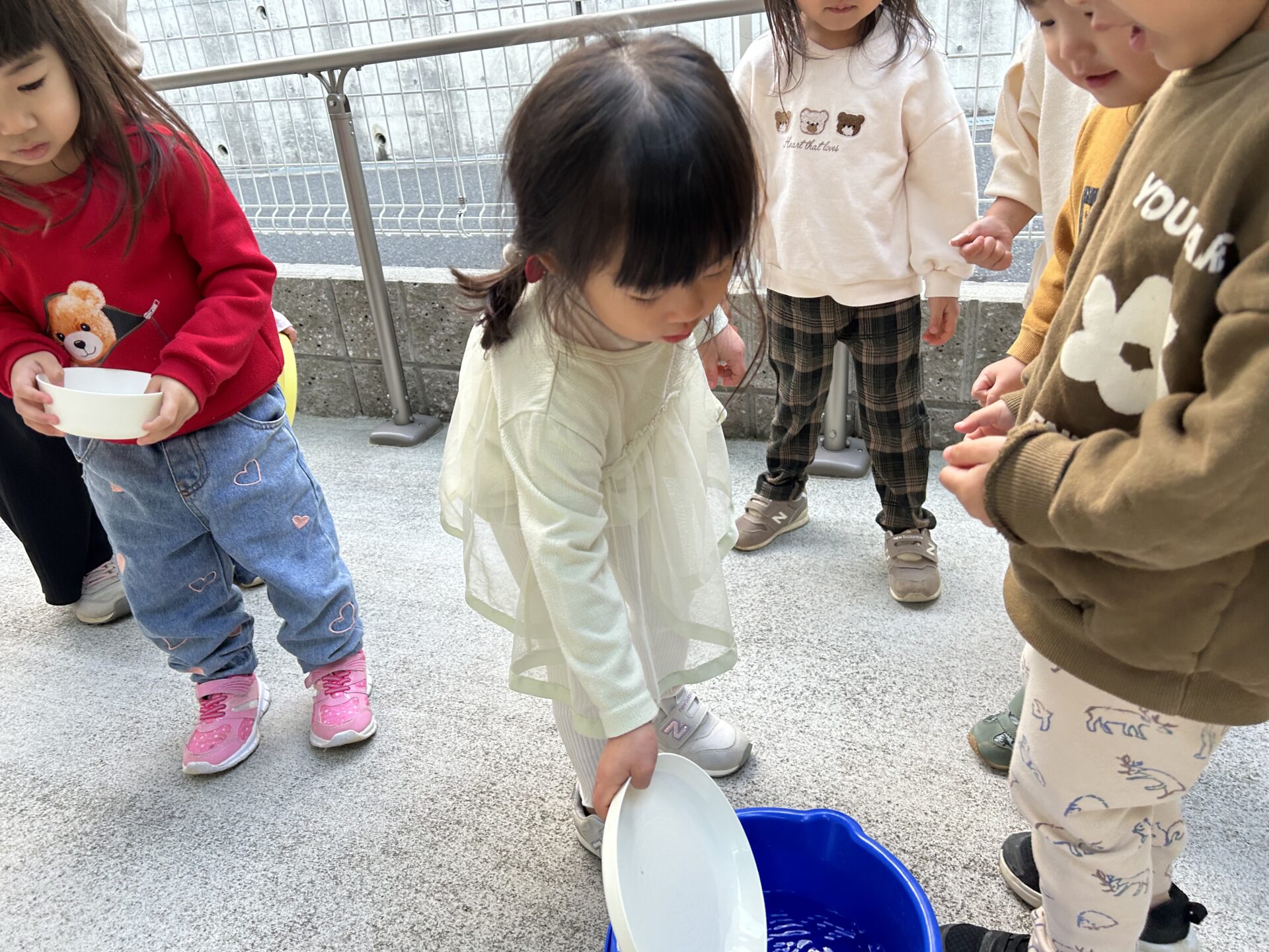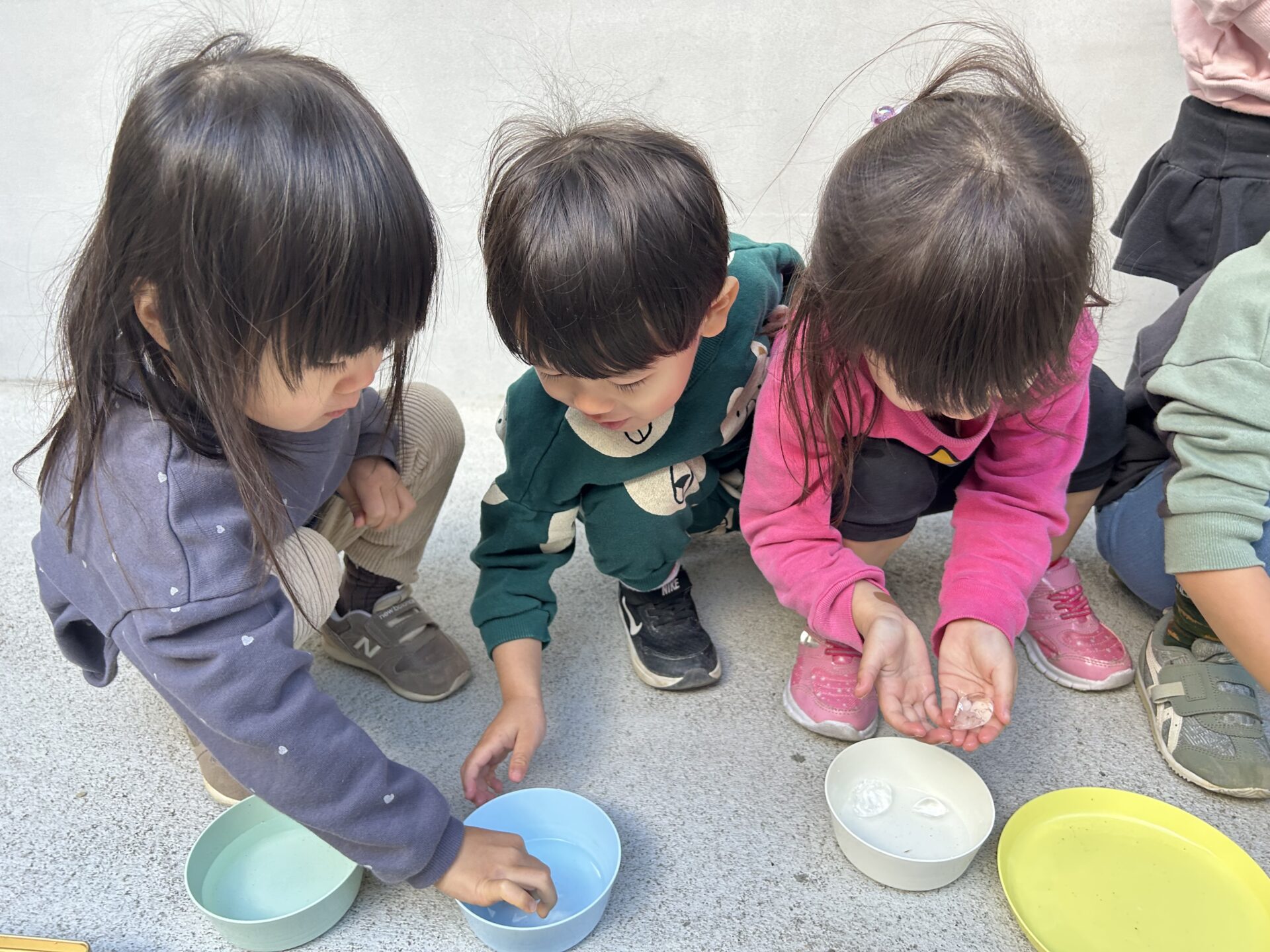 全員が揃い、朝のおやつを食べた後にお外に置いていた氷を皆で見に行きました。