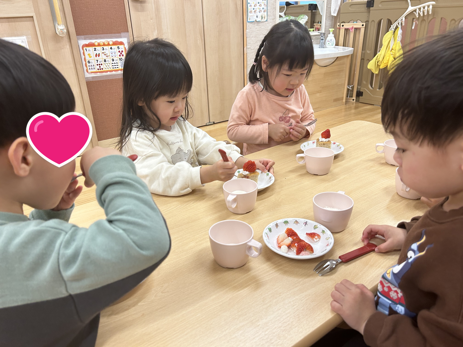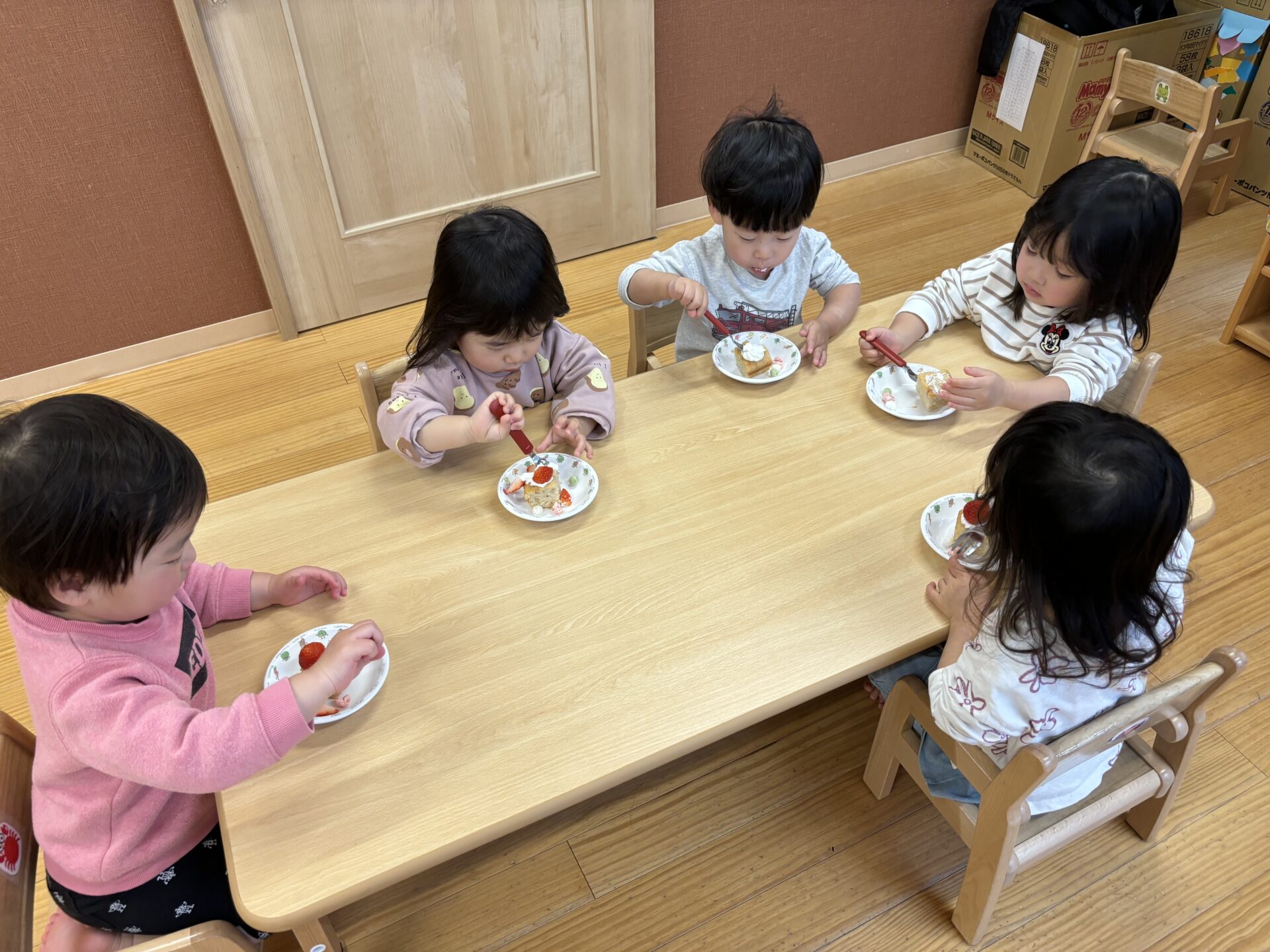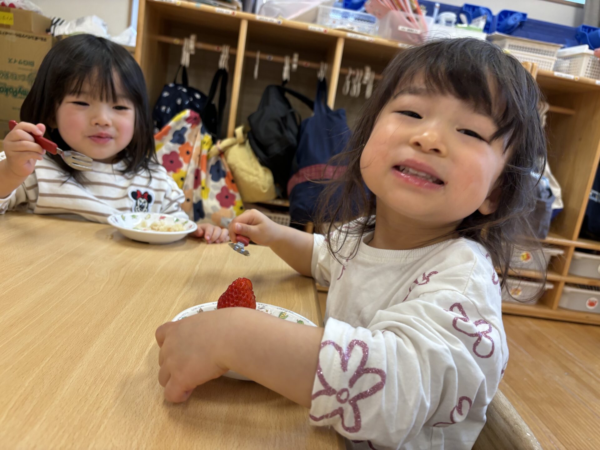 おいしそうなイチゴに目を輝かせ、「おいしいね!」「おかわりある?」と楽しそうにお喋りしていましたよ。