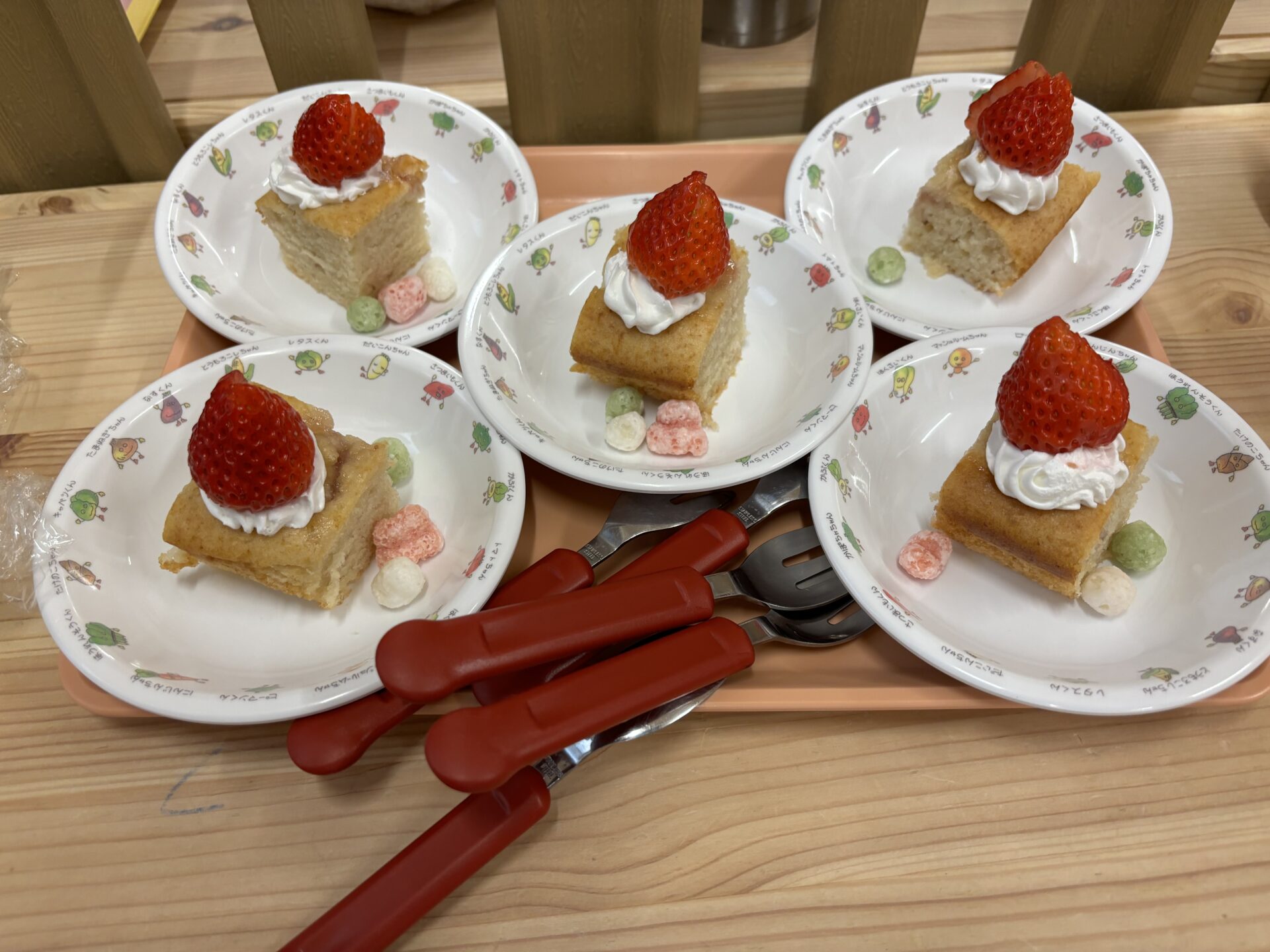 給食はちらし寿司を食べて、なんとおやつは…ひなあられと大きなイチゴが乗ったケーキです!