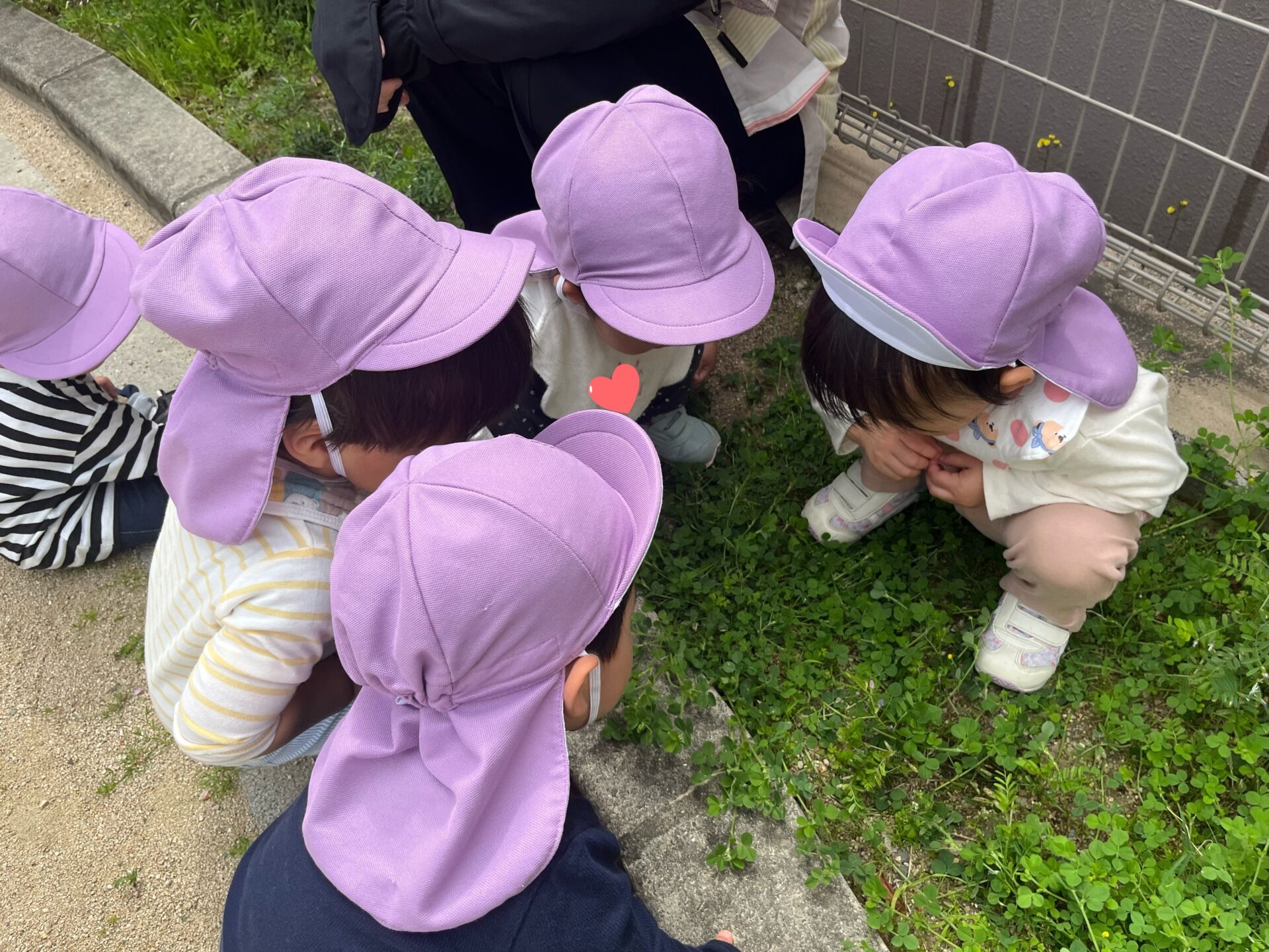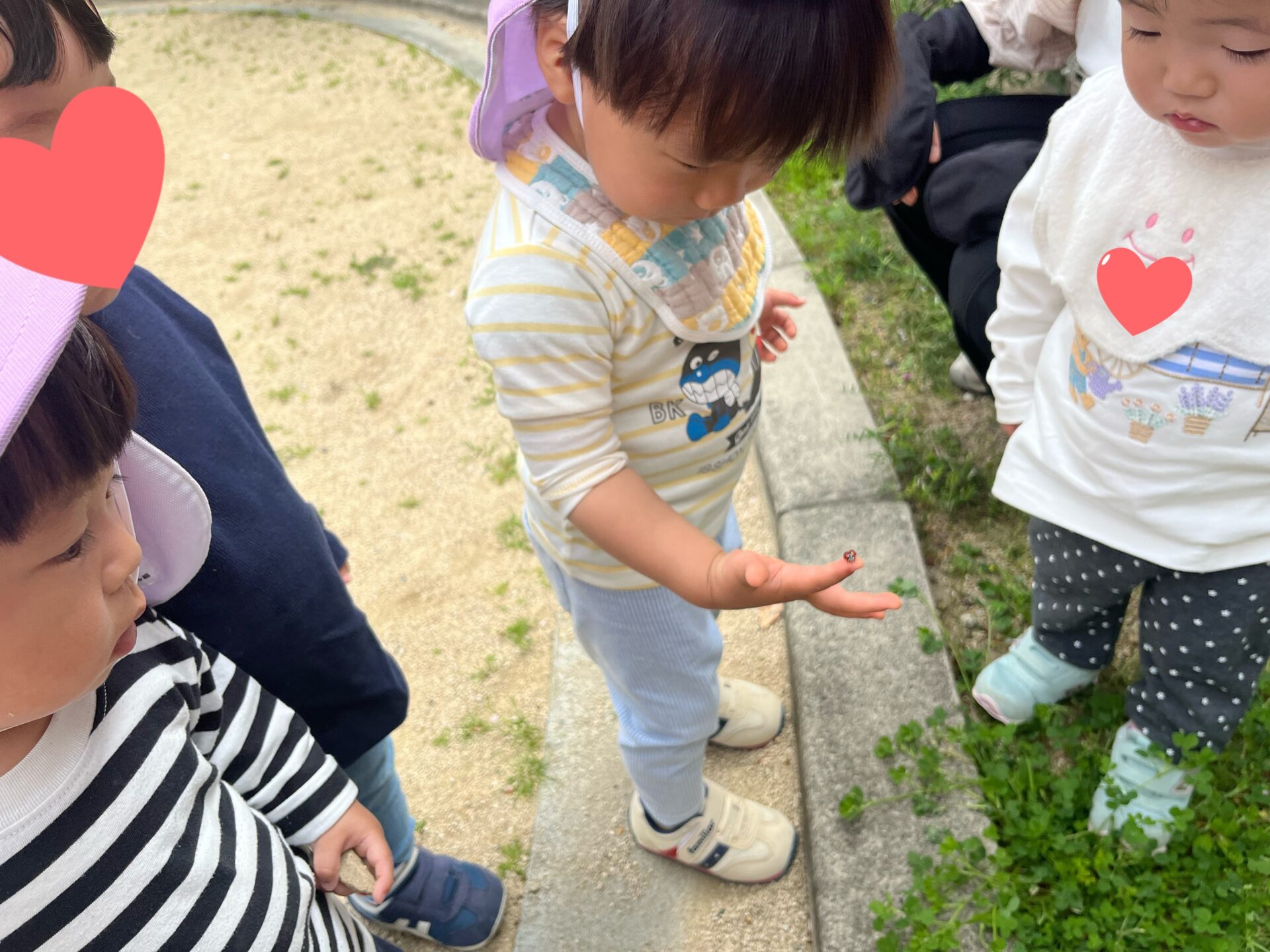保育者がつかまえたてんとう虫を手に乗せることができたお友達もいましたよ。