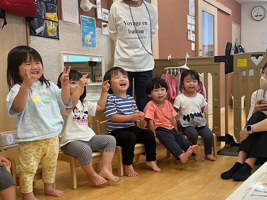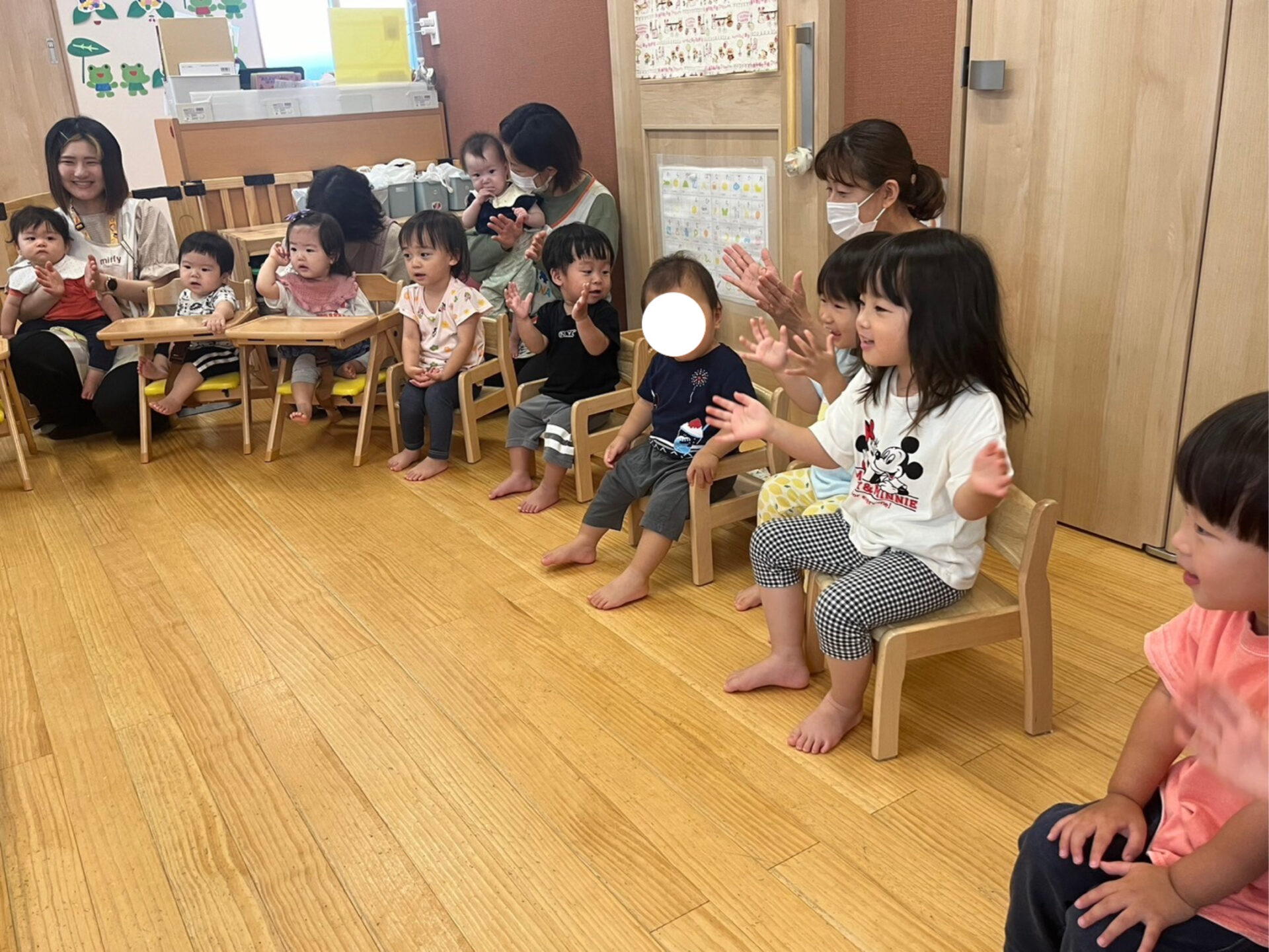 手拍子をつけ、おうたのプレゼントをした後は、大きな声で「おめでとう」とお祝いしました。