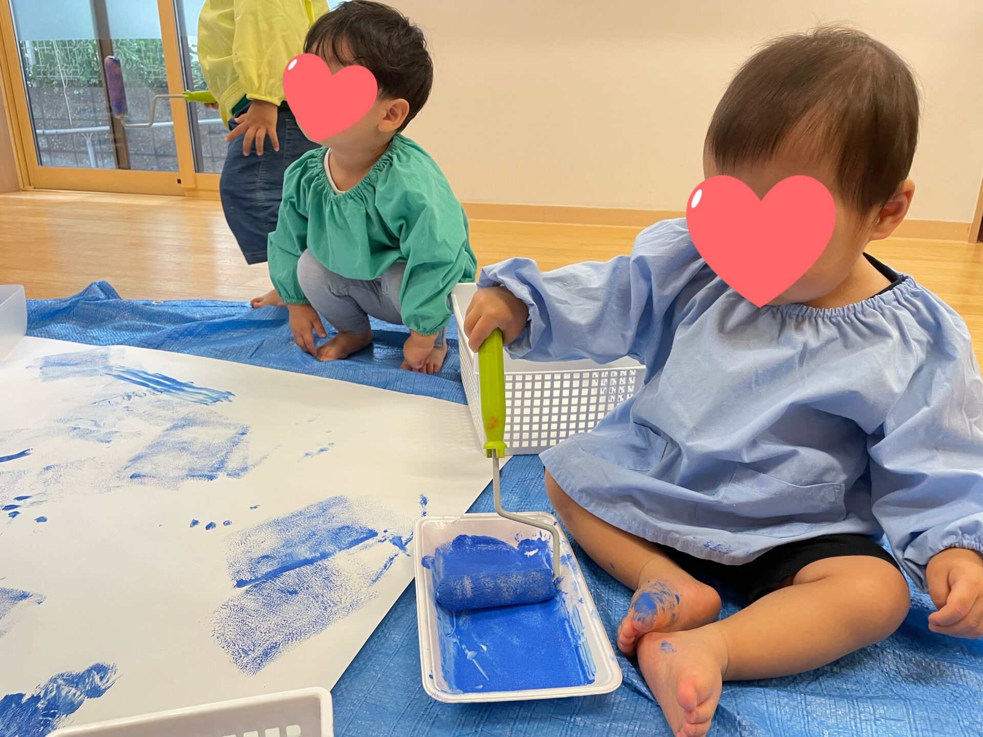 ローラーや筆などの道具を使ったり、手で塗ったりしながらどんどん青色に染めていきました!