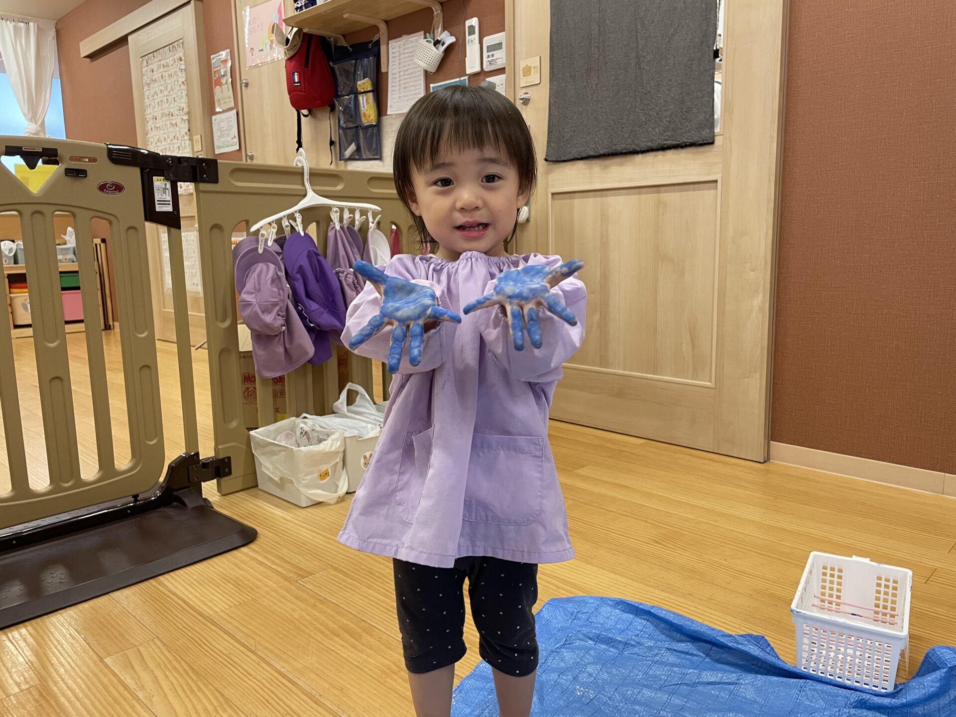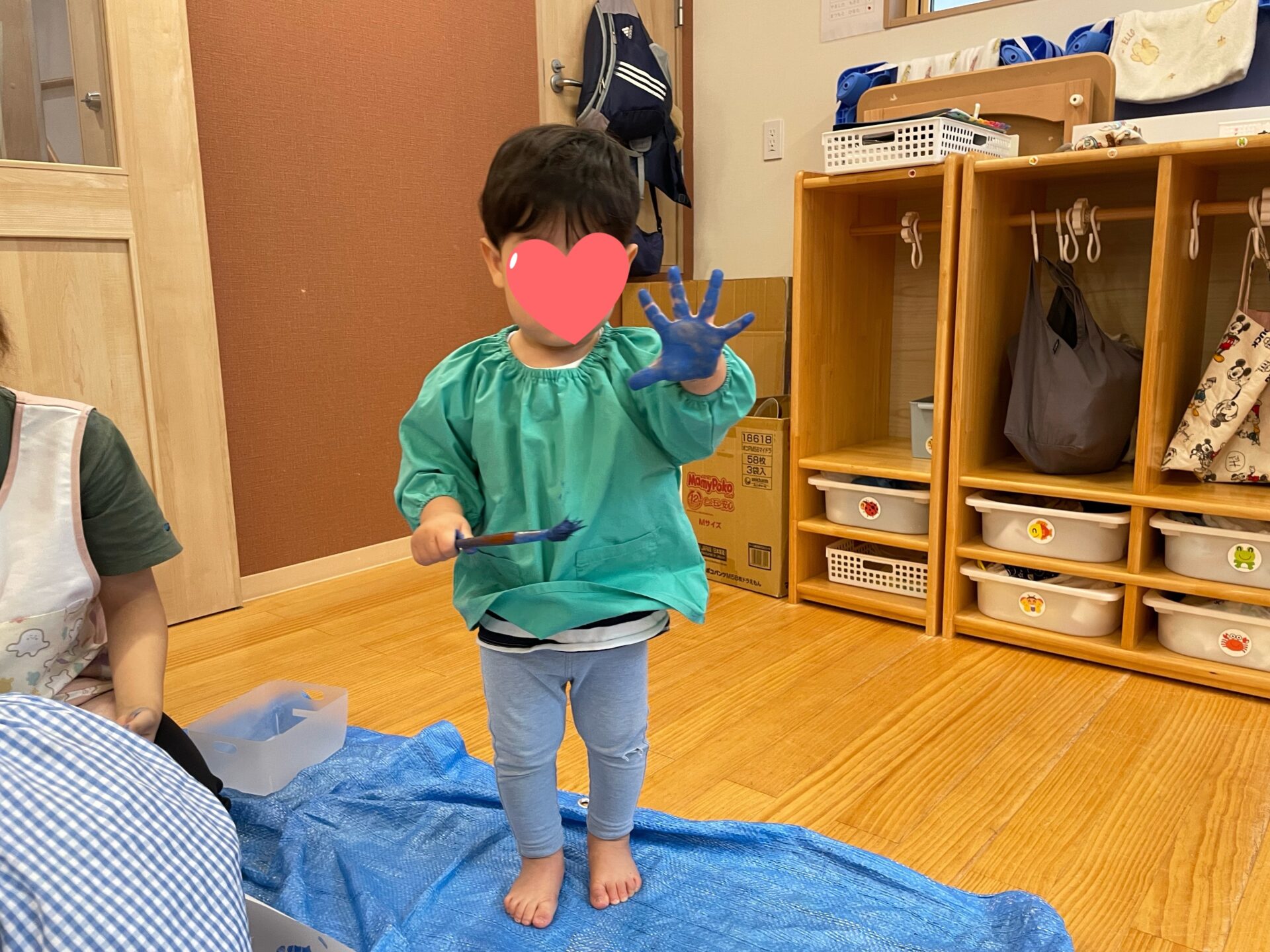 それを見ていた他の子たちも手に絵の具を塗っていき、真っ青になった手を保育者に見せてくれました😊