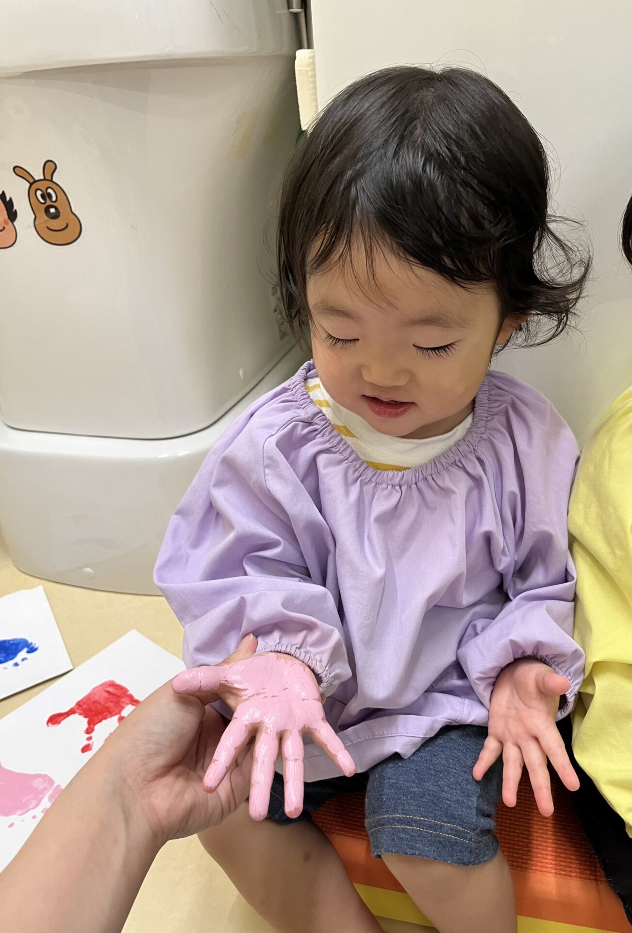 保育者に好きな色の絵の具を塗ってもらい喜んでいます♩