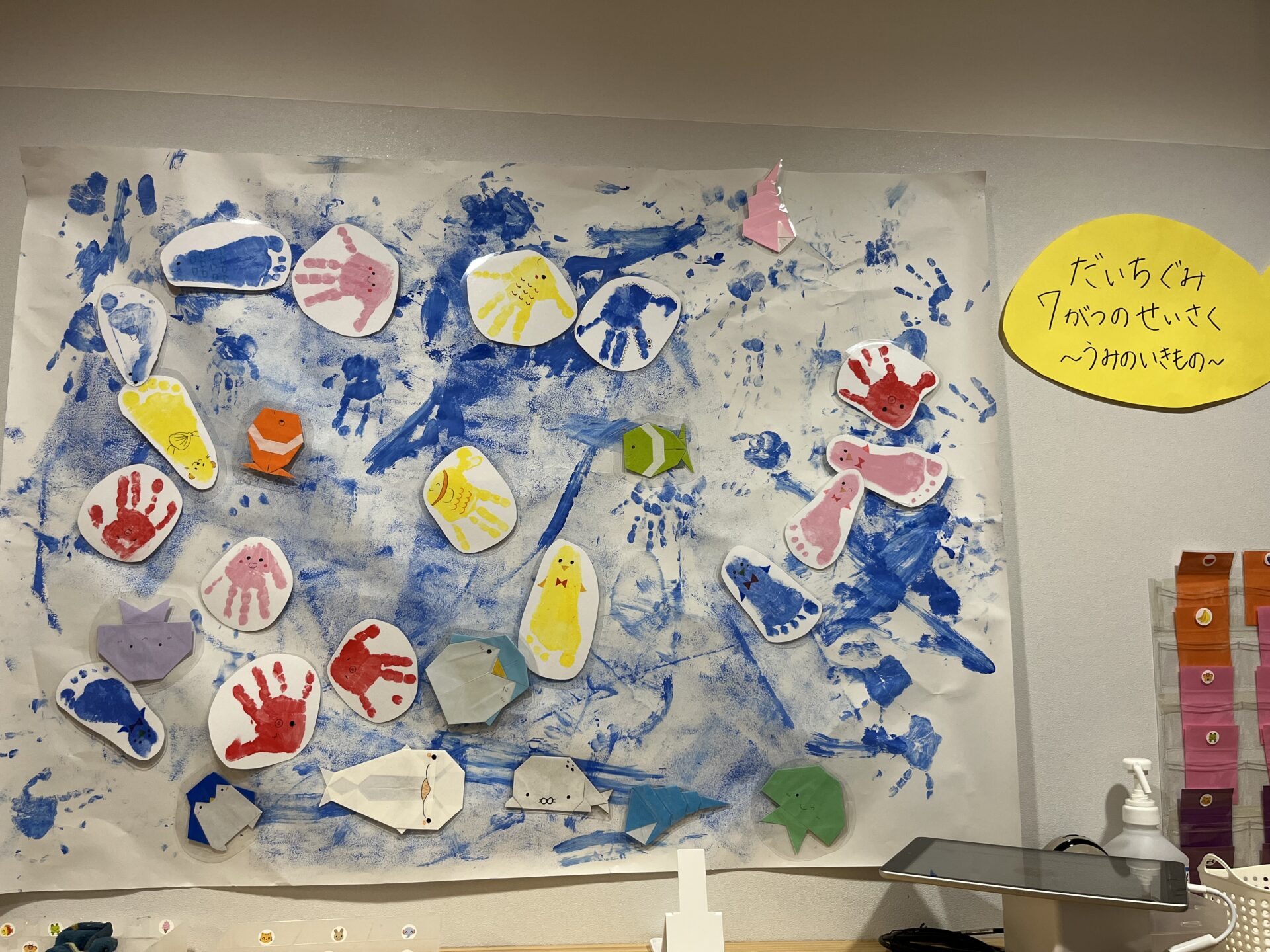 まずはお魚やタコ、ペンギンなどの生き物を作るために子どもたちの手型や足型を取りました。