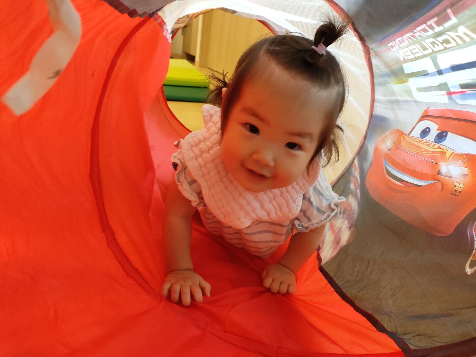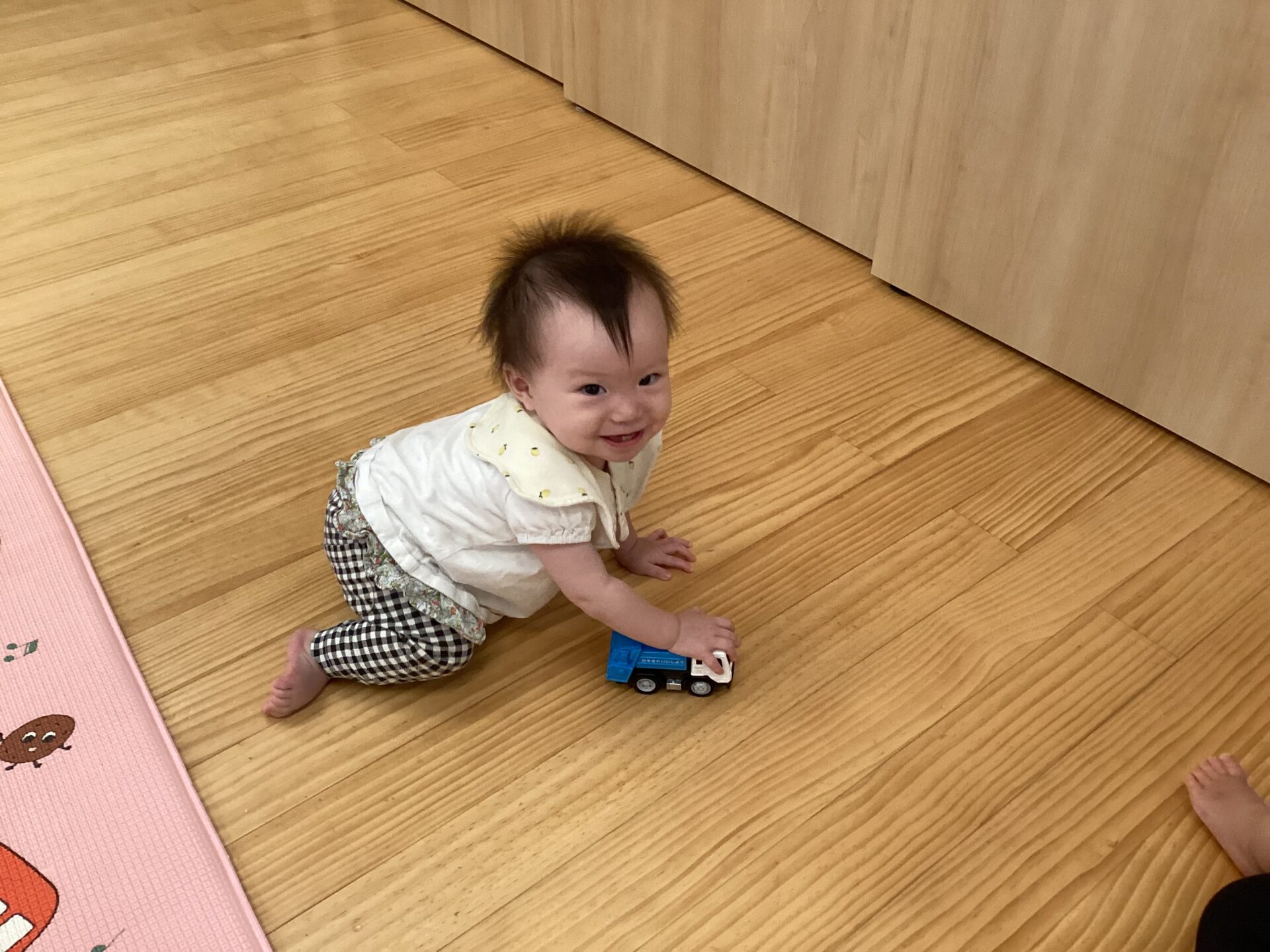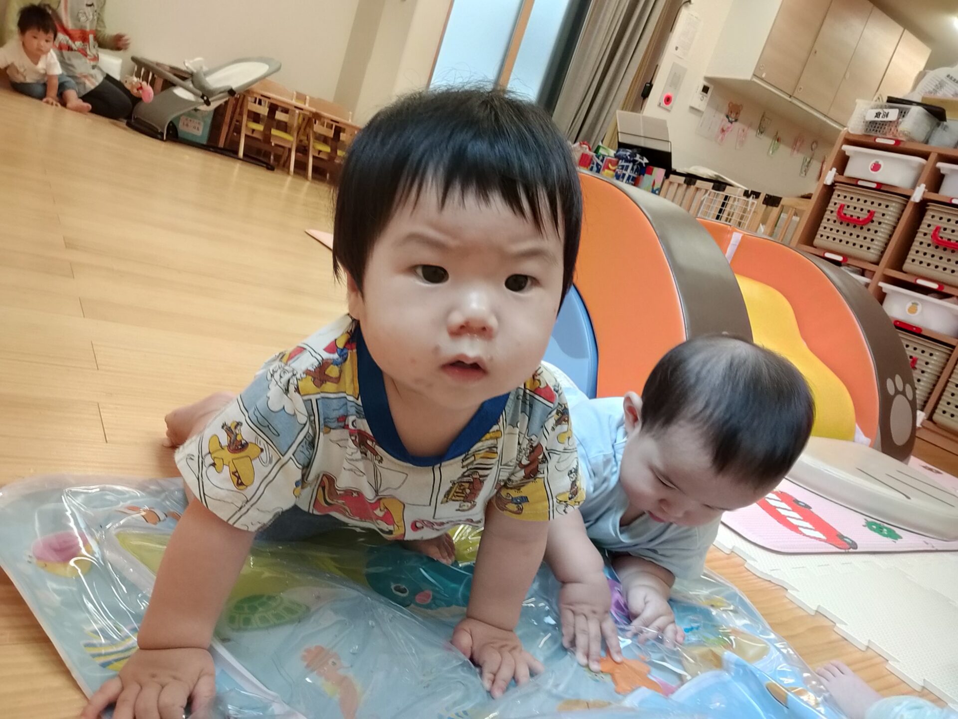 最近では、お友だちと一緒に車の玩具を走らせたり、ずり這いやハイハイ、1人歩きなどで、追いかけっこをしたり、お友だちとの関わりも見られるようになりました。