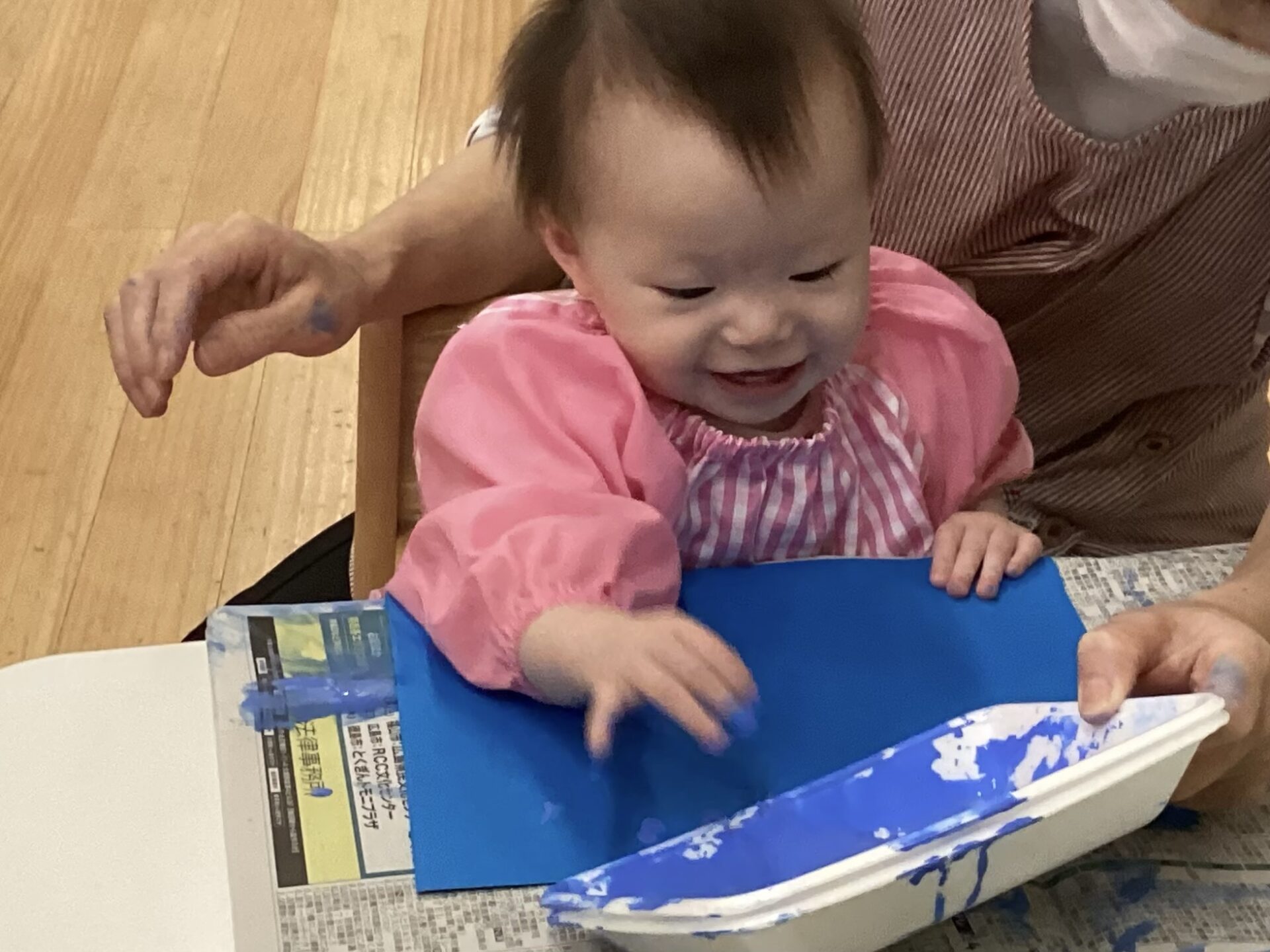 画用紙についた模様をじっと見つめたり、インクがついてしまった手を画用紙にポンポンとしながら楽しんでいました。