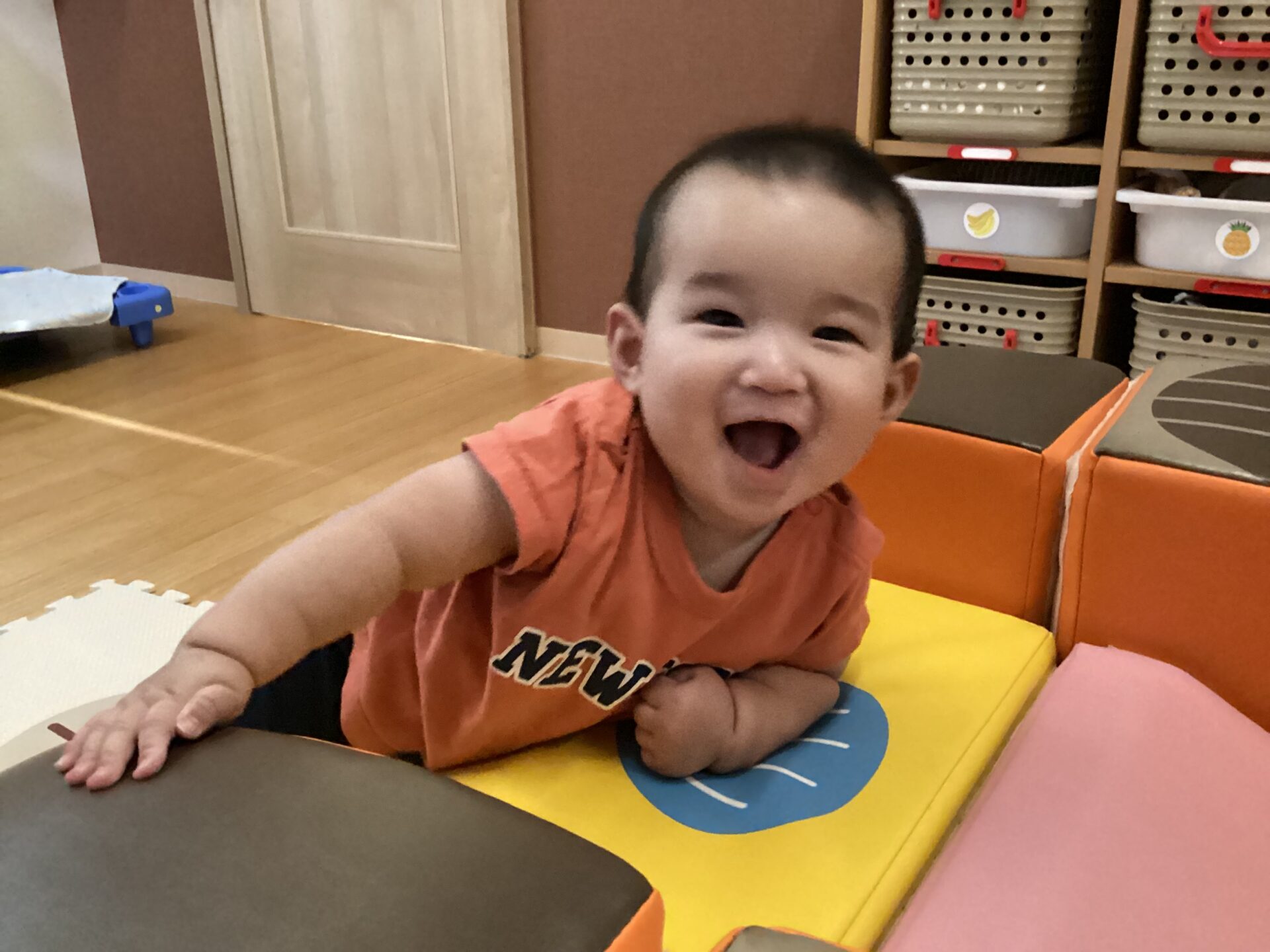 気温が高すぎて、環境省からの熱中症警戒アラートにより、お水遊びもなかなか出来ませんが、子ども達は暑さに負けず、ご機嫌で過ごしています。できる事も少しずつ増え、お気に入りの玩具で遊びながら、笑顔もいっぱい見せてくれています。