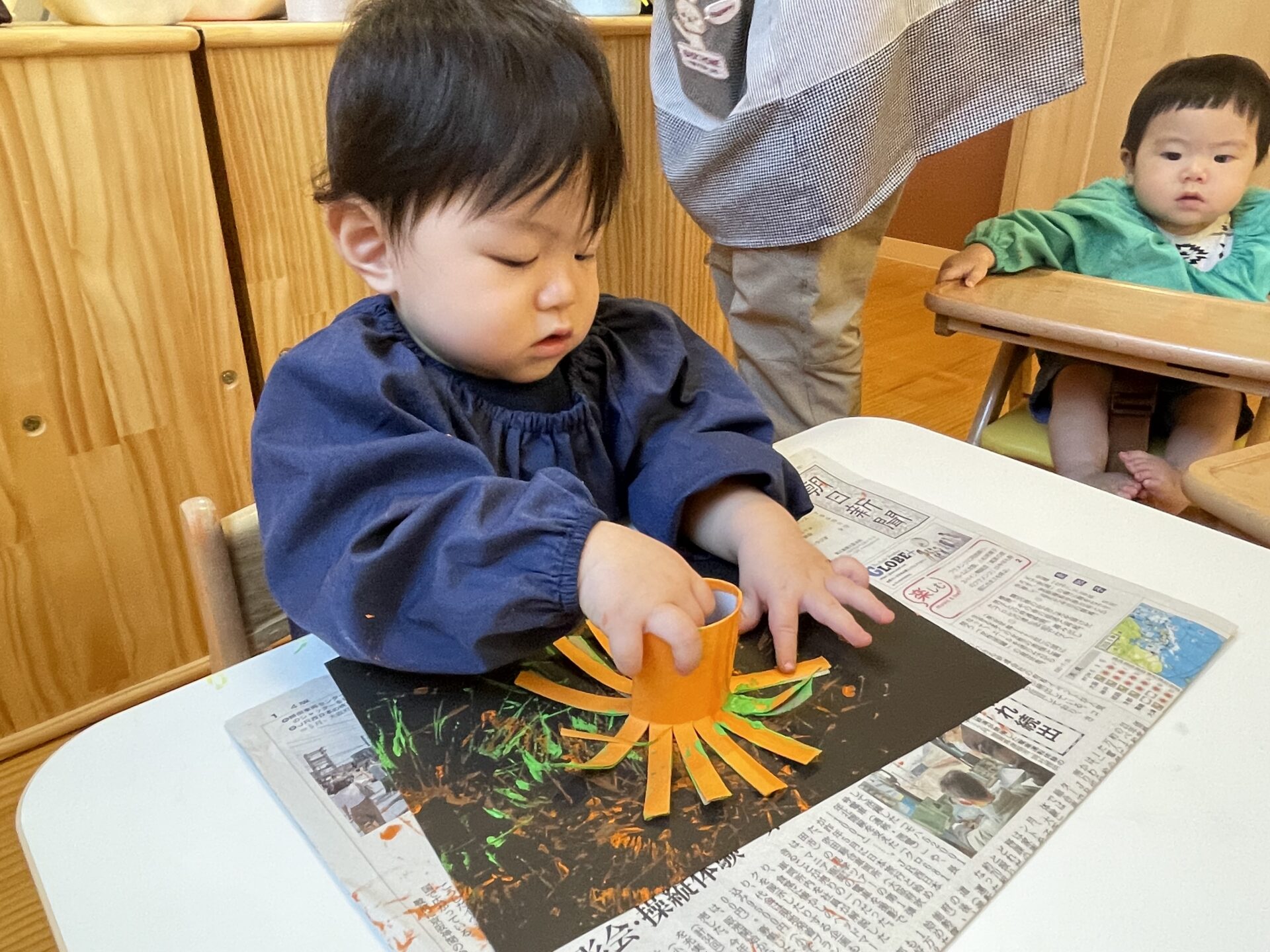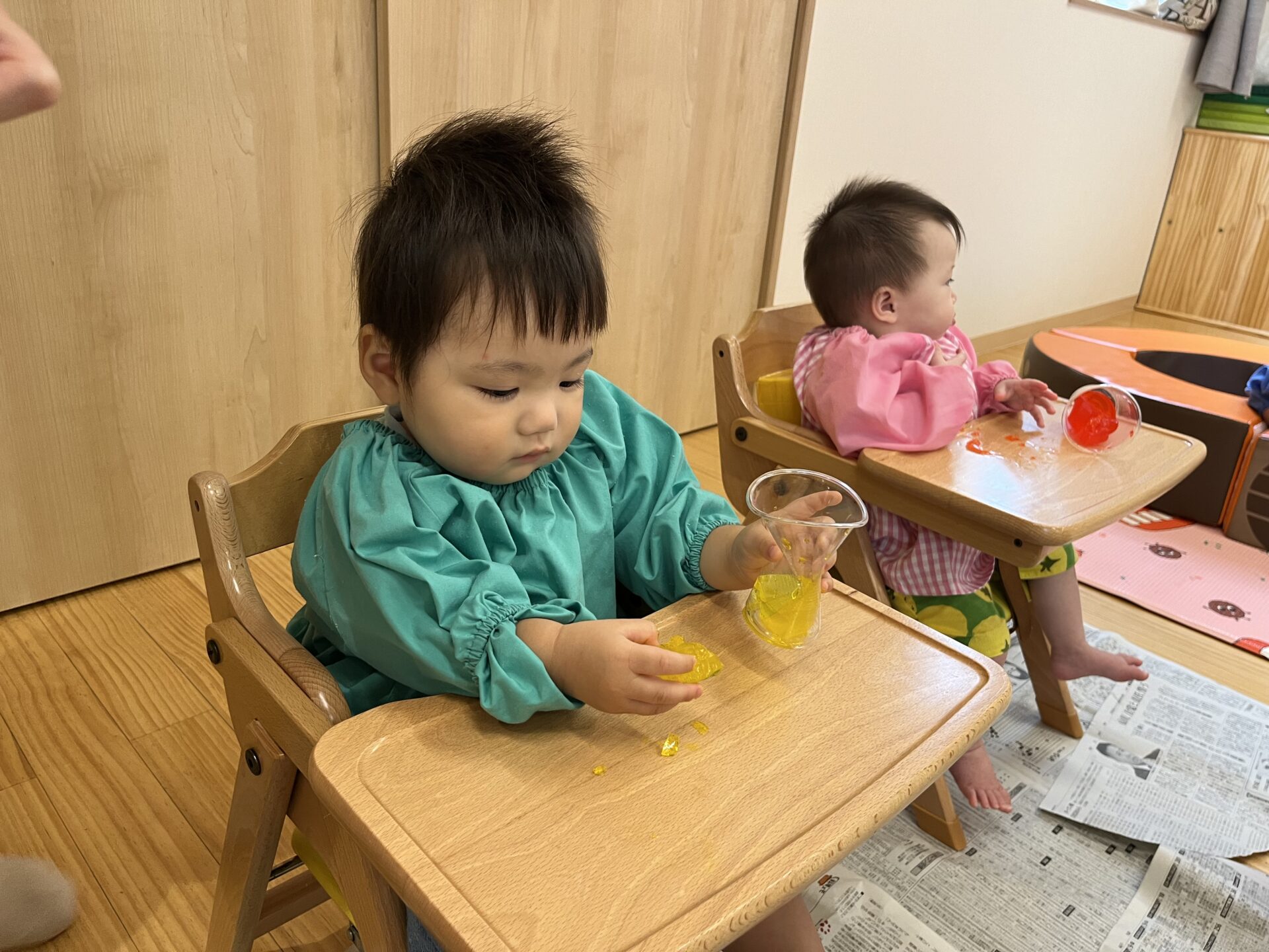 今までは1人ずつ側について行っていた制作ですが、今回は、みんなでベビーチェアに座り、保育者の話を聞くところからはじめてみました。