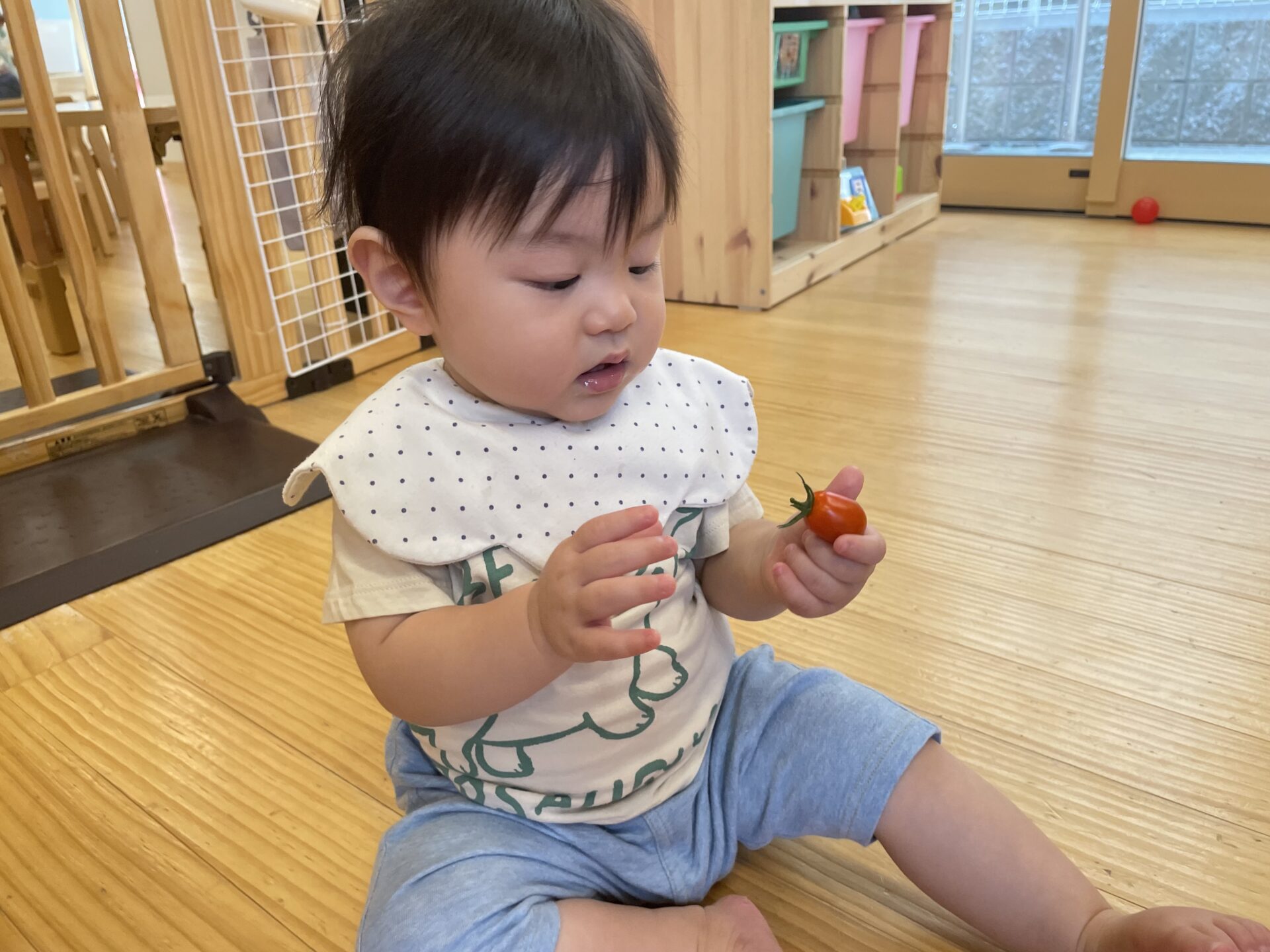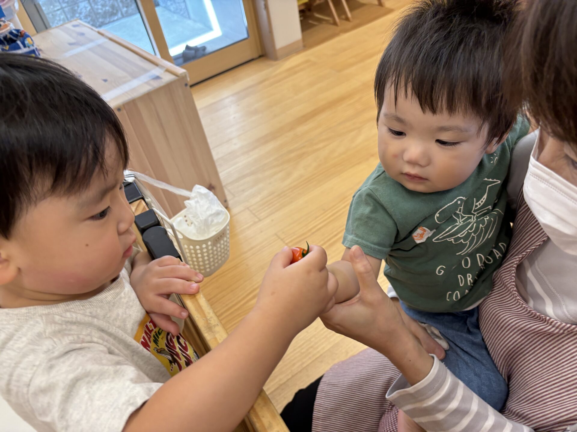 ミニトマトを手に取り「赤いねぇ。」「ツルツルしてるよ。」と、感想を伝え合っていました。