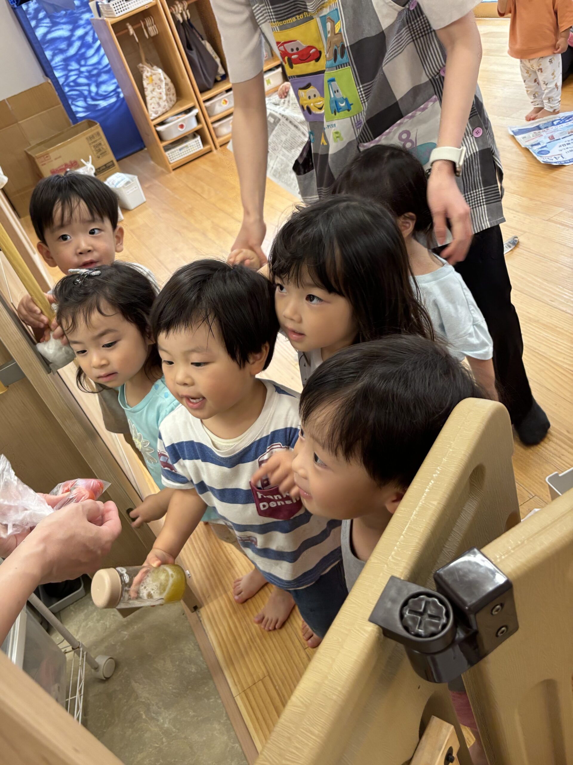収穫が終わり室内に戻ると、お部屋にいた保育者やお友だちに一生懸命報告するあめ組さん。