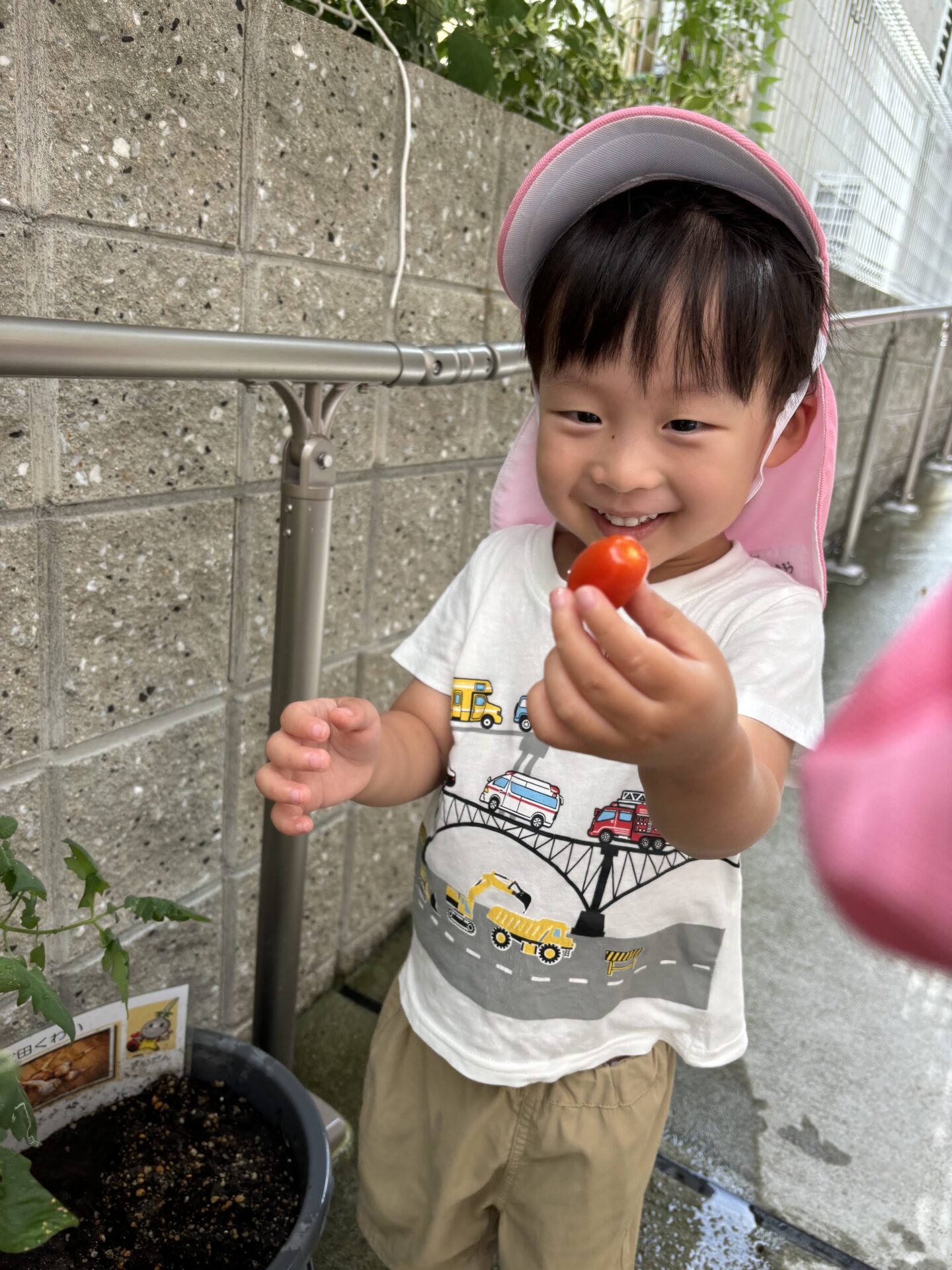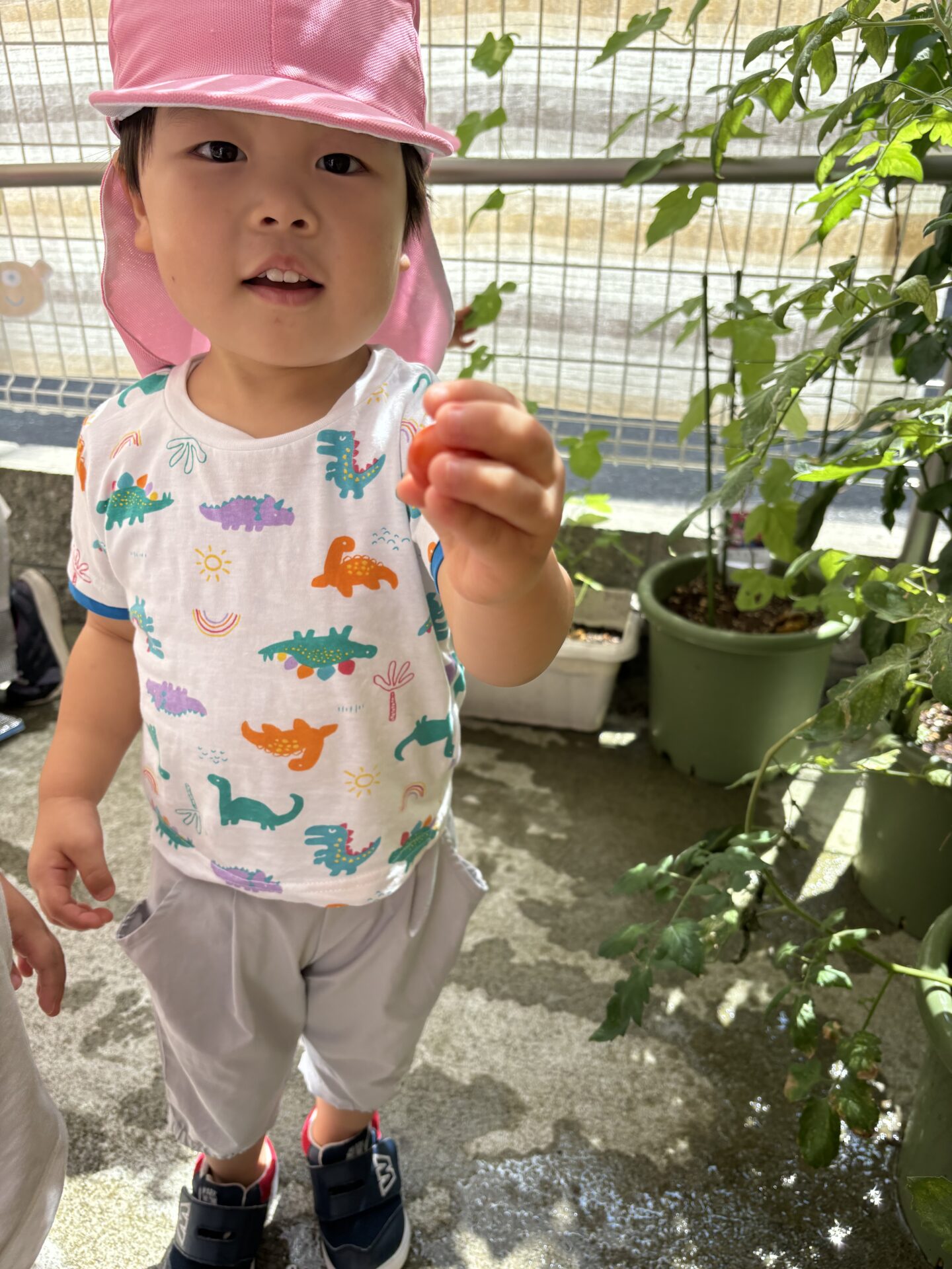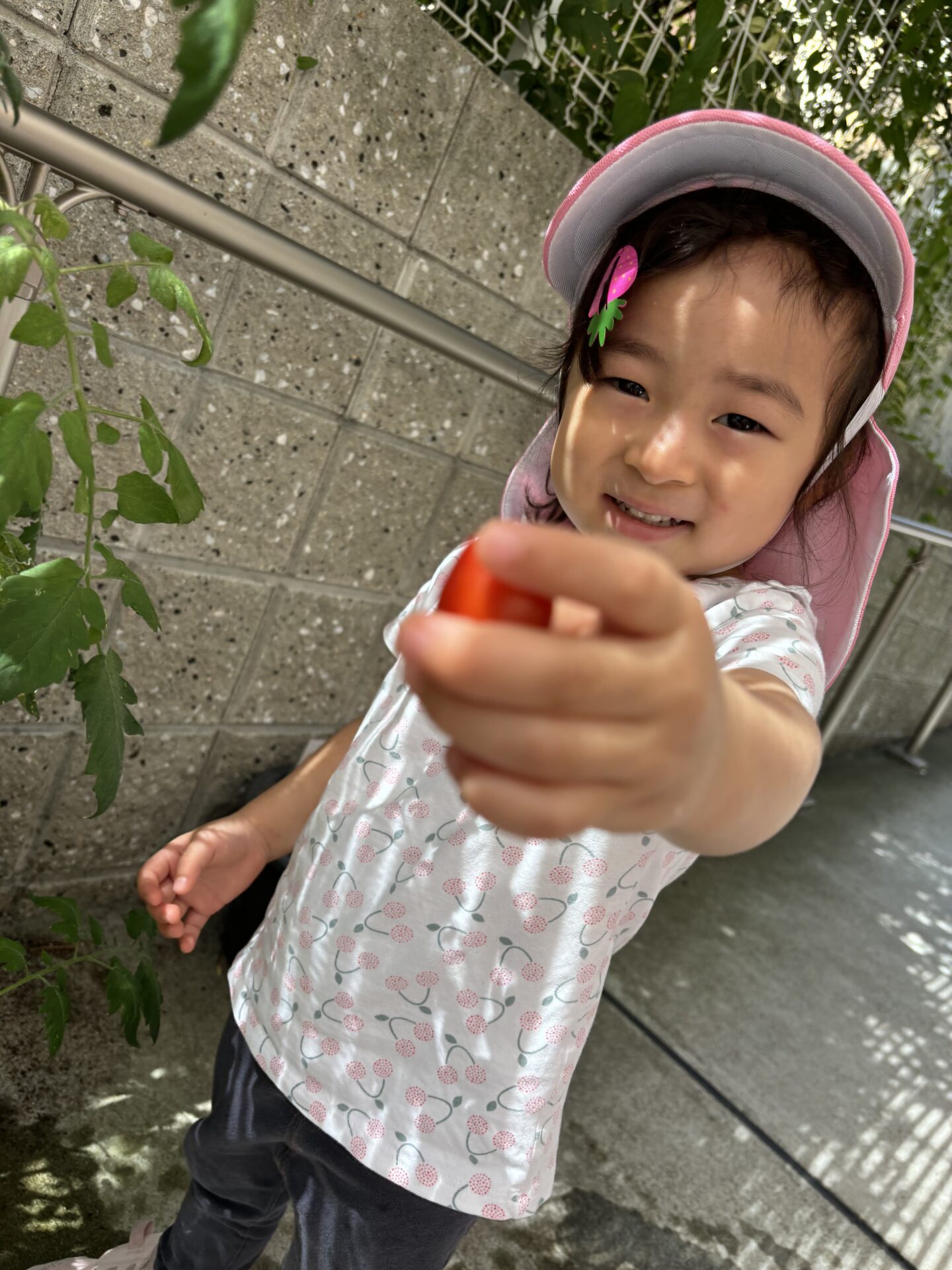 収穫できるまでに育ったミニトマトを見て、とても嬉しそうなお友だちです。