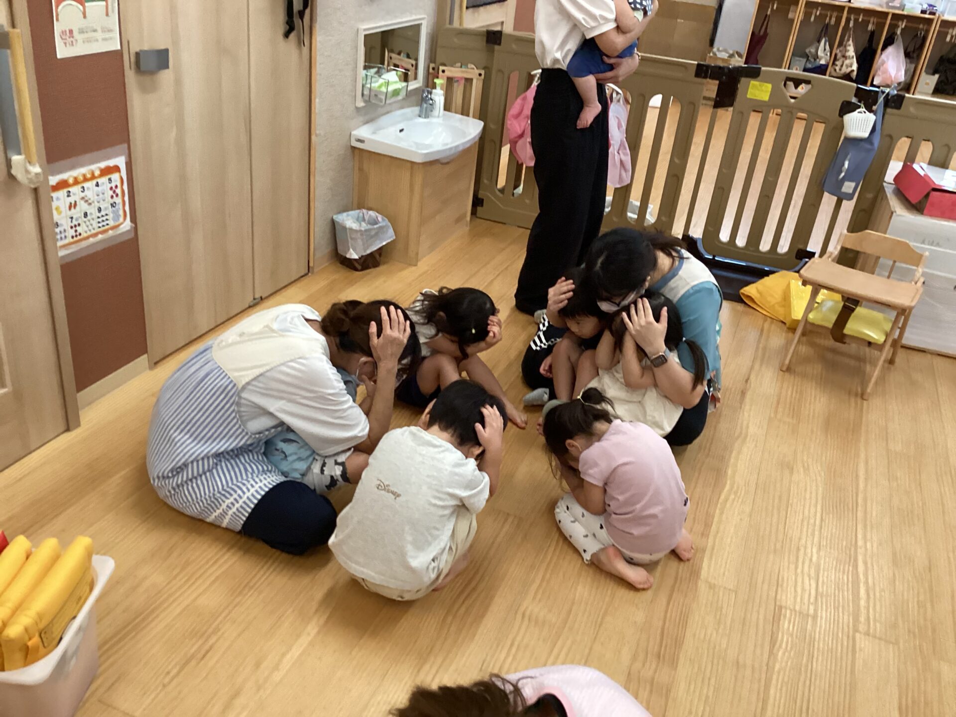 保育者の「地震です!先生の所に集まって下さい!」という声を聞くと、すぐに担任の先生のところに集まることが出来ていました。