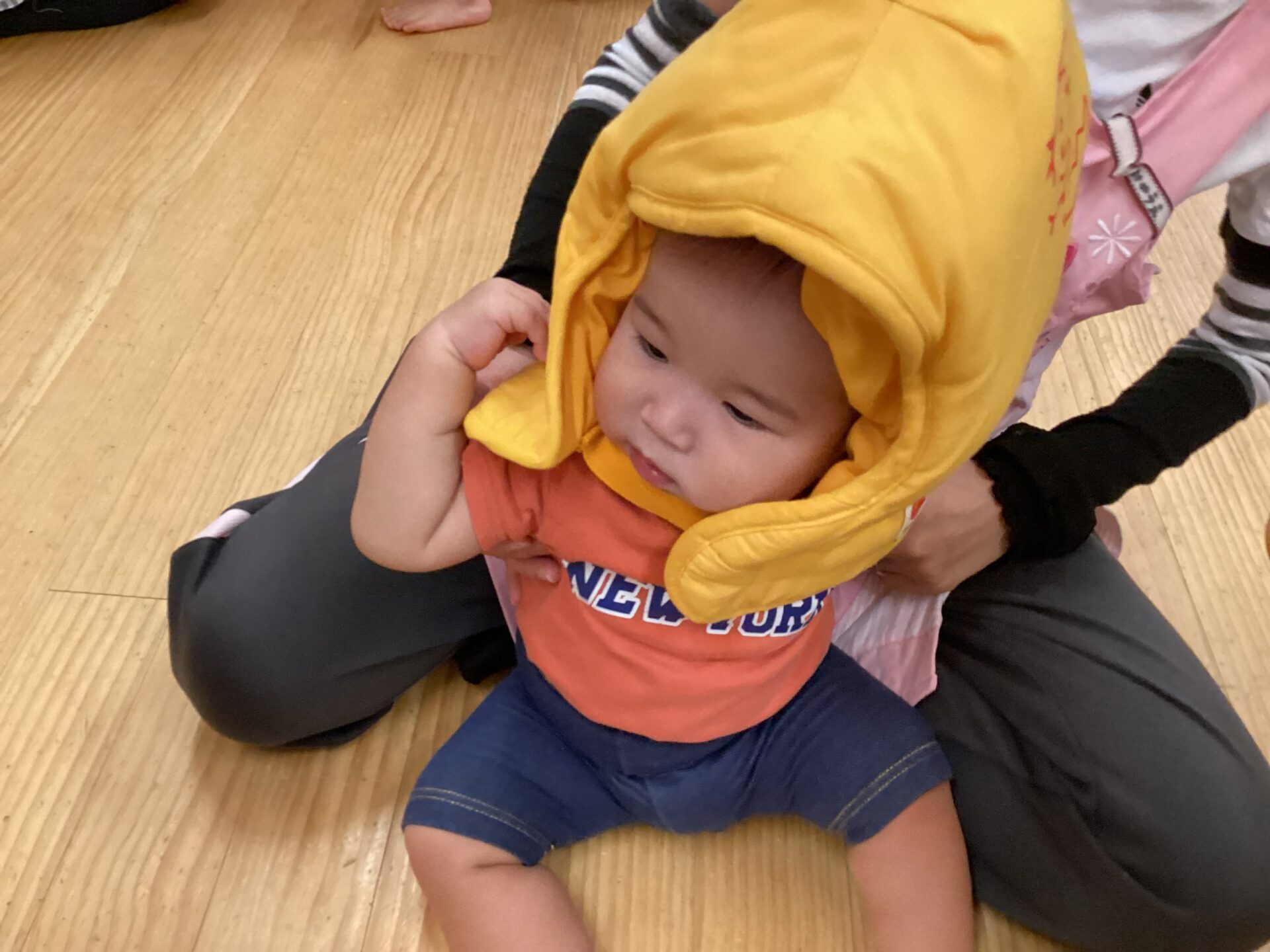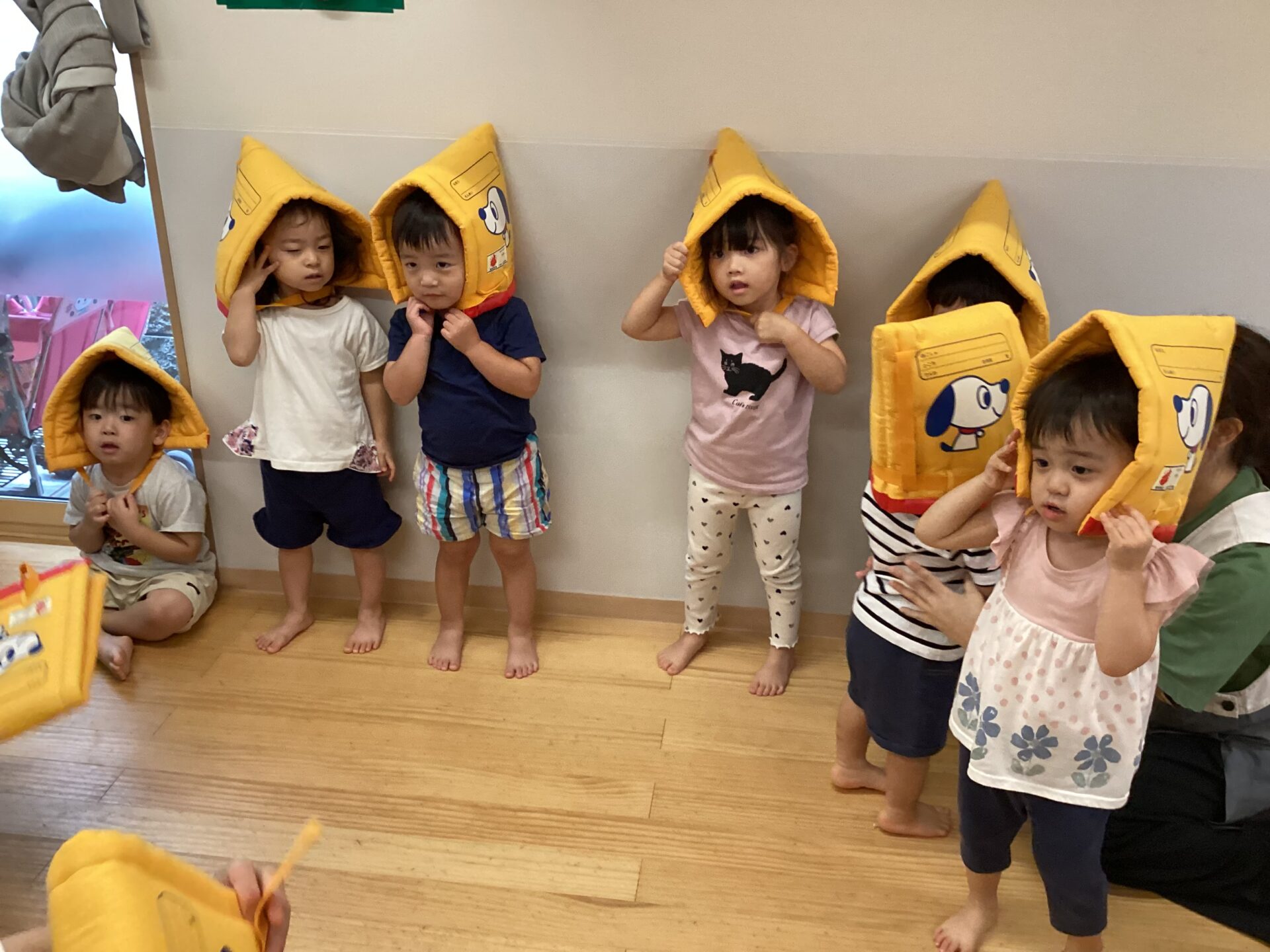 初めて防災頭巾をかぶるお友だちもいましたが、しっかりとかぶることが出来ました。