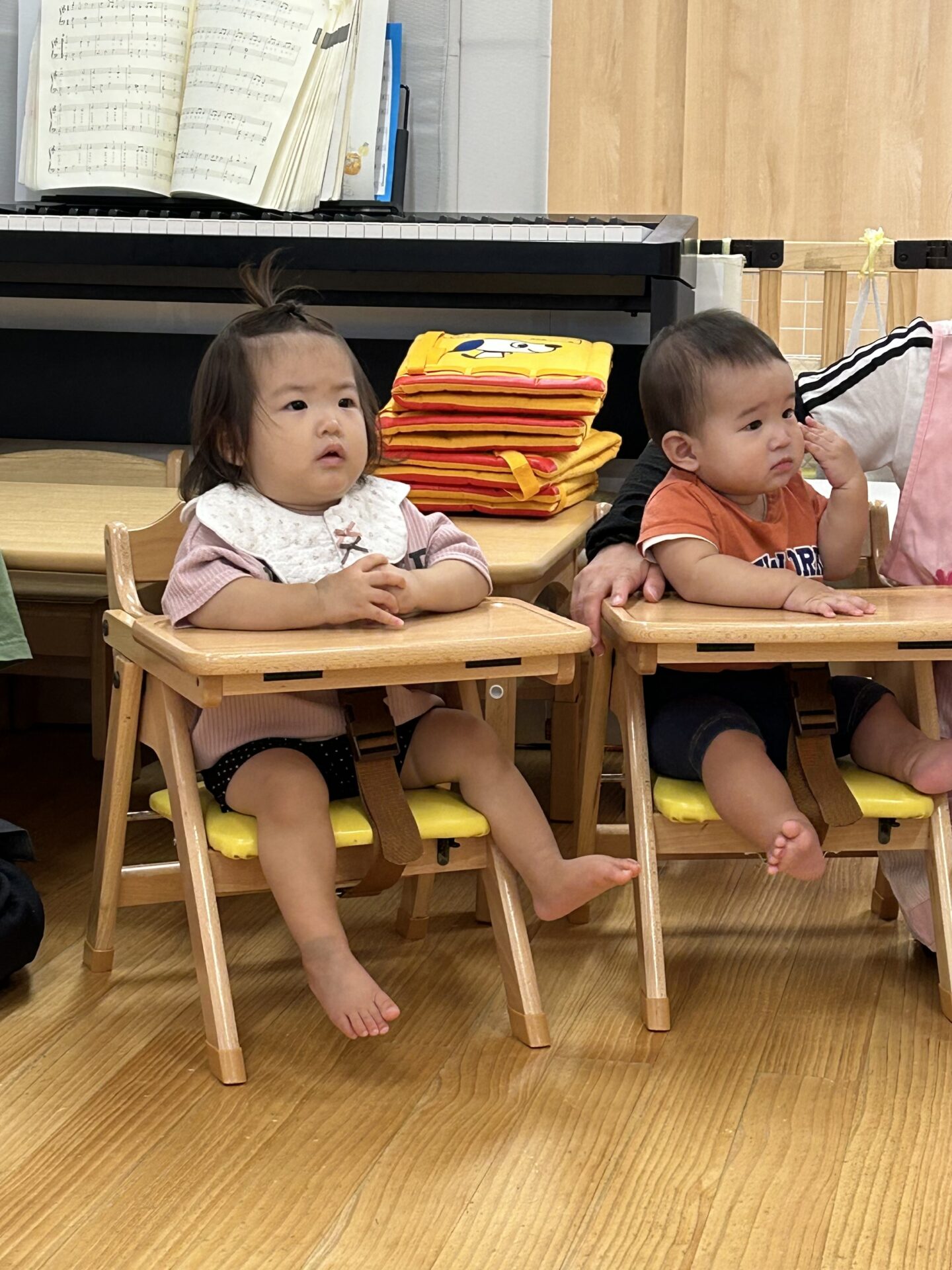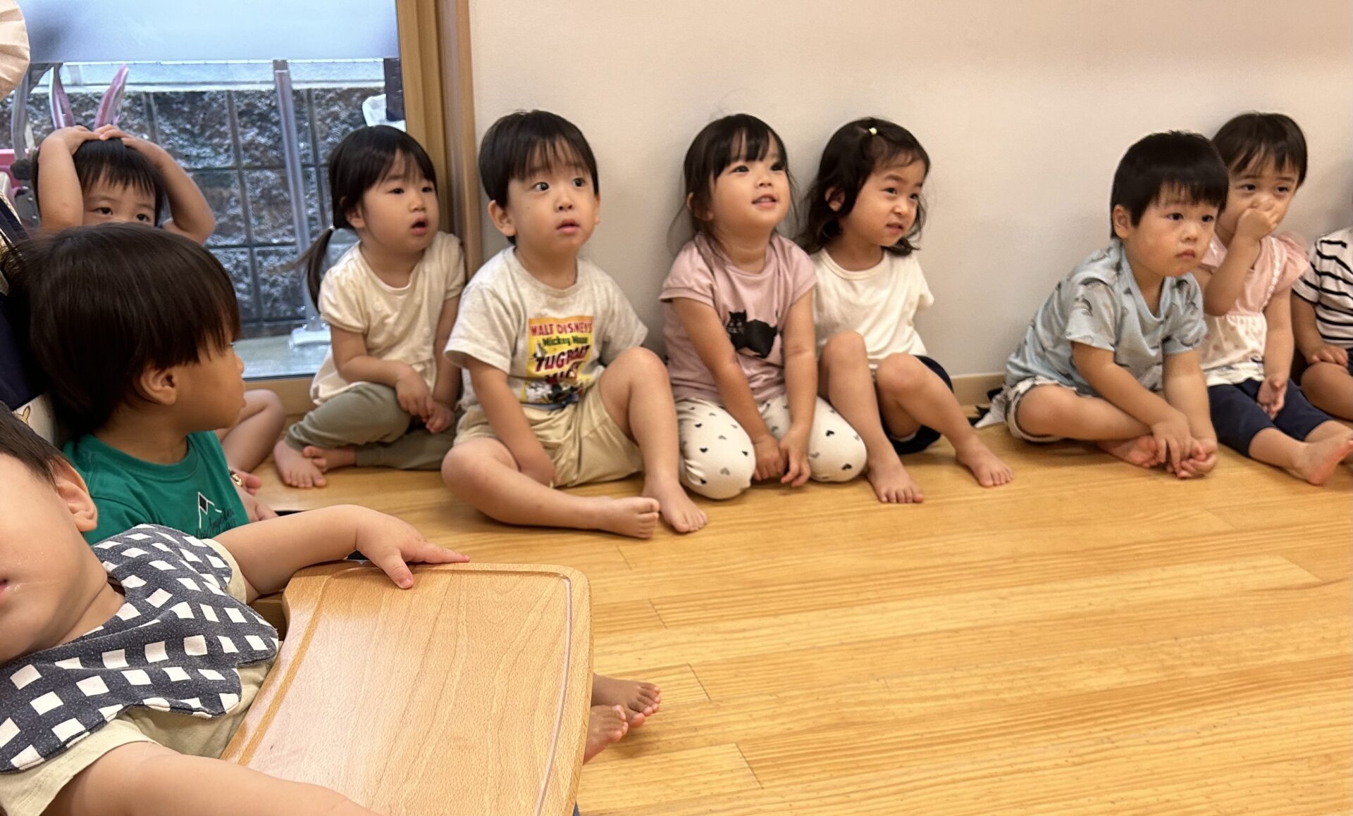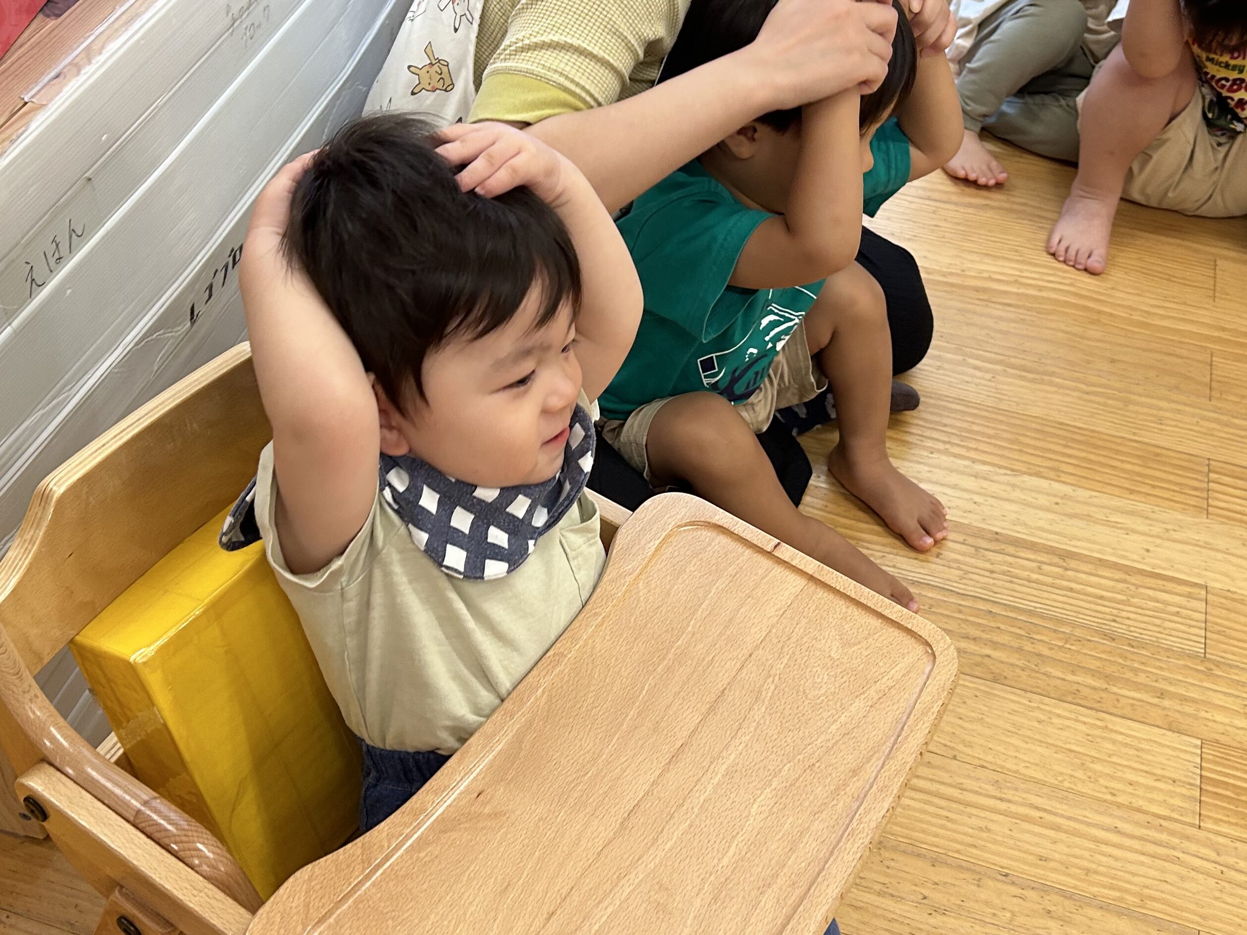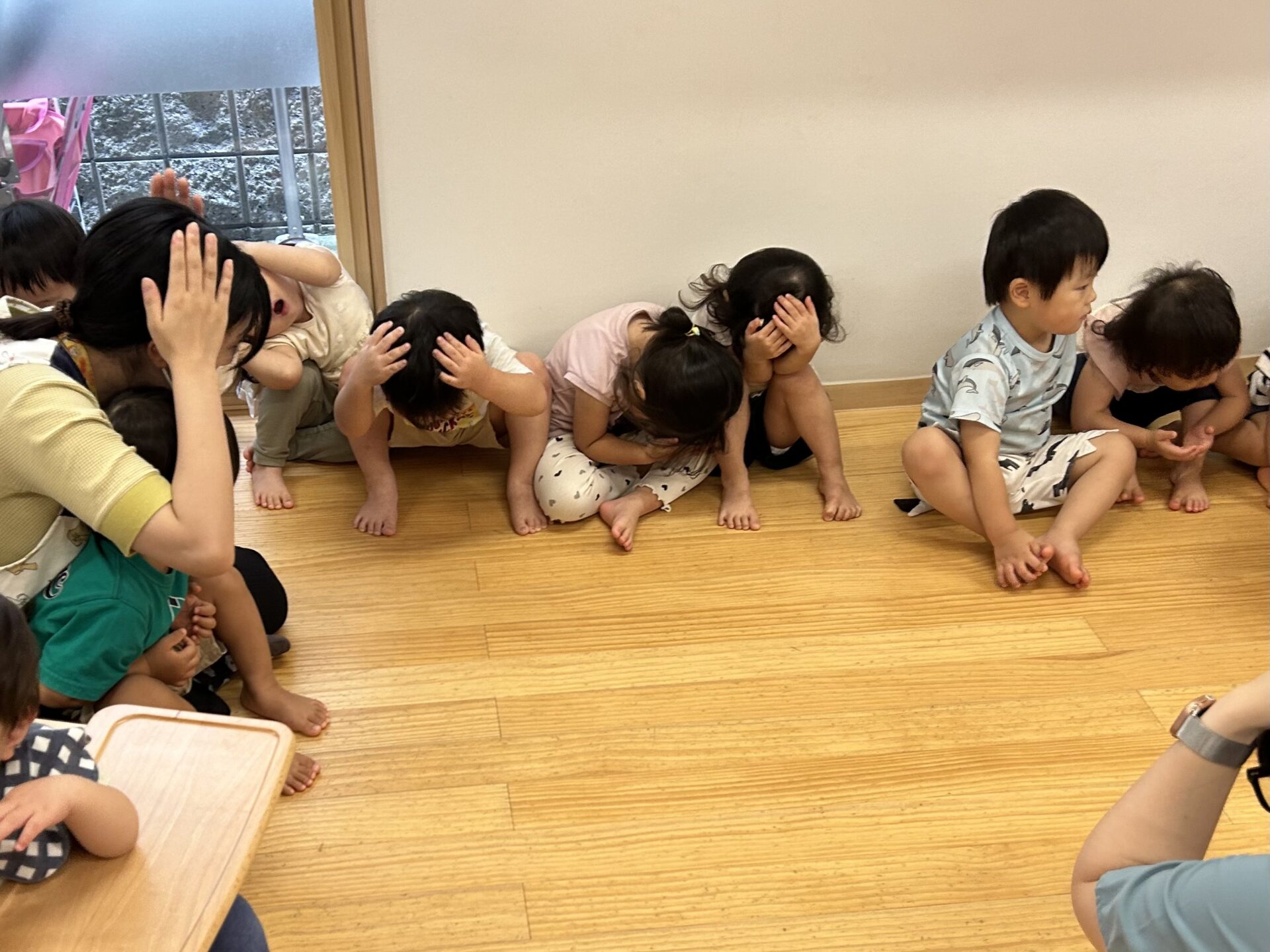 あめ・だいち組さんがとっても上手に「ダンゴムシポーズ」を行っていると、それをジッと見ていた、うみ組のお友だちも模倣して、ポーズを取ることが出来ていました。