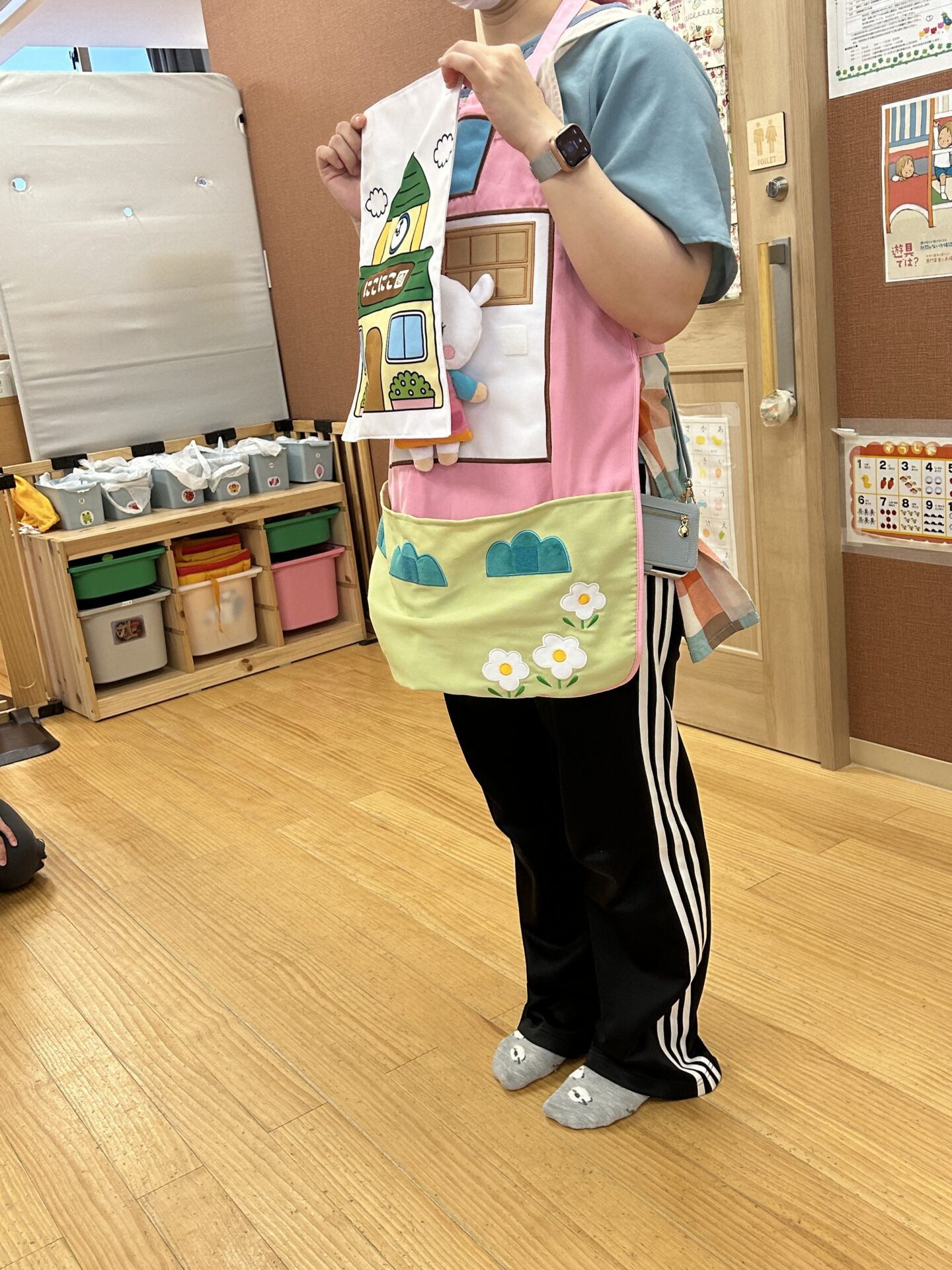 朝おやつを食べた後、あめ組のクラスに集まり、まずは保育者のエプロンシアターを観ます。