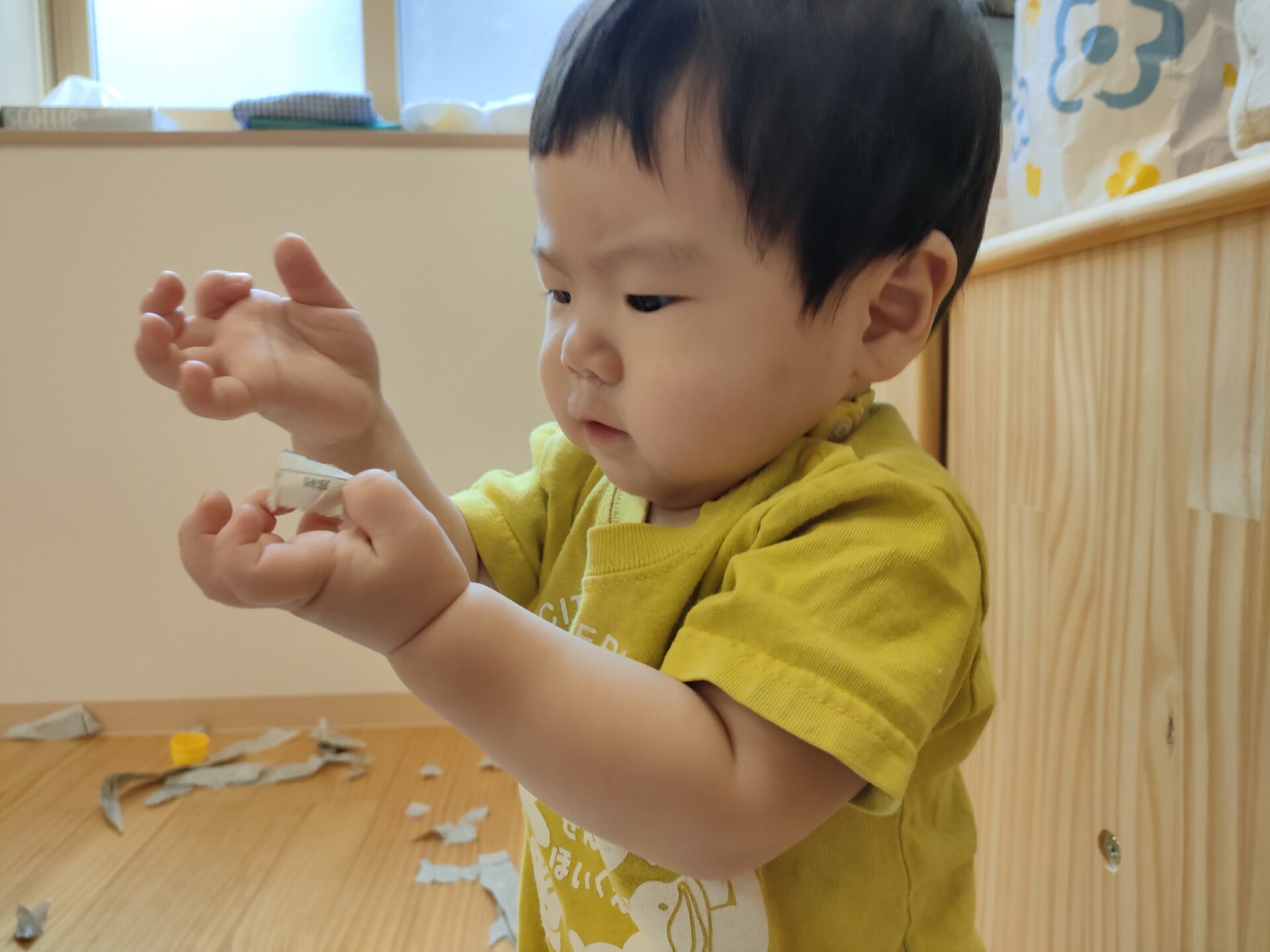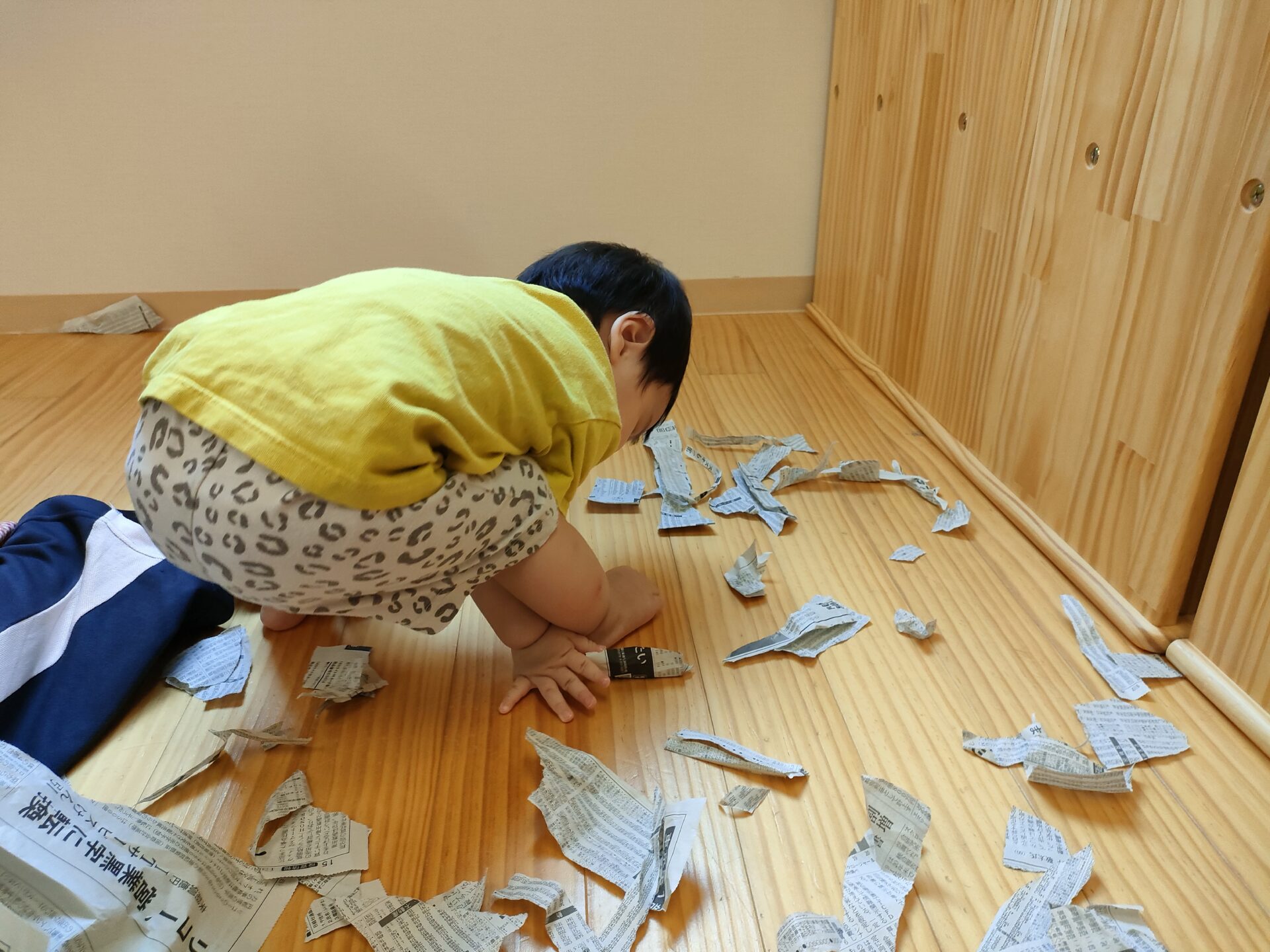 別の日には、新聞紙を使い、ちぎり紙をしました。一生懸命引っぱったり、少し切り目を入れて渡すと、指先を使い上手にちぎることができていました。