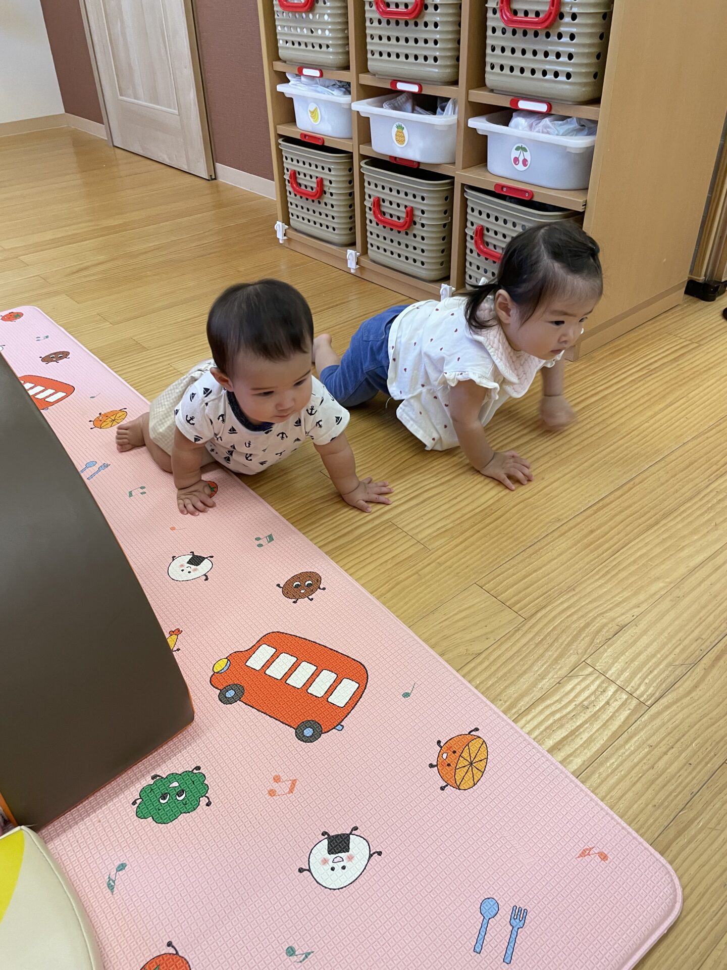 1人歩きができるようになったお友だちをハイハイで追いかけ、みんなで追いかけっこを楽しんだり、一緒に車を走らせたりと、お友だちとの関わりも増えました。