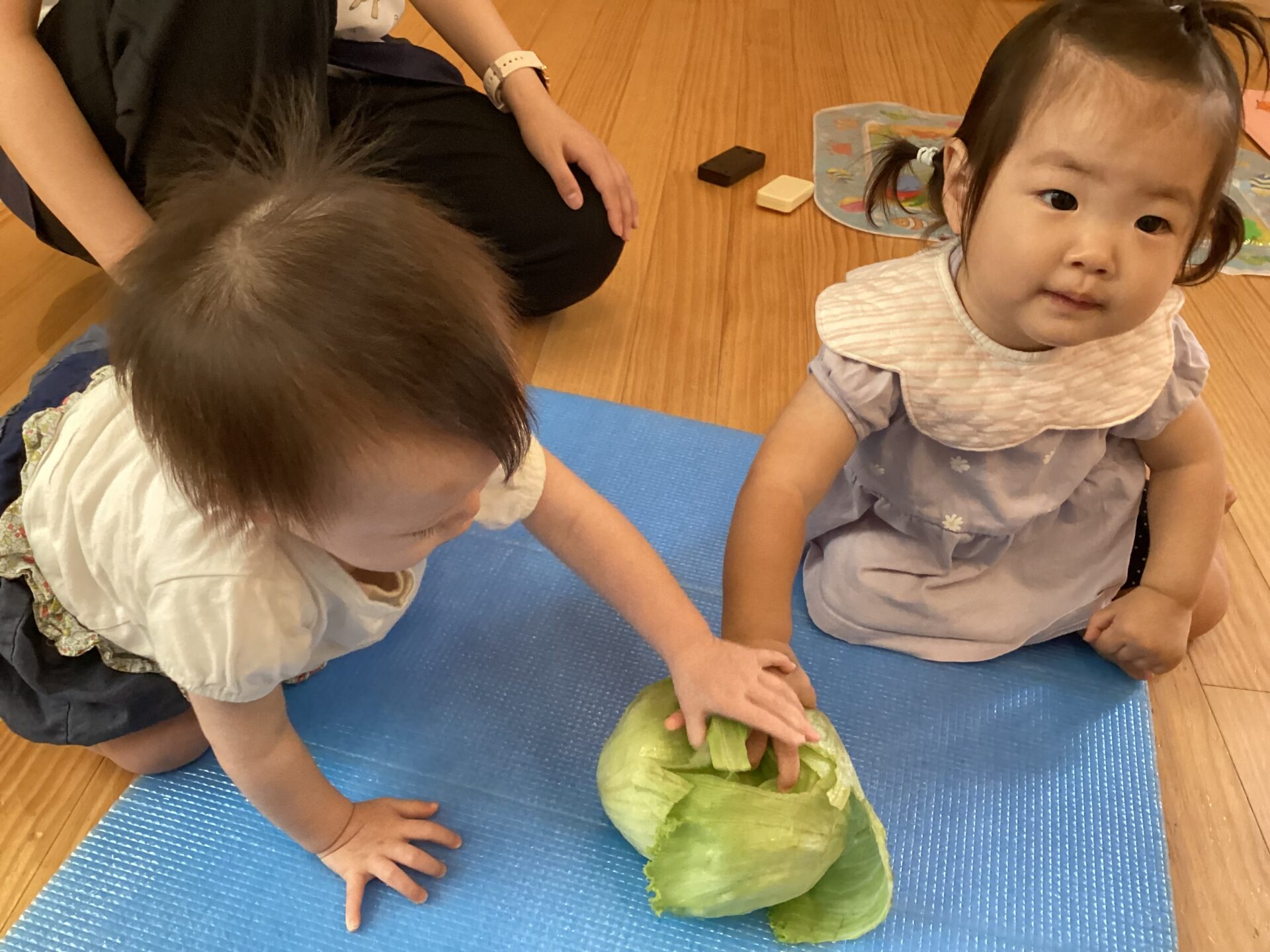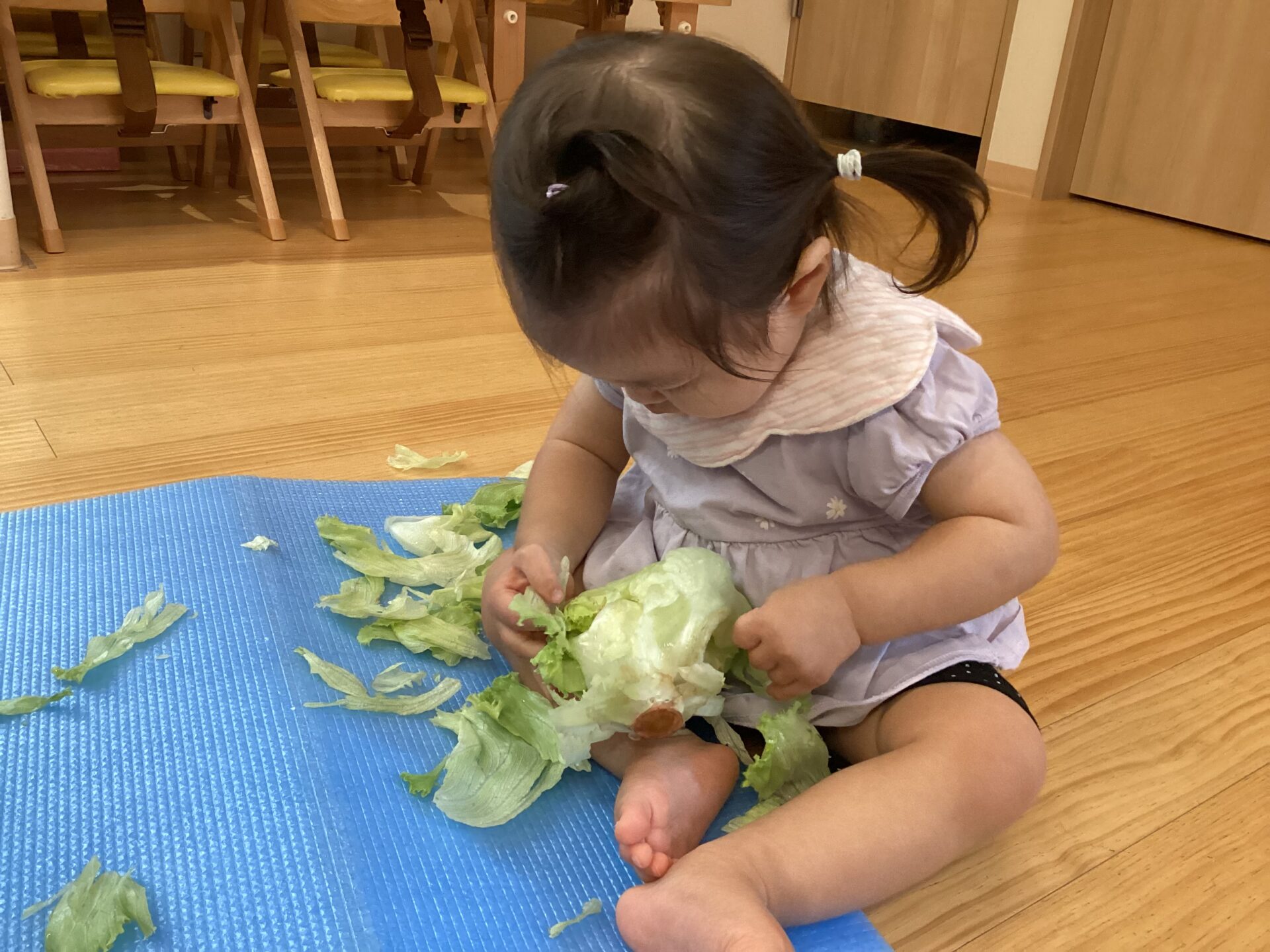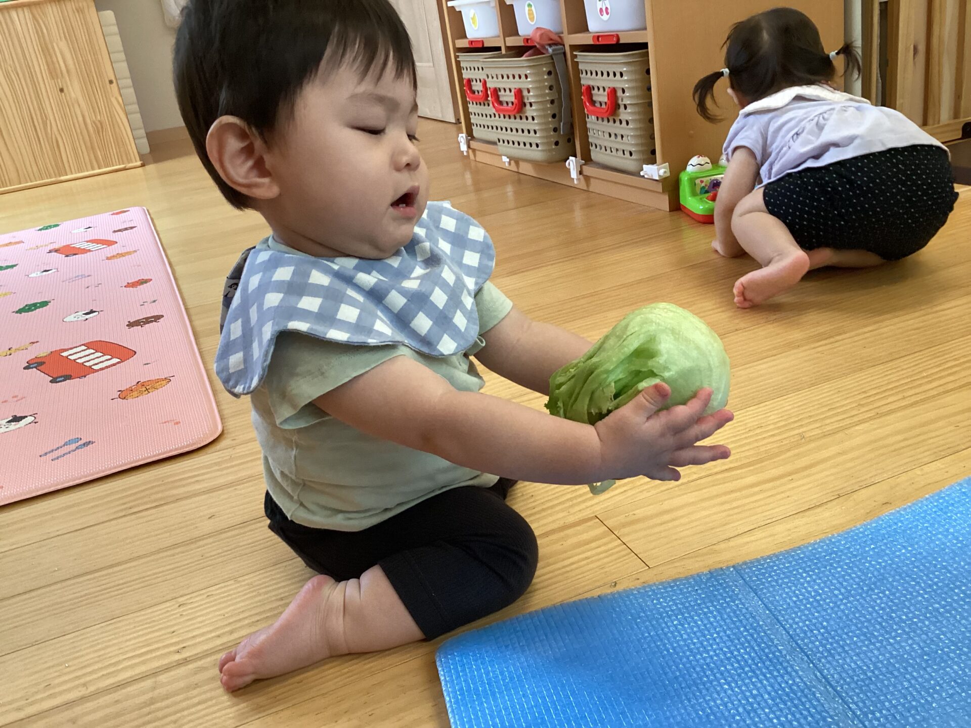 レタスを見せると、じーっと見ていたので、保育者が触ってみると、興味をもったお友だちは、手を伸ばし、触り始めていました。