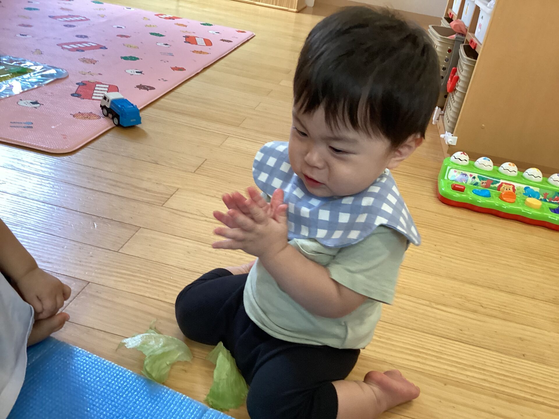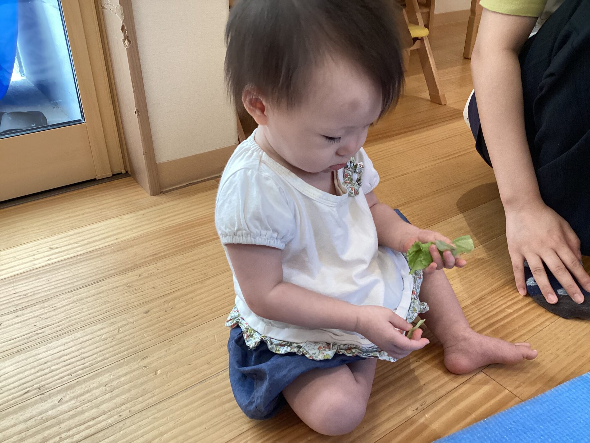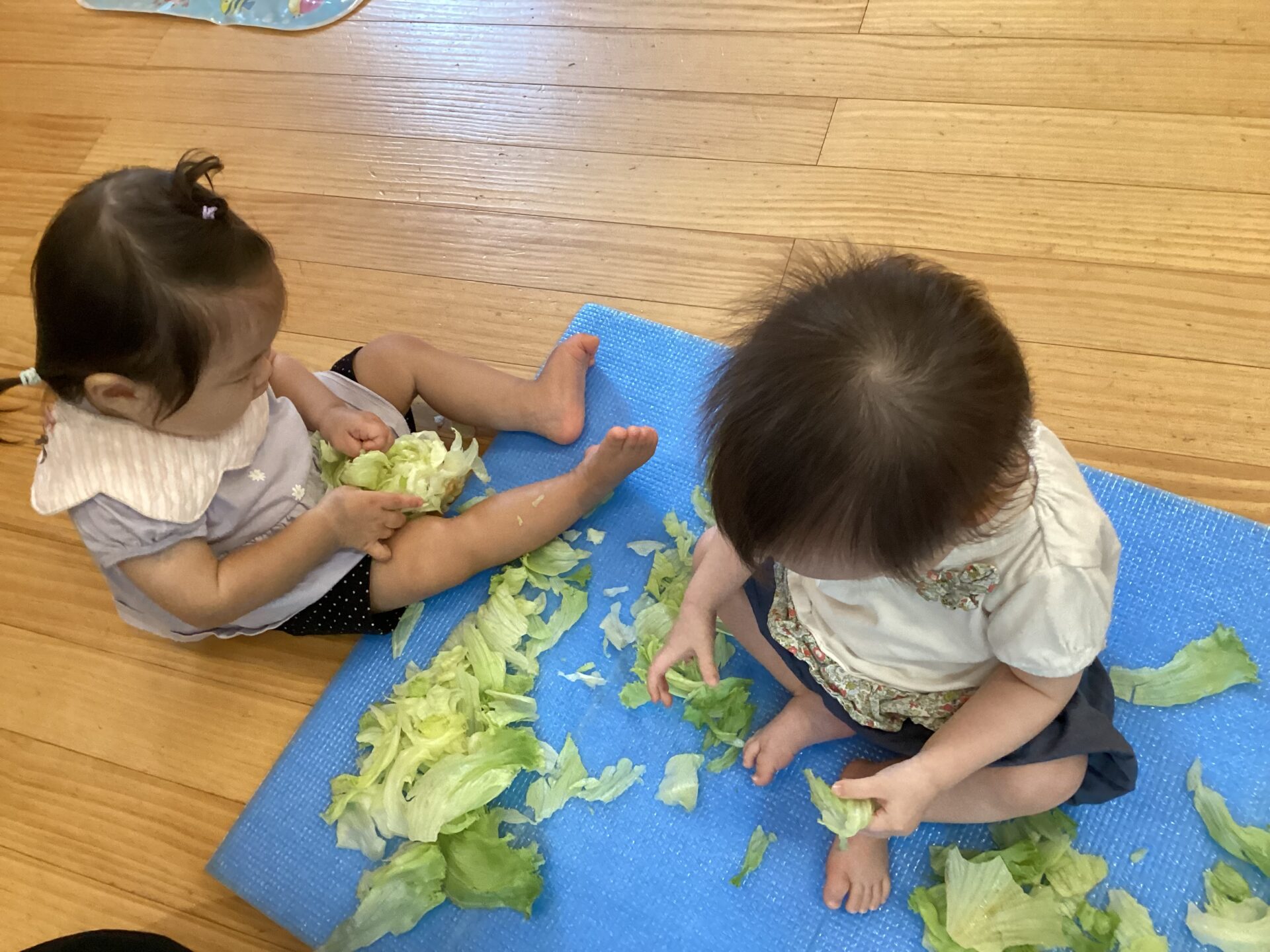 レタスを見せると、じーっと見ていたので、保育者が触ってみると、興味をもったお友だちは、手を伸ばし、触り始めていました。