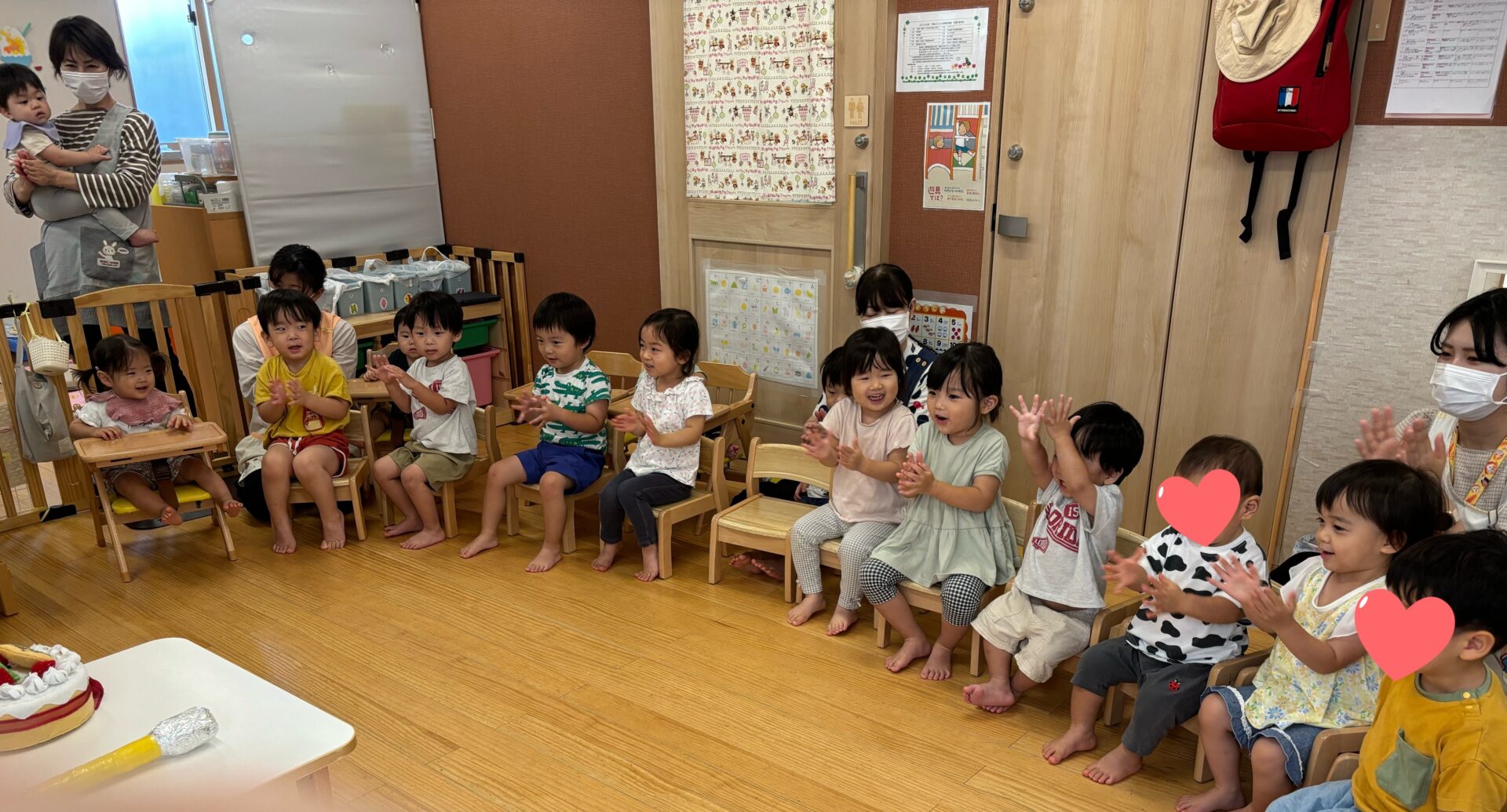 おやつを食べた後、全クラスがあめ組のお部屋に集まり、誕生日会がスタートです。