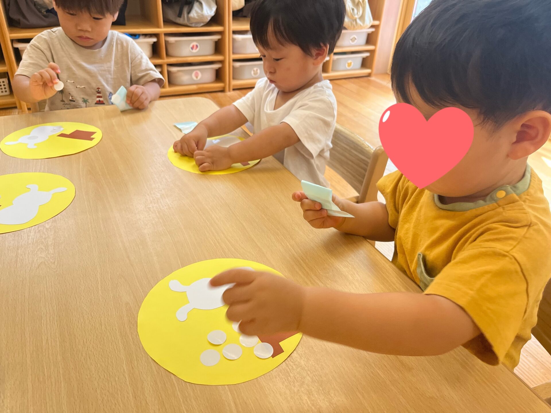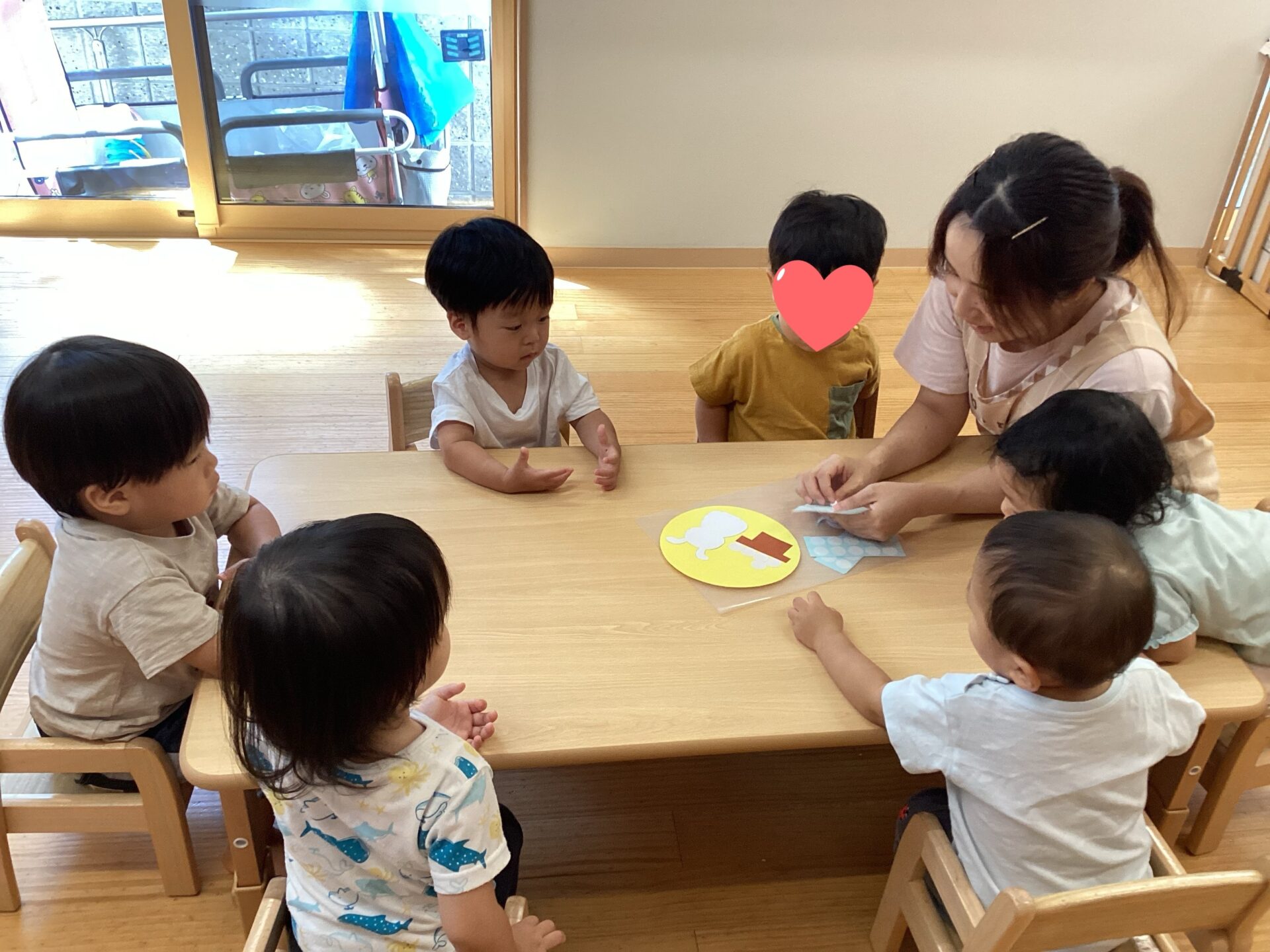 みんな保育者の手元を覗き込み、「なるほど、こうやって貼るんだな…」と表情は真剣そのものです👀