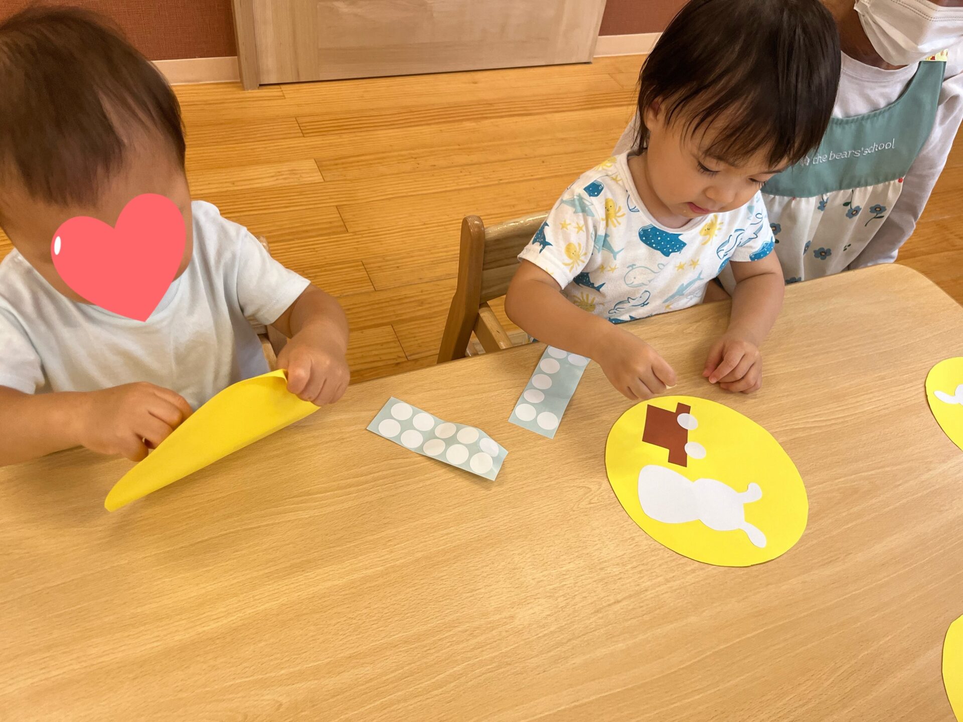 保育者の見本を思い出しながら同じように並べて貼ってみる子、
