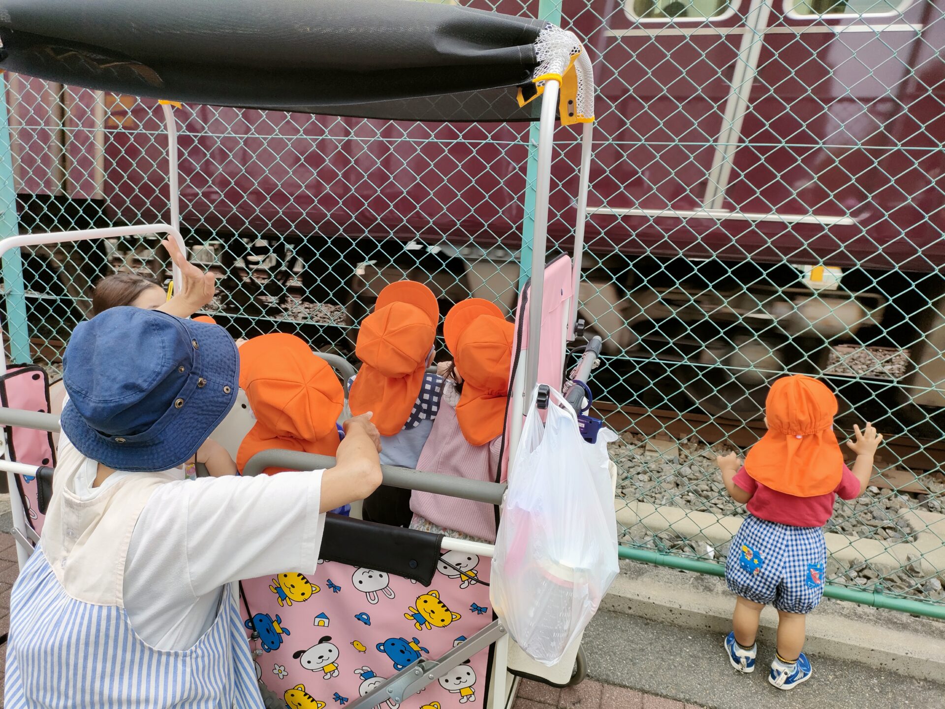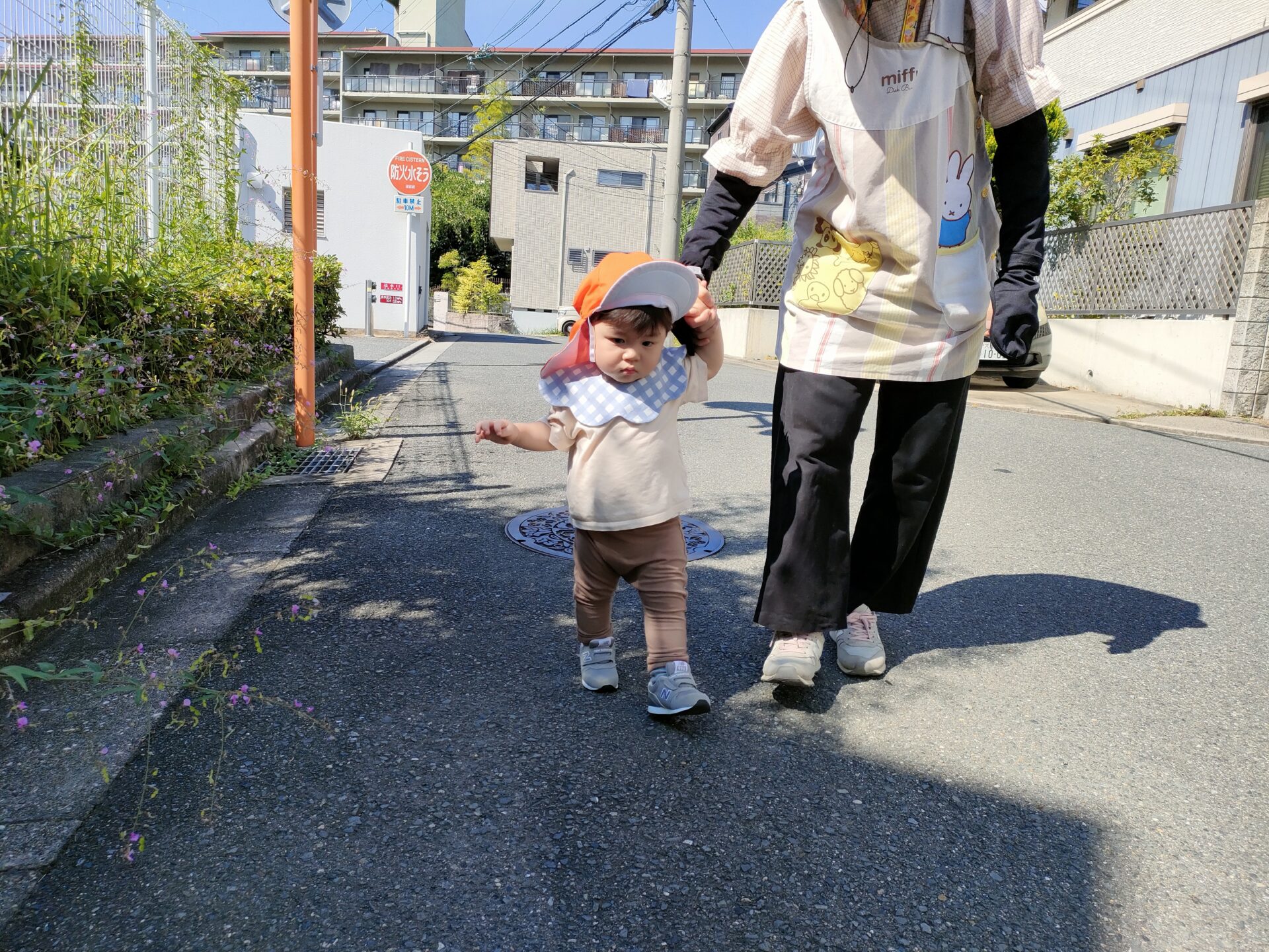 散歩道で保育者と手を繋いで歩くことにも挑戦すると、手を離さず、1歩1歩、しっかりと歩いていましたよ。